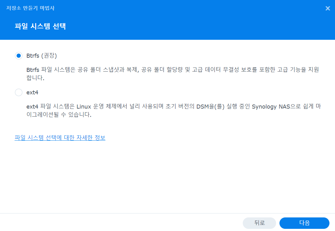 파일 시스템은 Btrfs로 설정했습니다. 이는 플러스 모델에서 지원하는 시스템인데 백업할 때 더 유용하다는 거 같아요. 하지만 솔직히 일반 사용자 입장에서는 얼마나 좋은지 잘 모르겠더라고요. 유튜브 봐도 다 외국 설명이라 패스..