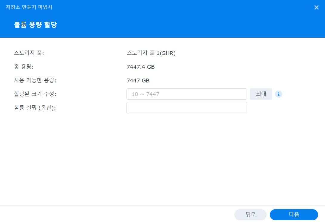사용 환경에 따라 볼륨을 구분해서 운영할 수 있겠지만 저희 집에서는 굳이 나눌 필요가 없을 듯하여 하나의 스토리지풀에 하나의 볼륨으로 만들었습니다.