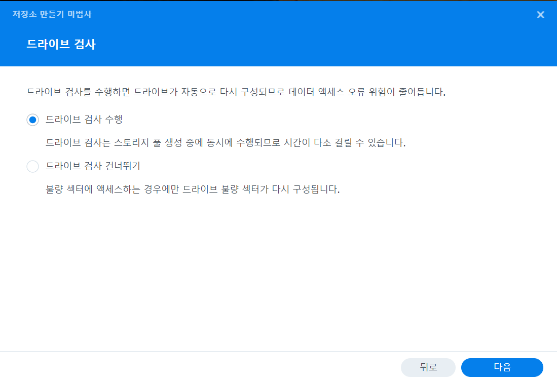 윗단계에서 설정했던 드라이브 검사를 진행합니다. 검사를 하면서도 읽기/쓰기가 가능하더라구요. 일단 검사하면서 기본 세팅들을 설정했습니다.