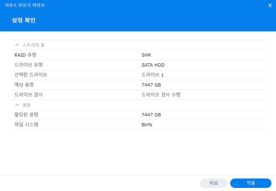 현재는 8 테라 HDD 1개만 설치되어있지만 기존의 HDD 2개를 추가 설치할 예정이라 우선 SHR RAID로 설정해서 만들었습니다.