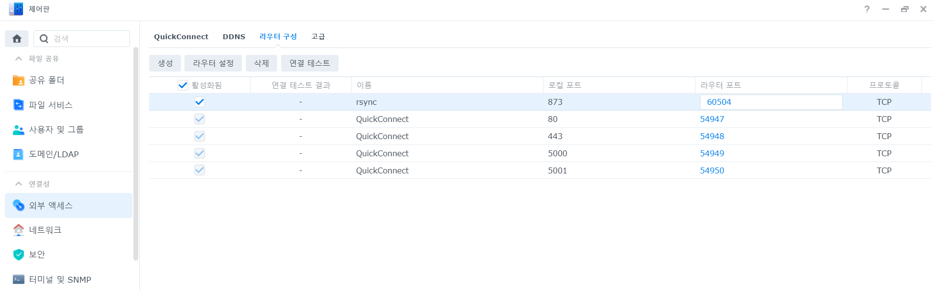 이후 서비스를 이용하기 위한 포트포워딩을 해줘야 합니다. [제어판] - [외부 액세스] - [라우터 구성] 에서 생성 버튼을 누르고 rsync 서비스를 찾아서 등록해줍니다. 저 같은 경우 라우터 포트가 60504로 되어있네요.