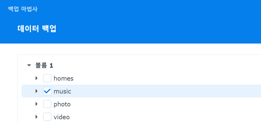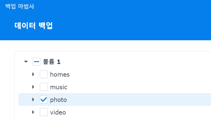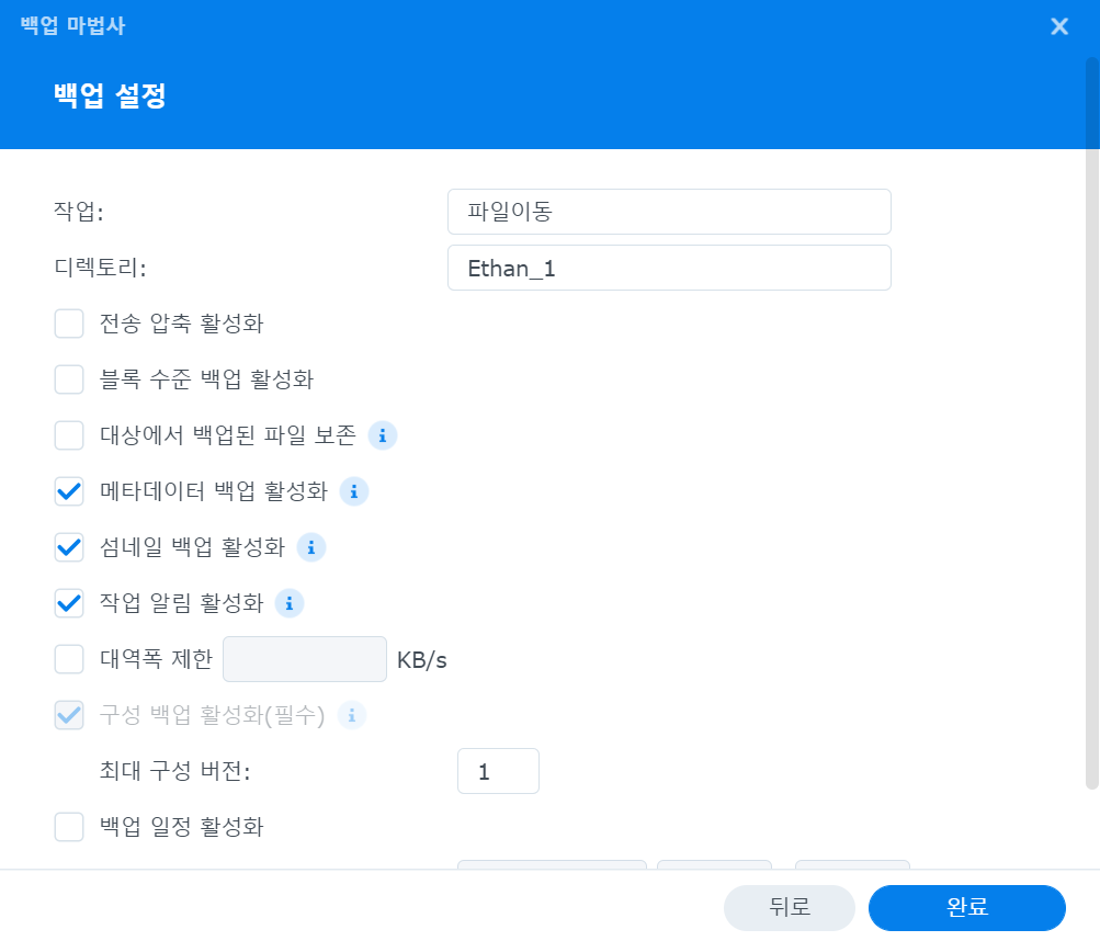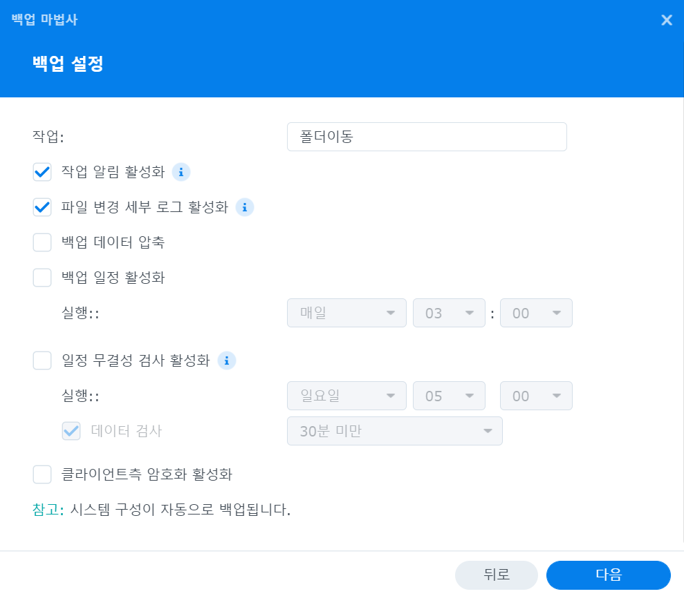 기존 나스 중 어느 폴더를 백업할지 설정한 뒤 어떠한 구성으로 백업을 할지 결정합니다. 저 같은 경우 기존 나스에서 신규 나스로 백업을 1회만 하면 되는 사항이라 백업 일정들을 비활성화시켰습니다.