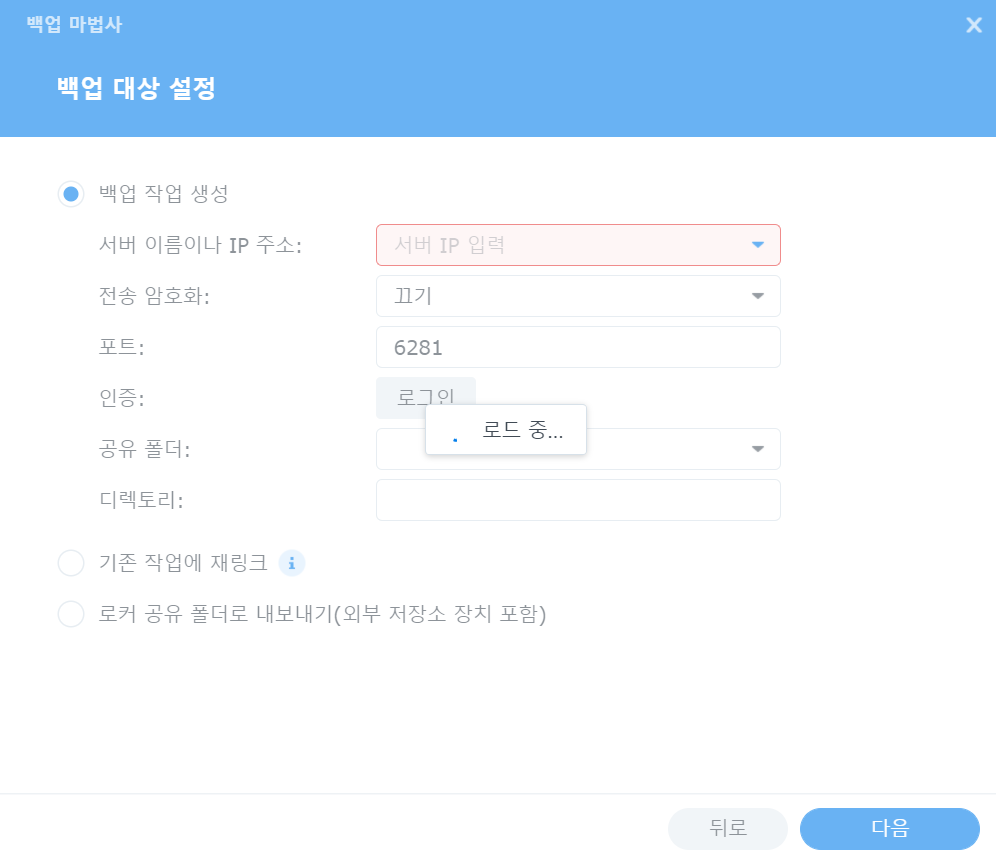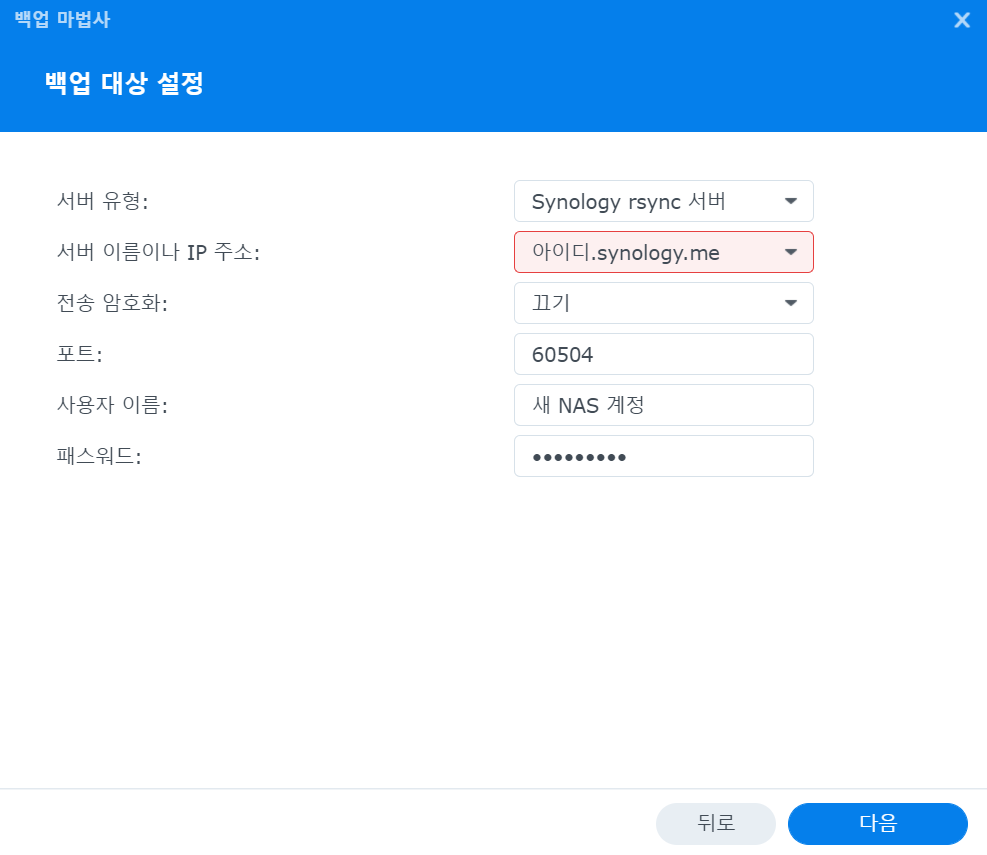 서버/IP주소 적는 곳에 내부 IP주소(192.168.0.x)를 적으면 인터넷 영향을 안 받게 됩니다. 예를 들면 계정.synology.me:5001 를 사용한다면 외부에서 접근하는 방법이라서 인터넷이 도중에 끊긴다면 백업도 멈추게 됩니다. 혹시나 하는 마음에 인터넷이 끊겨도 내부망으로 데이터를 이관할 수 있도록 내부 IP 주소를 이용했습니다.