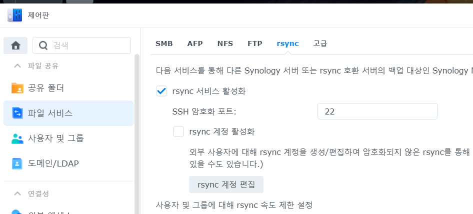 rsync 백업에 앞서 제어판에서 서비스를 활성화해줘야 합니다. [제어판] - [파일 서비스] - [rsync]에서 활성화를 합니다.
