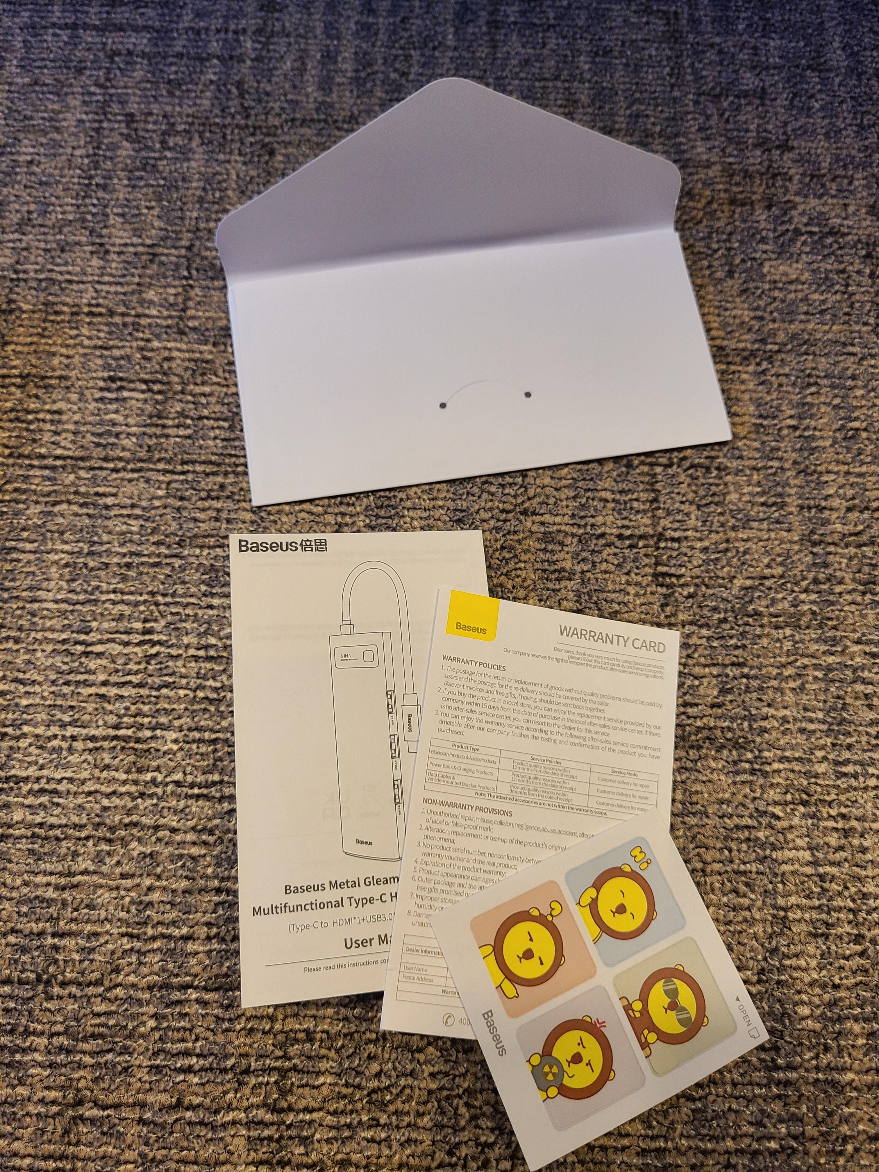 구성품은 매우 심플해요. 뭐 복잡하게 있는 게 더 이상하지만.. Baseus 제품 사면 항상 들어있는 호랭이? 스티커도 들어있고 간단한 설명서가 들어있네요.