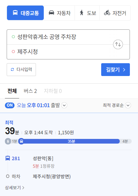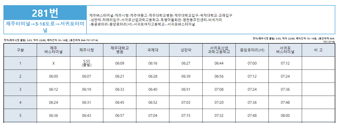 둘 다 제주시청 앞 정류장에서 타는 건 동일하지만 시간이 조금씩 다르니 제주버스정보시스템에서 시간을 꼭 확인해보고 일정을 짜셔야 해요.