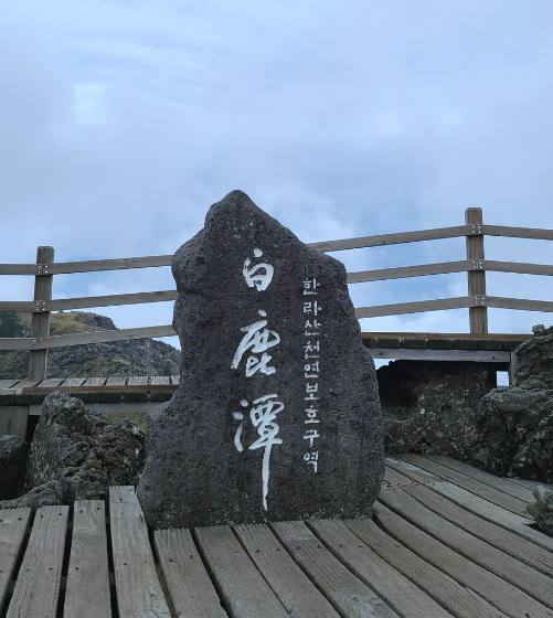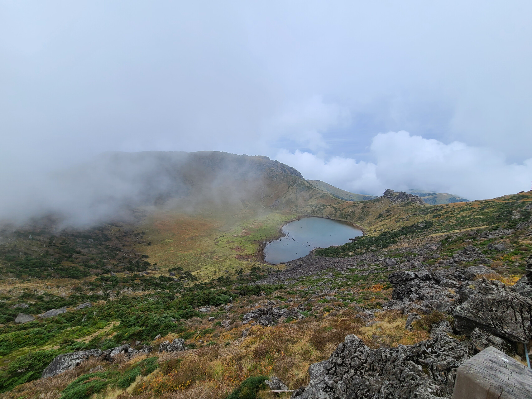 제가 등산한 날은 날씨가 흐린 날이라 백록담이 구름에 덮였다 개다 반복되는 날이었어요. 그렇다해도 여전히 멋진 건 변하지가 않네요. 이걸 보기 위해 새벽같이 일어나서 고생했다니.. 후회는 안 하지만 많이 힘들었다는..ㅠ