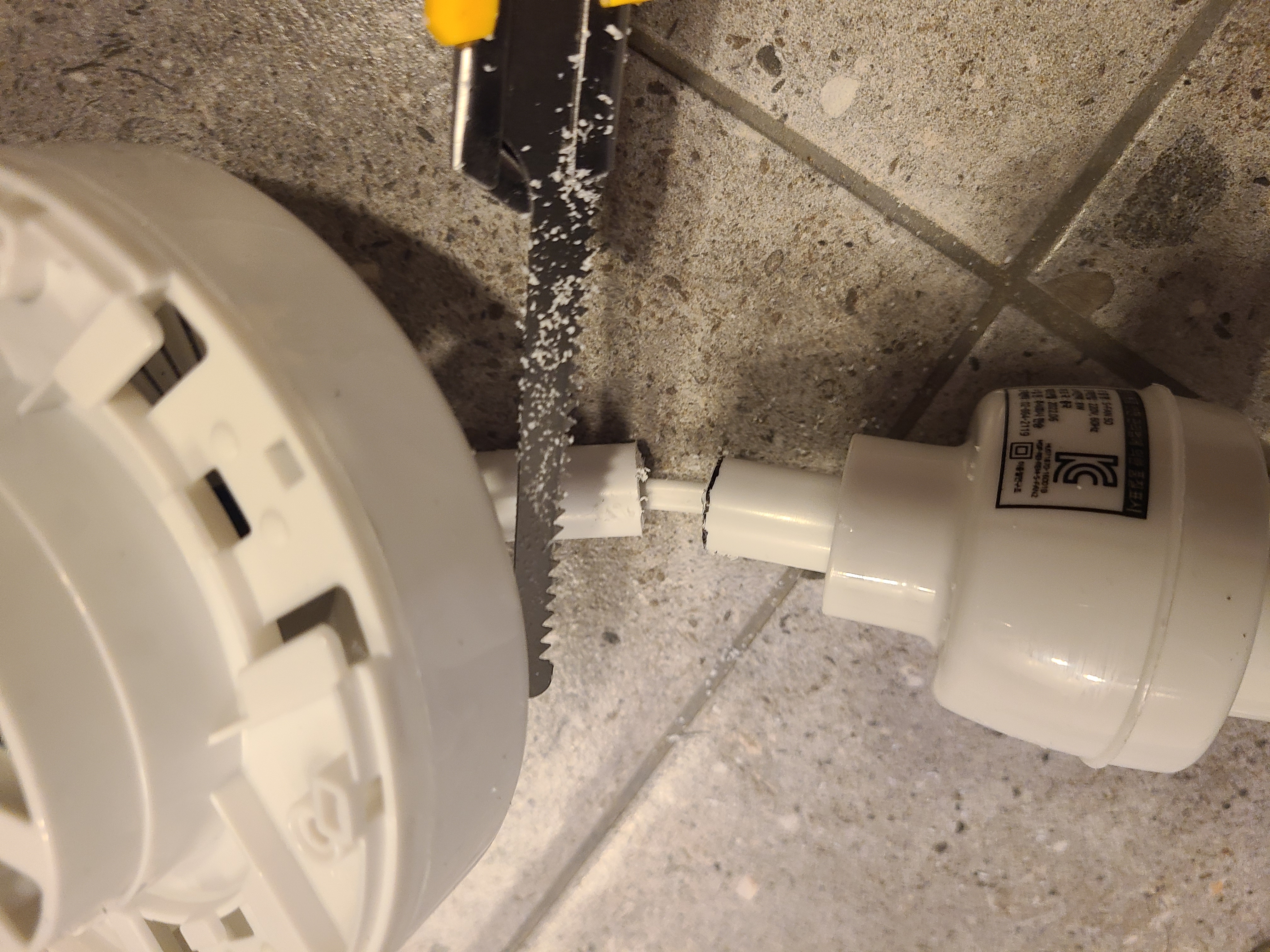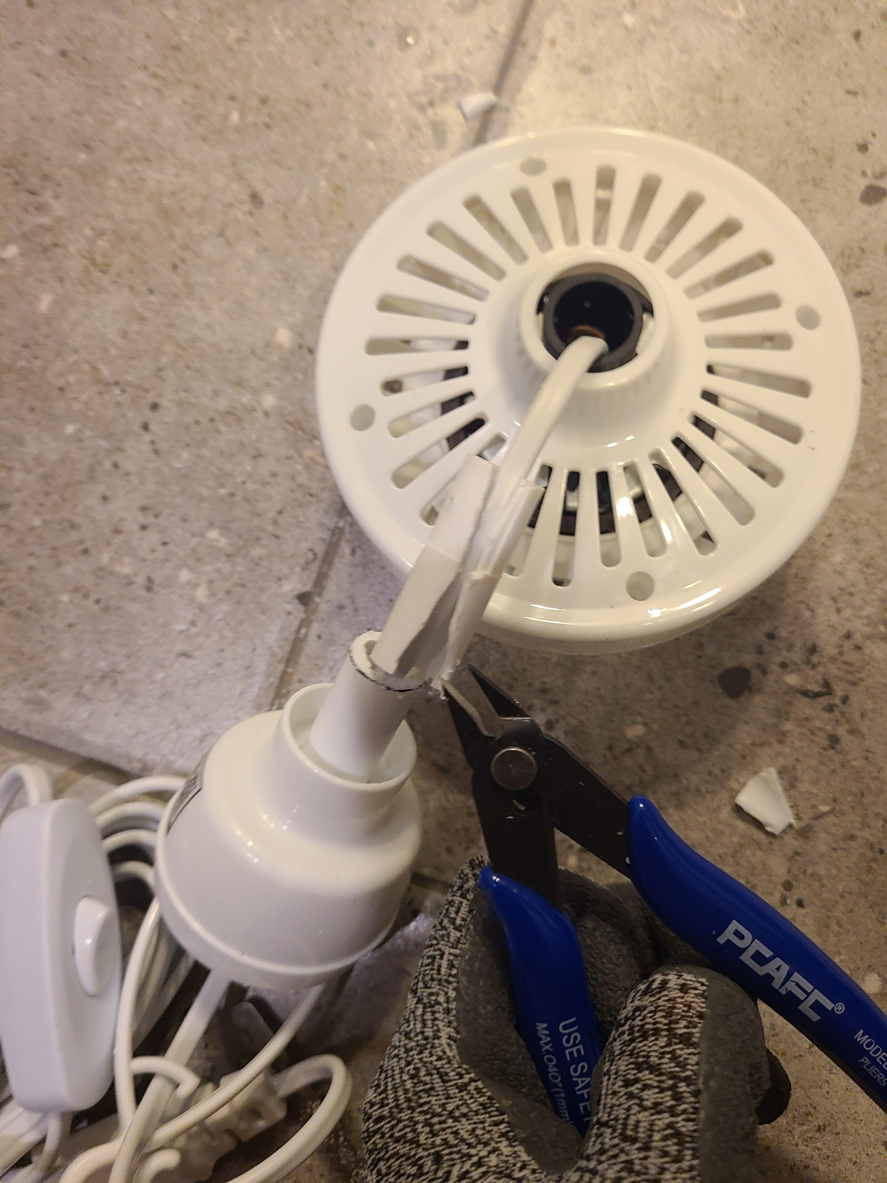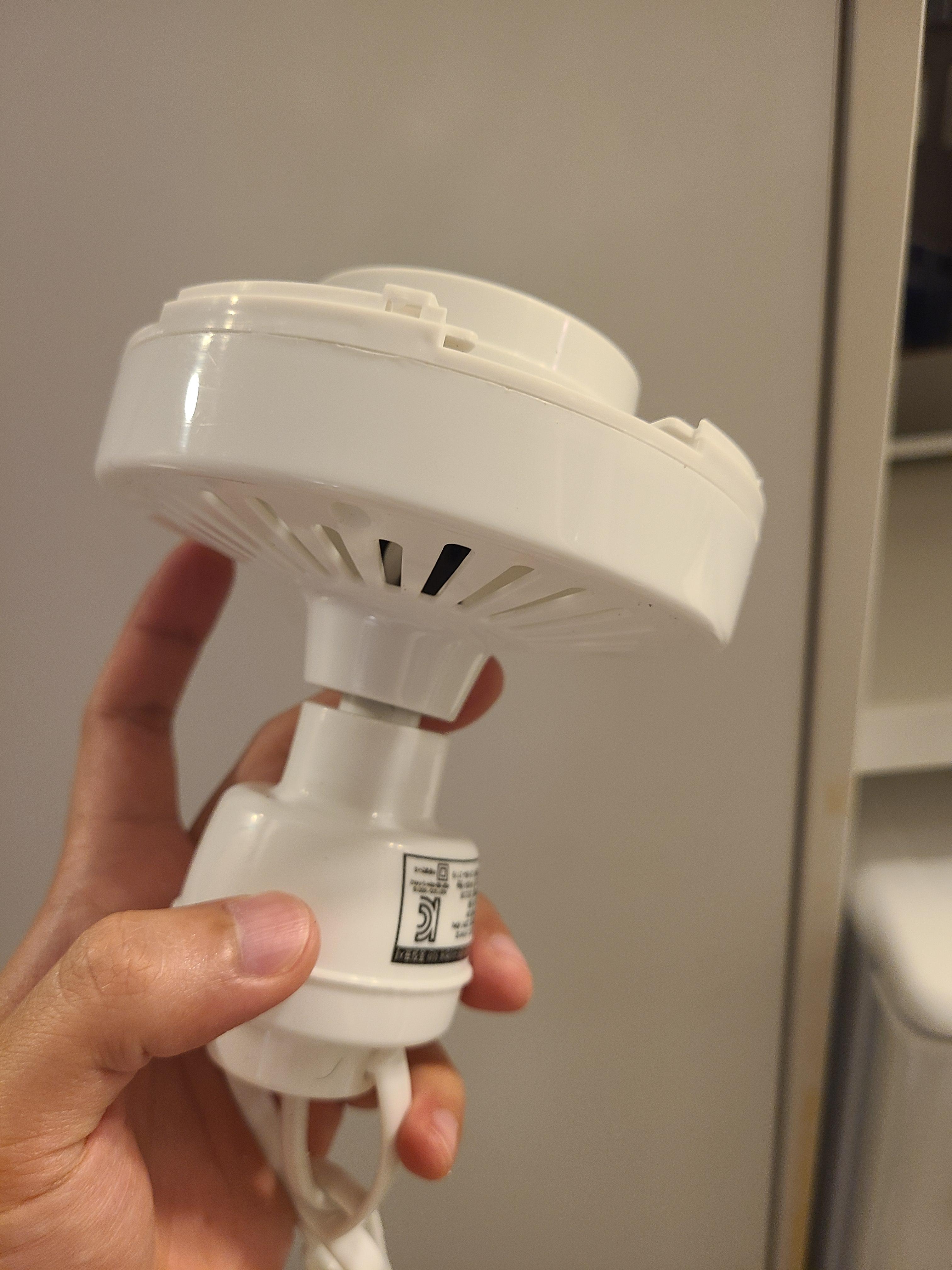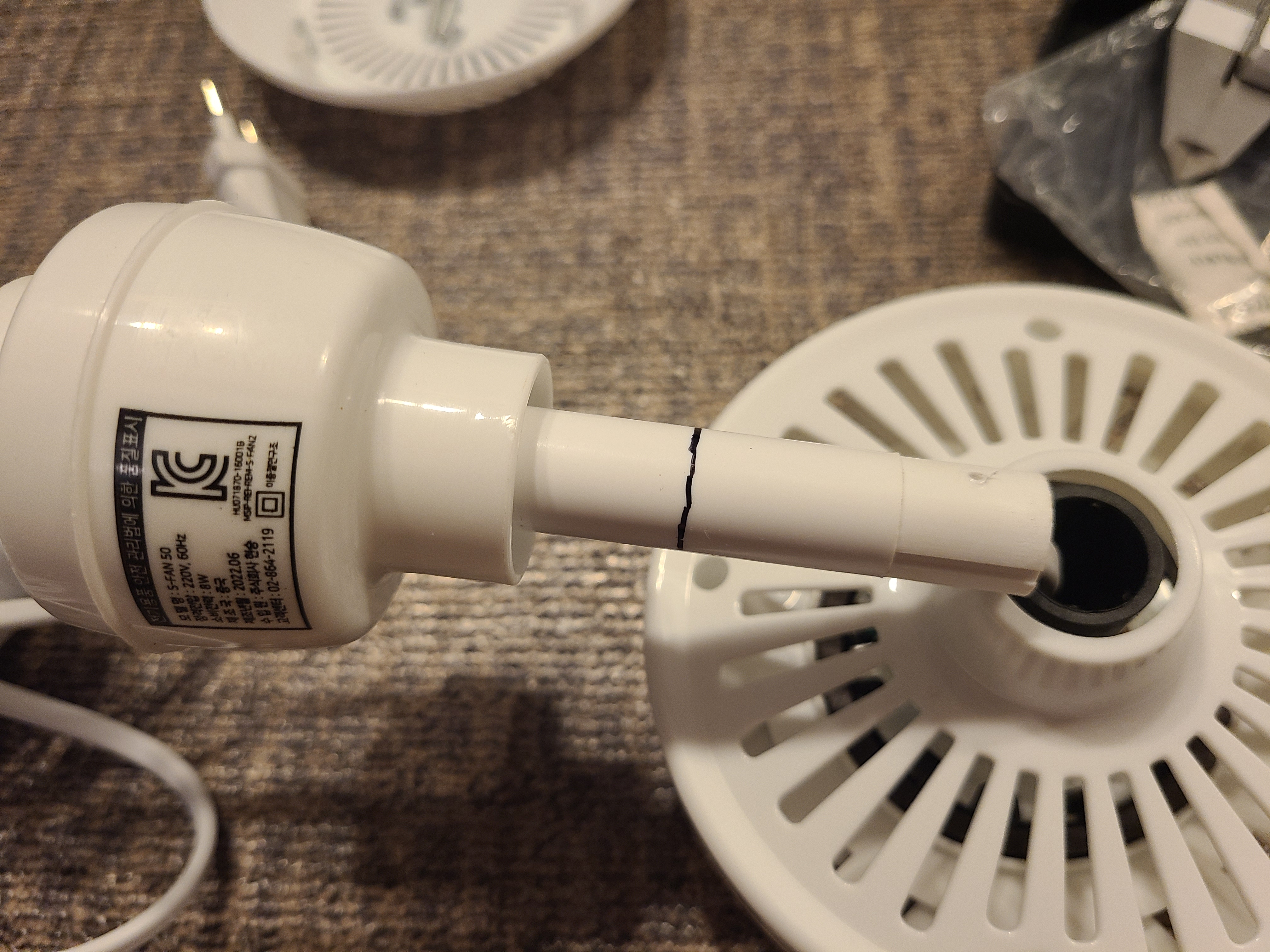 다행히 플라스틱이 약한 거라 톱으로 한 10번만 문질러도 속이 보이는 수준으로 잘렸어요. 여기서 주의해야 할 사항은 흰색 기둥 안에 전선이 들어있어요. 무작정 썰다가는 전선까지 함께 자를 수 있기 때문에 흰색 기둥 플라스틱만 자르도록 조심해야 합니다. 기둥을 돌려가면서 10번씩 문지르다가 거의 다 잘렸을 때 손으로 뽀-각 꺾어서 떼어냈어요.
