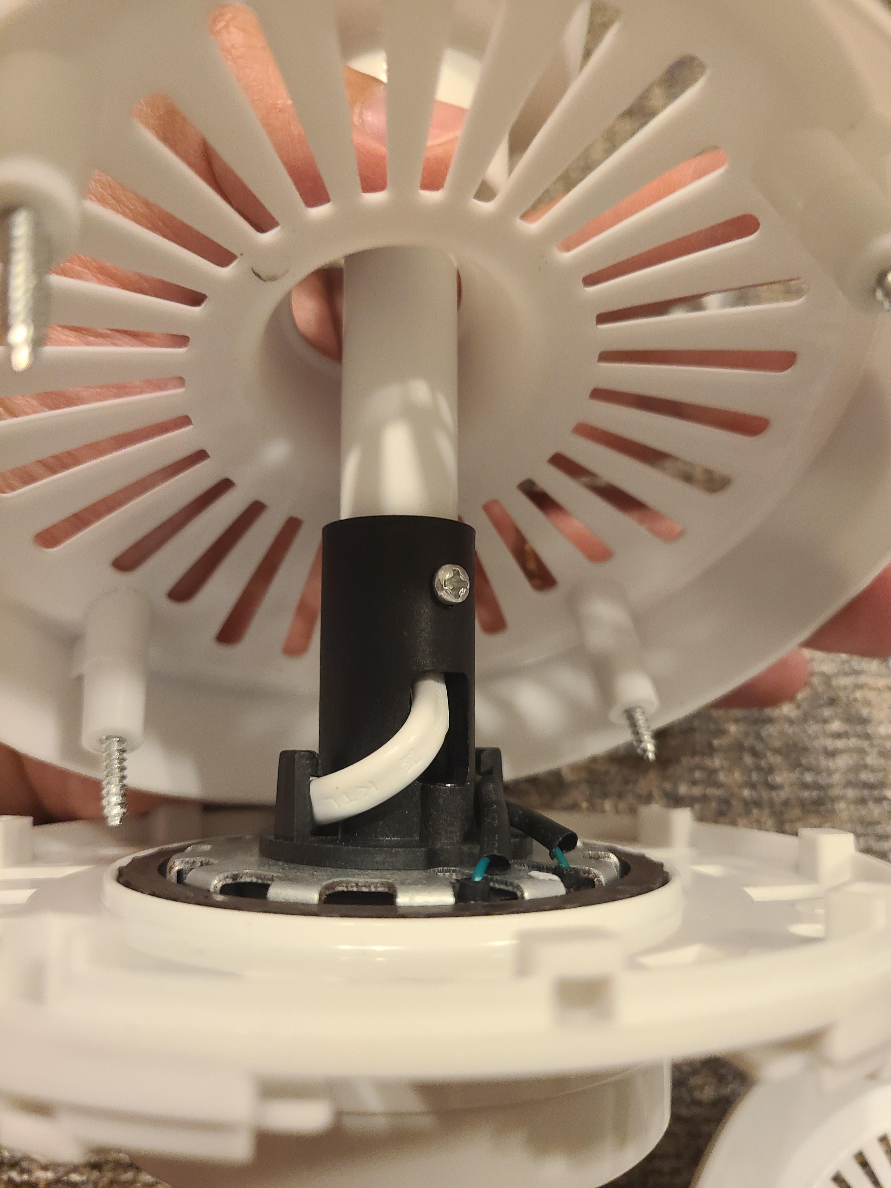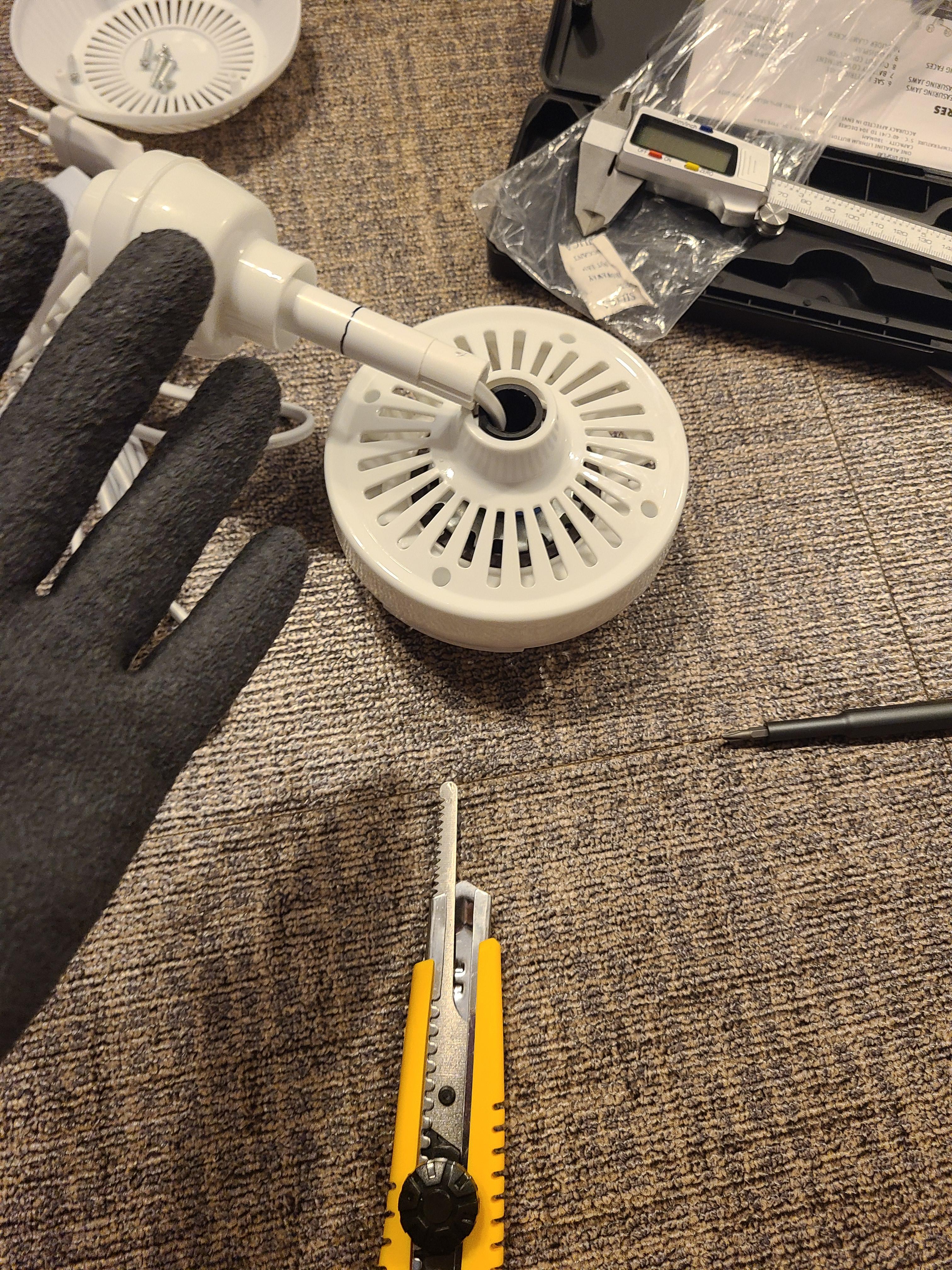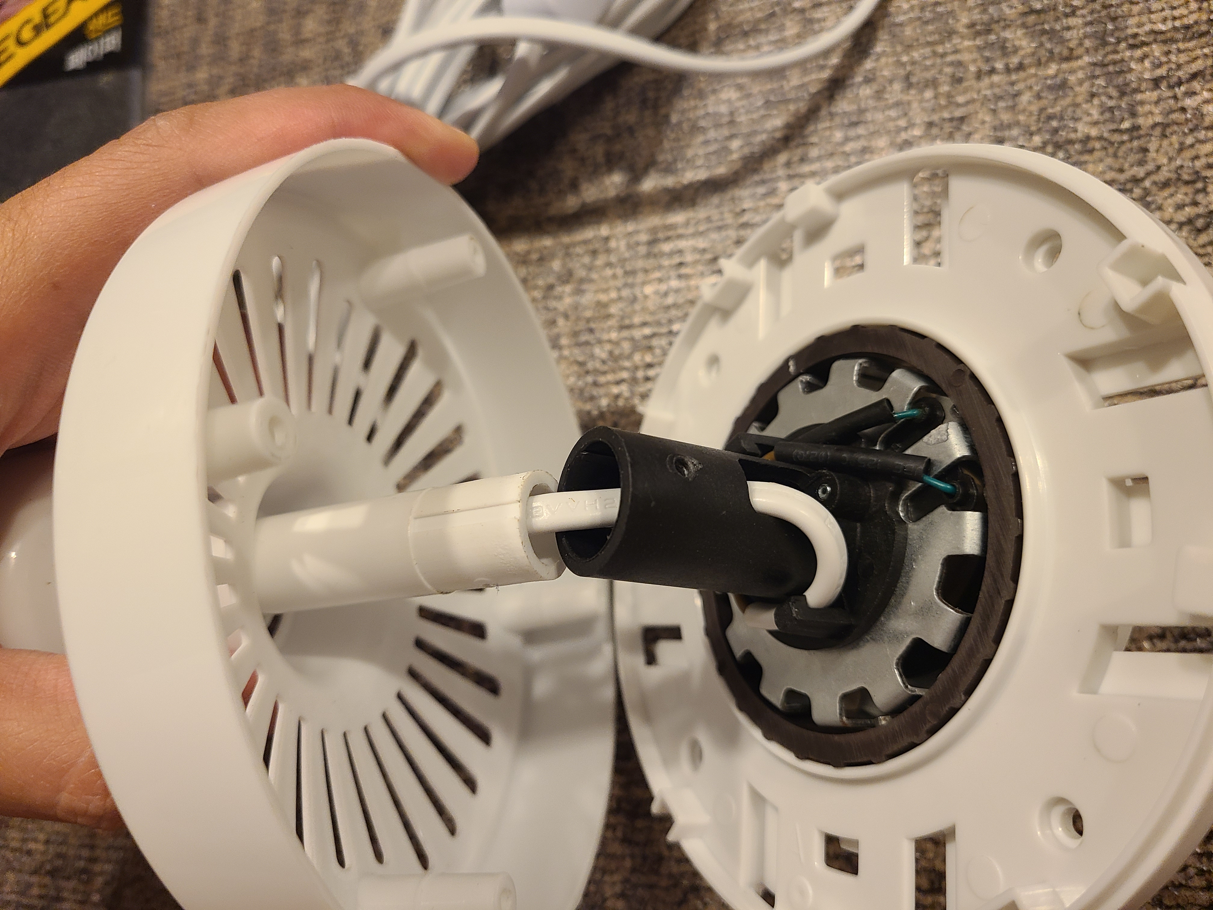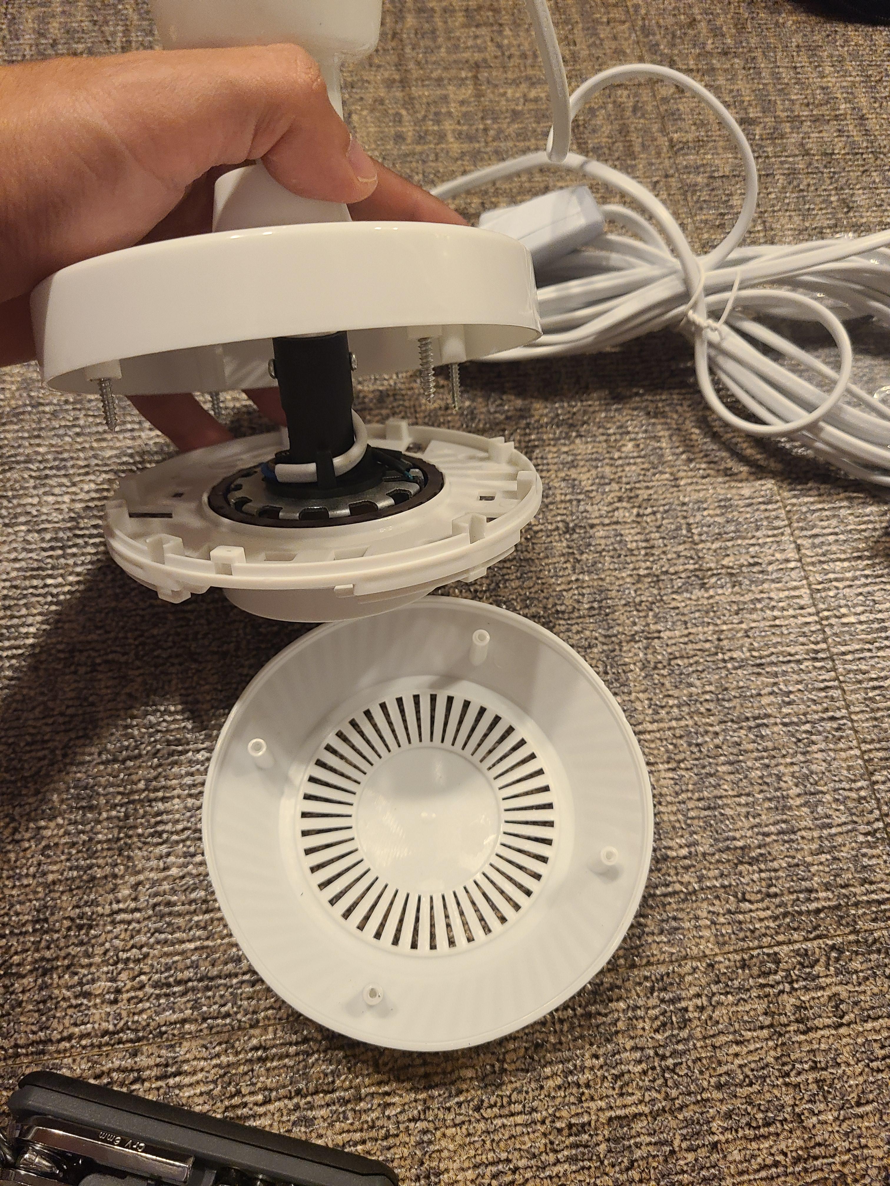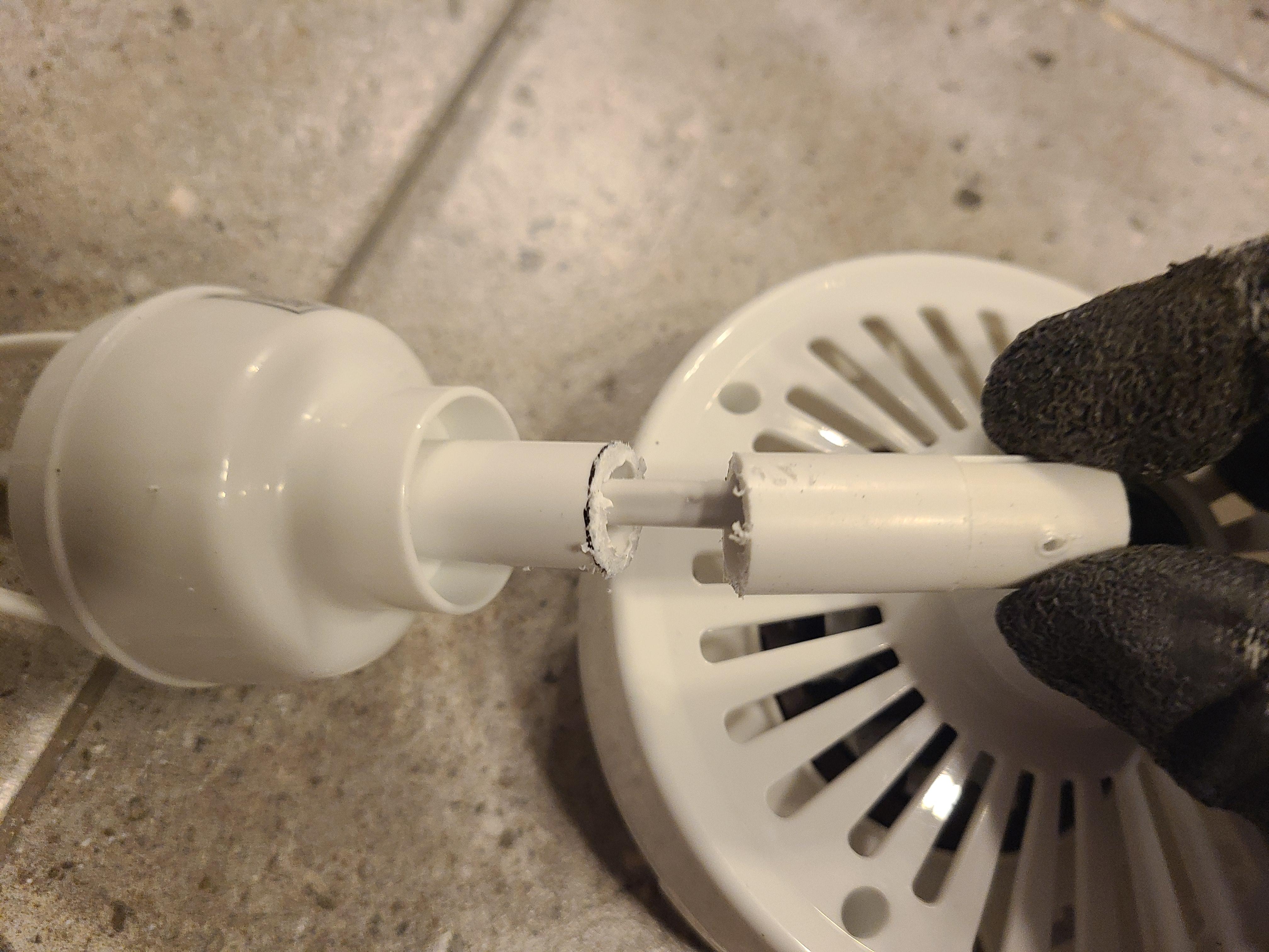 다행히 플라스틱이 약한 거라 톱으로 한 10번만 문질러도 속이 보이는 수준으로 잘렸어요. 여기서 주의해야 할 사항은 흰색 기둥 안에 전선이 들어있어요. 무작정 썰다가는 전선까지 함께 자를 수 있기 때문에 흰색 기둥 플라스틱만 자르도록 조심해야 합니다. 기둥을 돌려가면서 10번씩 문지르다가 거의 다 잘렸을 때 손으로 뽀-각 꺾어서 떼어냈어요.