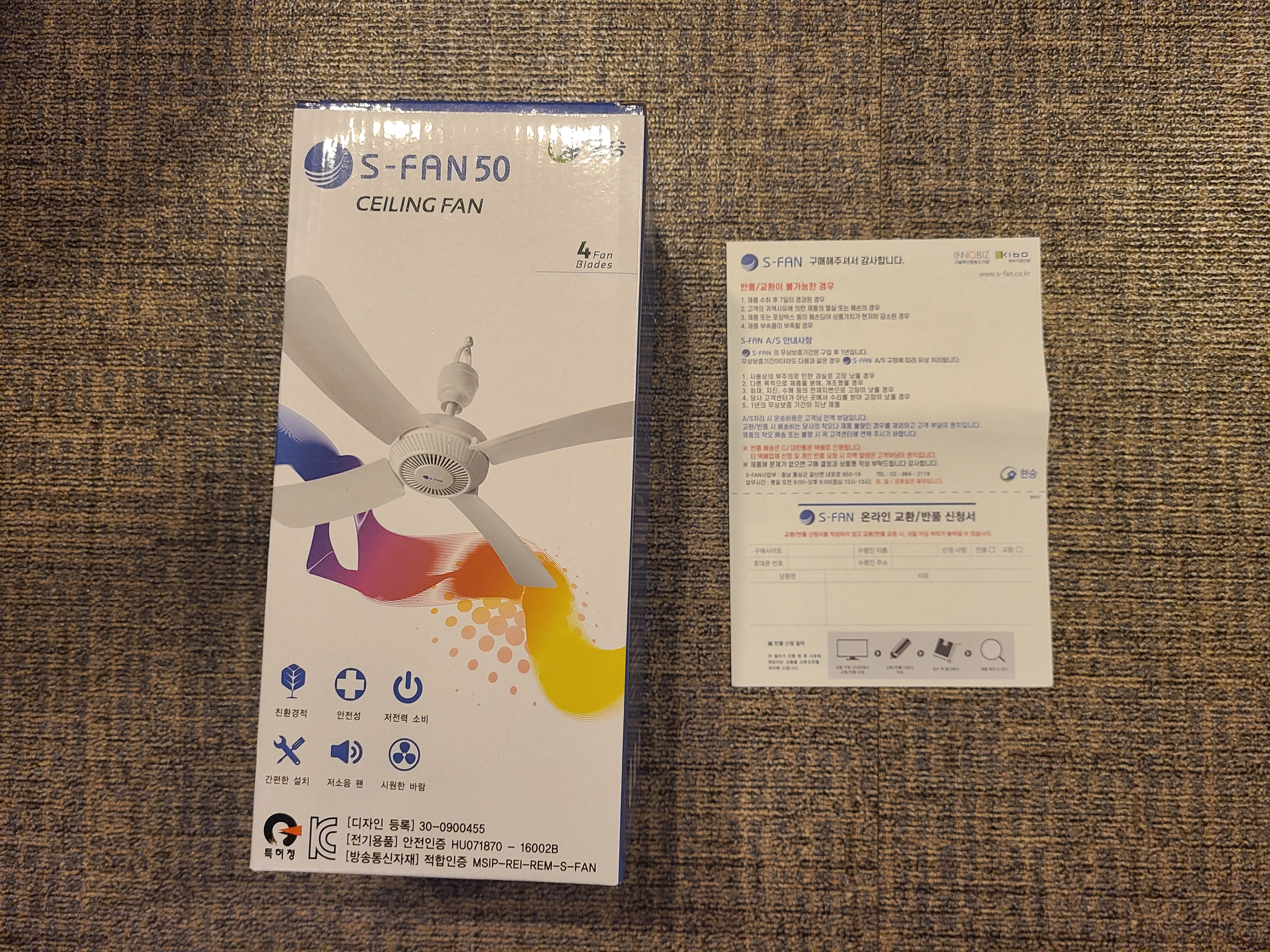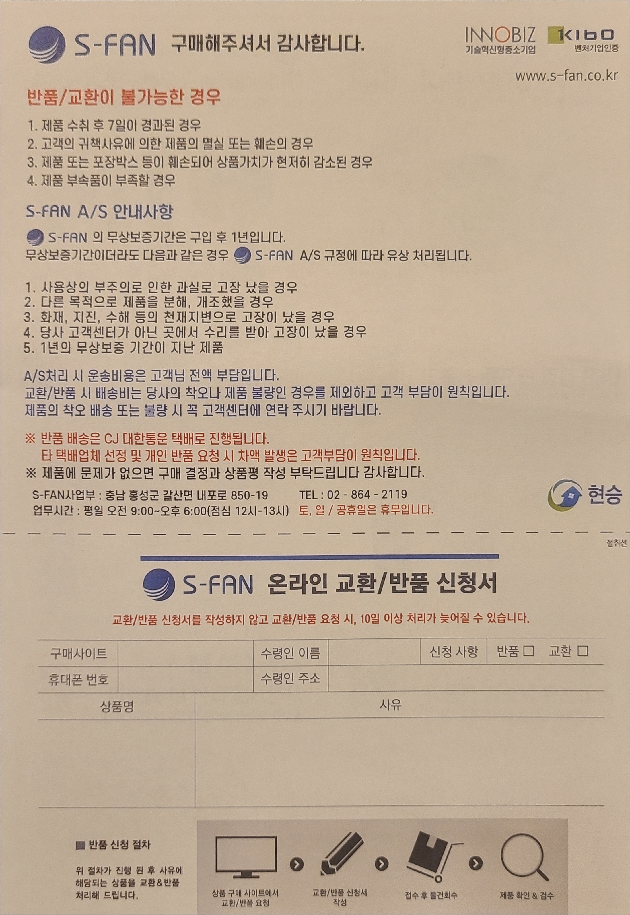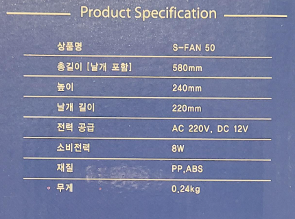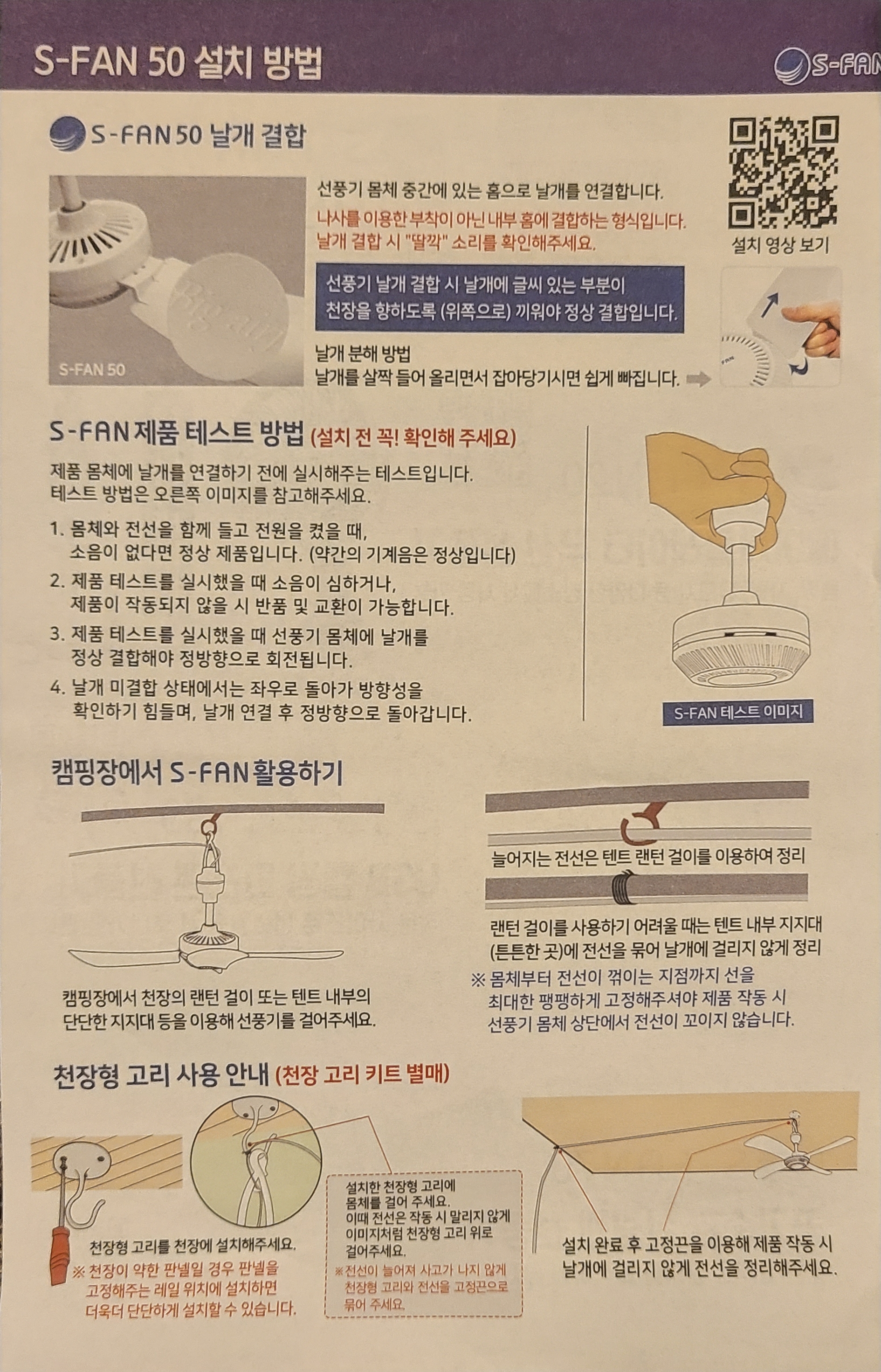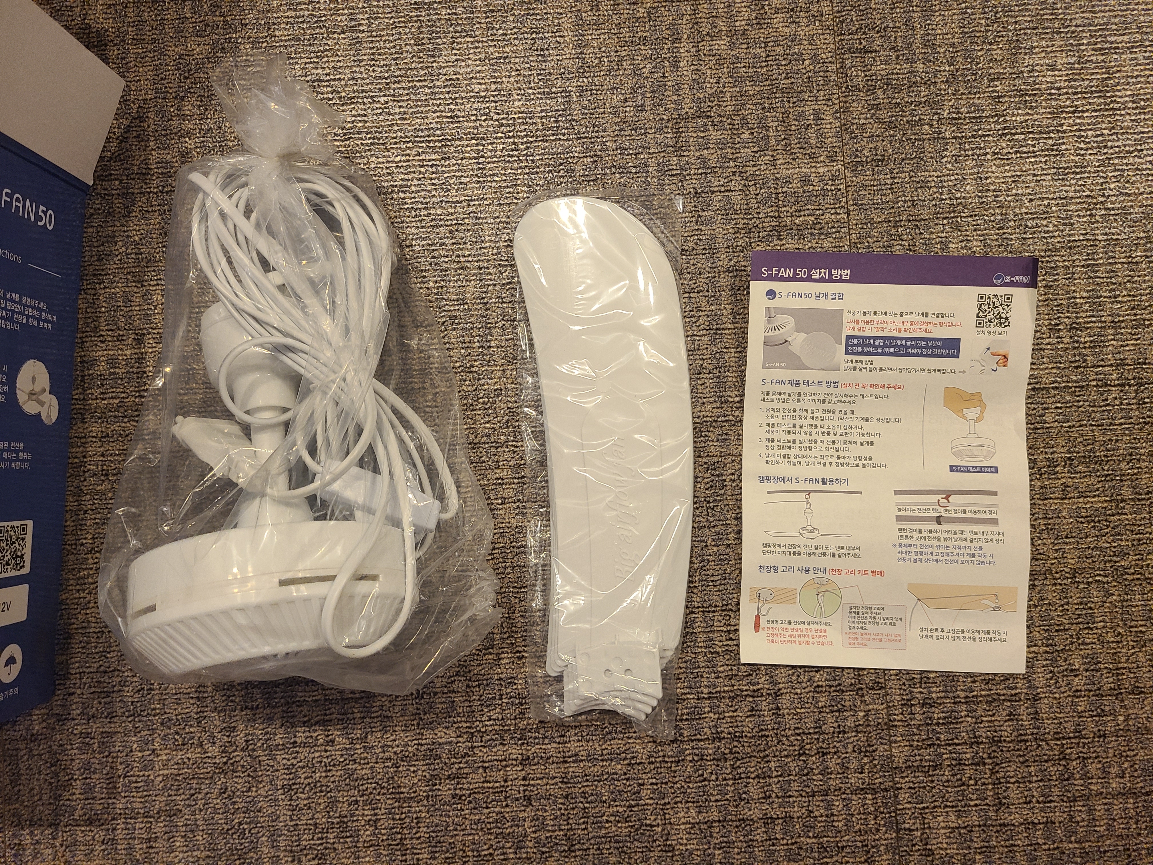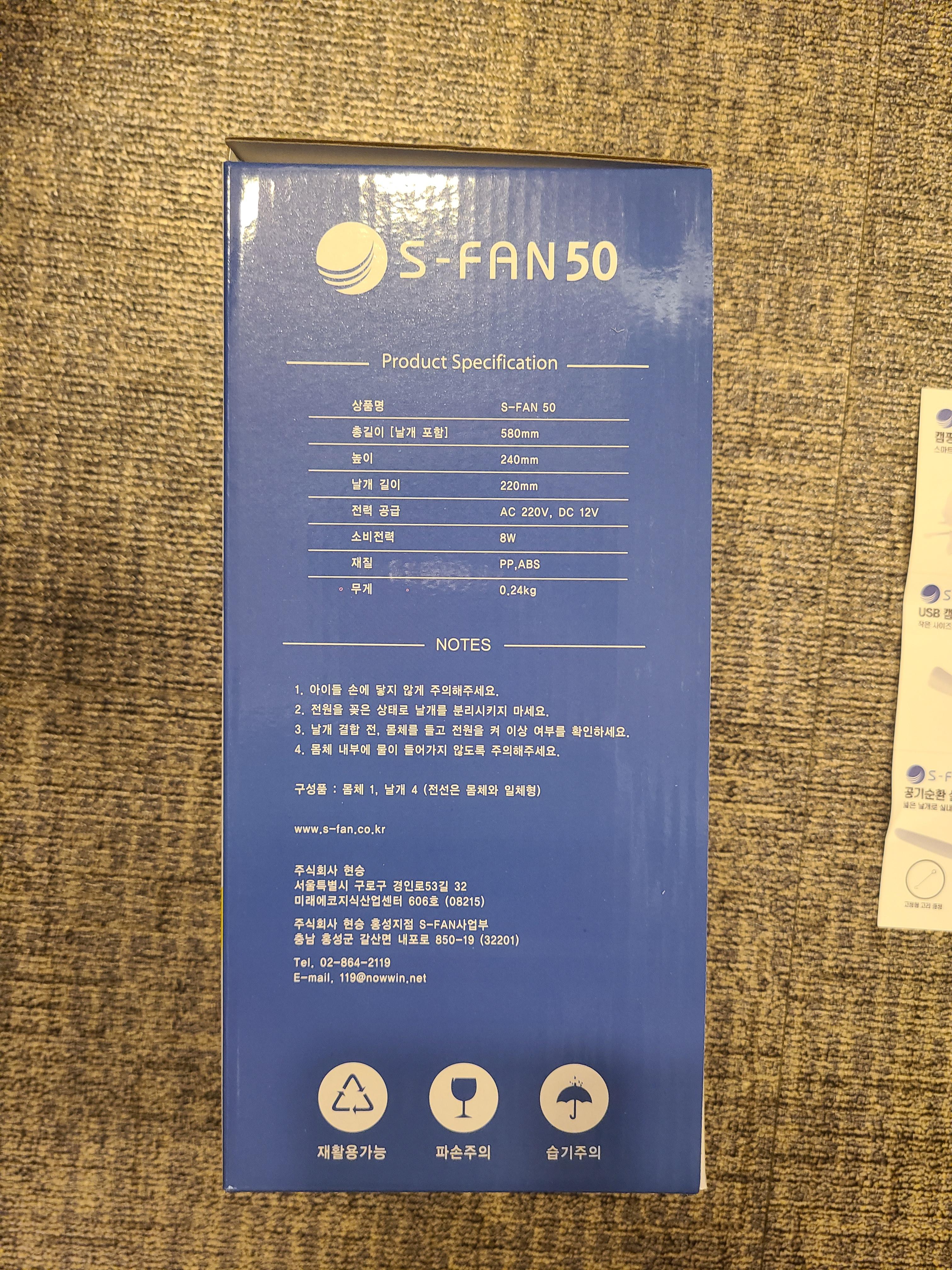 S FAN종류를 보면 usb 또는 유선 모델이 구분되는 거 같은데 저는 단순하게 유선 모델로 구매했어요. 코드 꼽아놓고 정신없이 돌리려고요 ㅋㅋㅋ 제품 구성은 단순했어요. 설명서와 본체, 그리고 날개가 전부였습니다. 설명서를 읽어보면 날개 꽂기 전에 전원을 켜보고 이상 유무를 확인하라고 하네요.