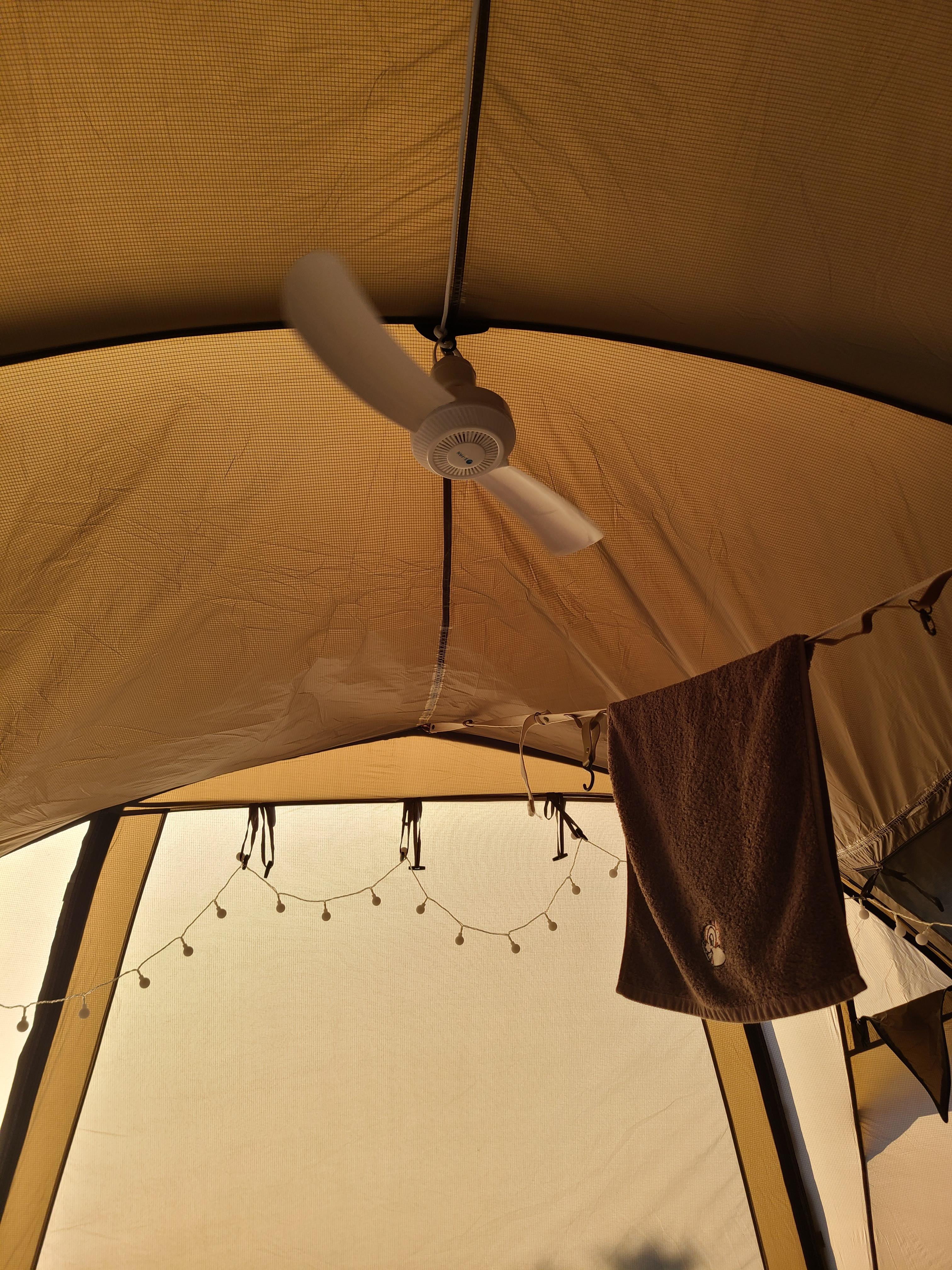 여름에는 시원한 바람을 위한 선풍기 역할을 하며 겨울에는 뜨거운 난로의 열기를 천장에서 바닥으로 대류 시켜주는 역할을 하게 되면서 사계절 캠핑용품이에요. 지난여름에 사고 싶었으나 애인이 천장에 선풍기 돌면 어지럽다고 해서 일단 보류를 했었는데요, 동계시즌에 접어들면서 타프팬 없이는 난로의 열기를 대류 시킬 수 없기 때문에 무조건 사야만 했어요.