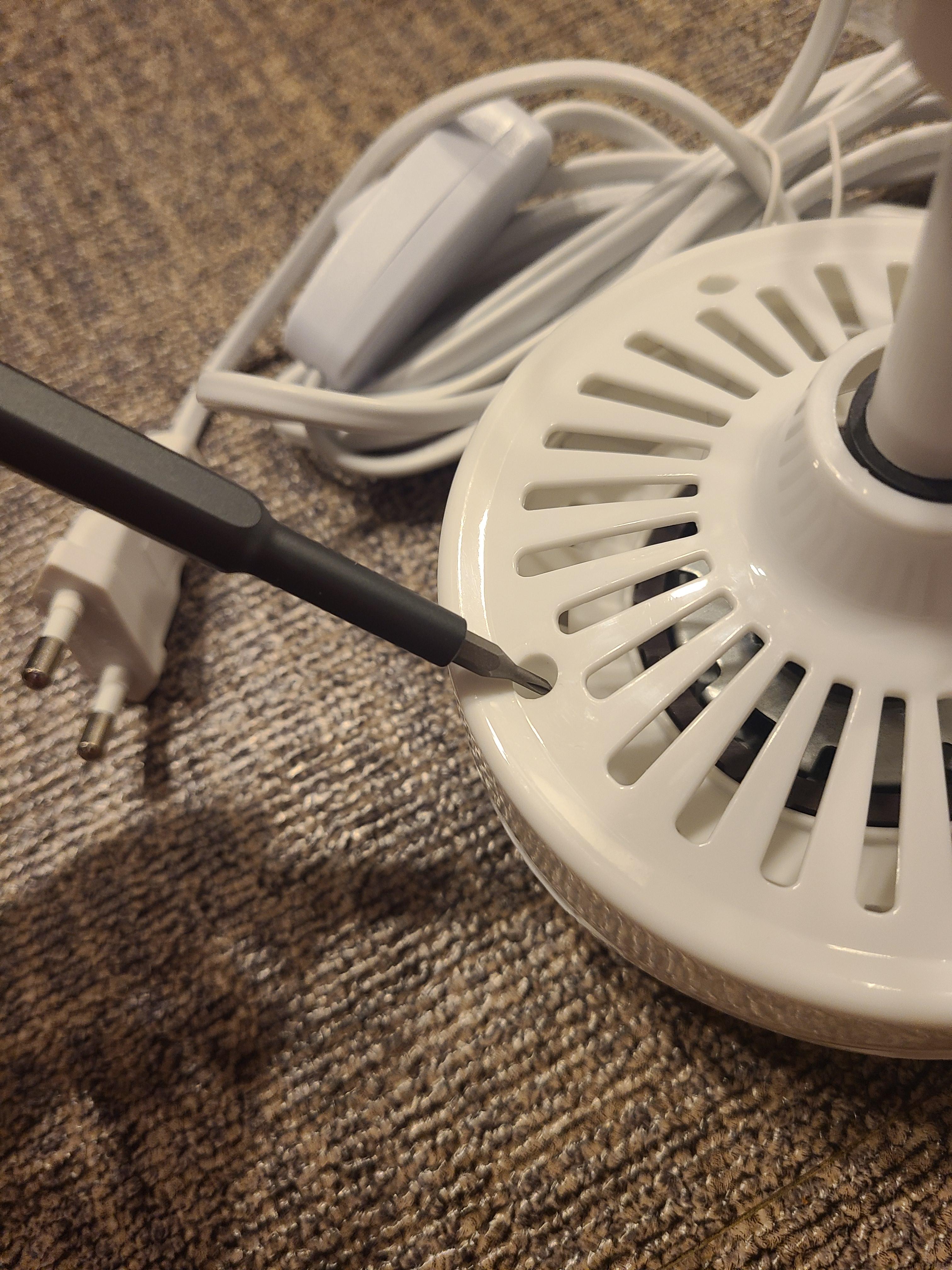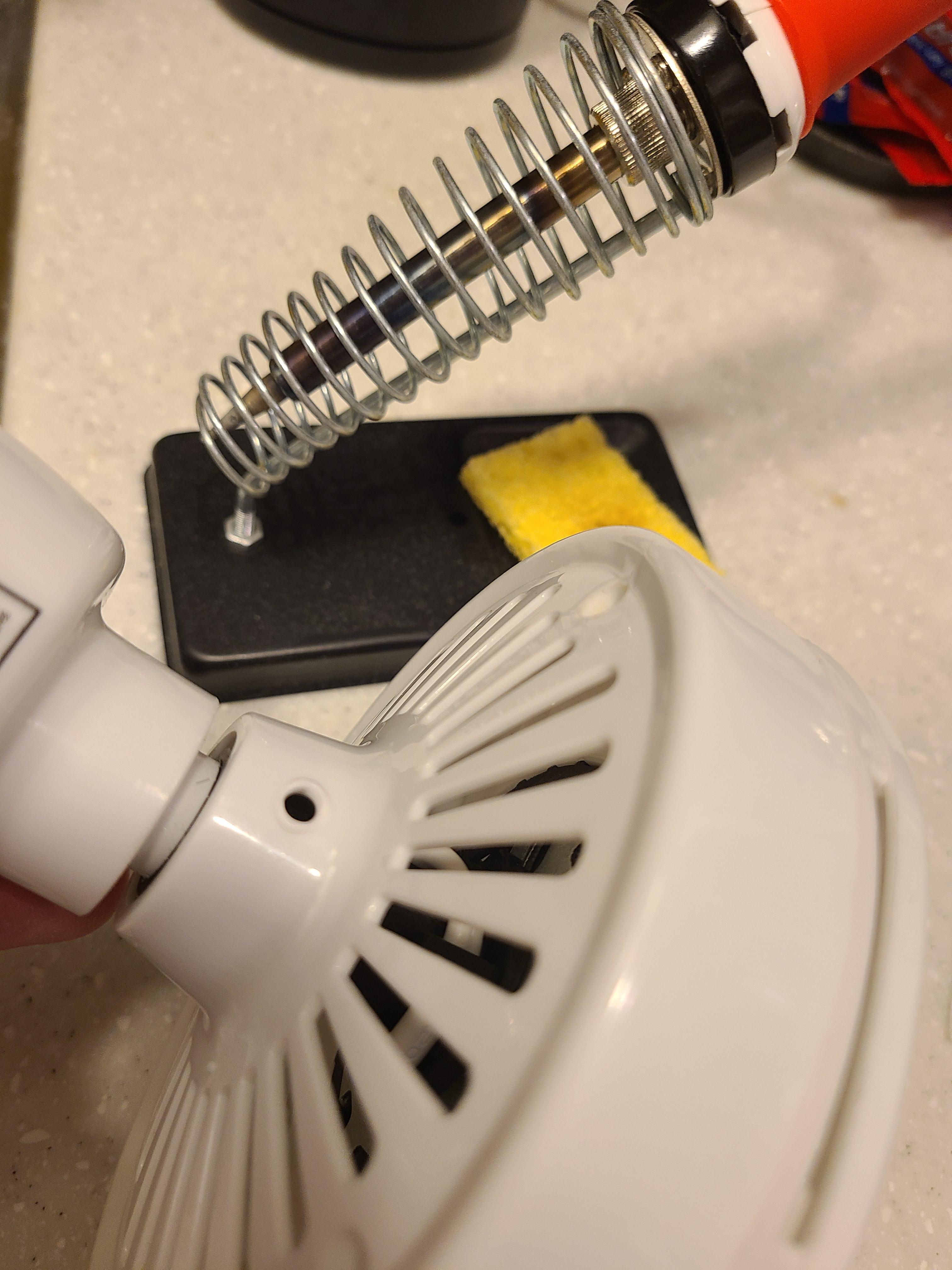 인두기를 예열하고 나사를 체결해야 할 위치에 데고 구멍을 뚫어줬어요. 여기서 나사는 겉에 있는 흰색 커버에 걸치는 게 아니라 쏘-옥 통과해서 검은색 기둥-흰색 기둥을 체결해야 해요. 만약 나사가 흰색 커버에 걸쳐있다면 선풍기가 돌지 않아요.