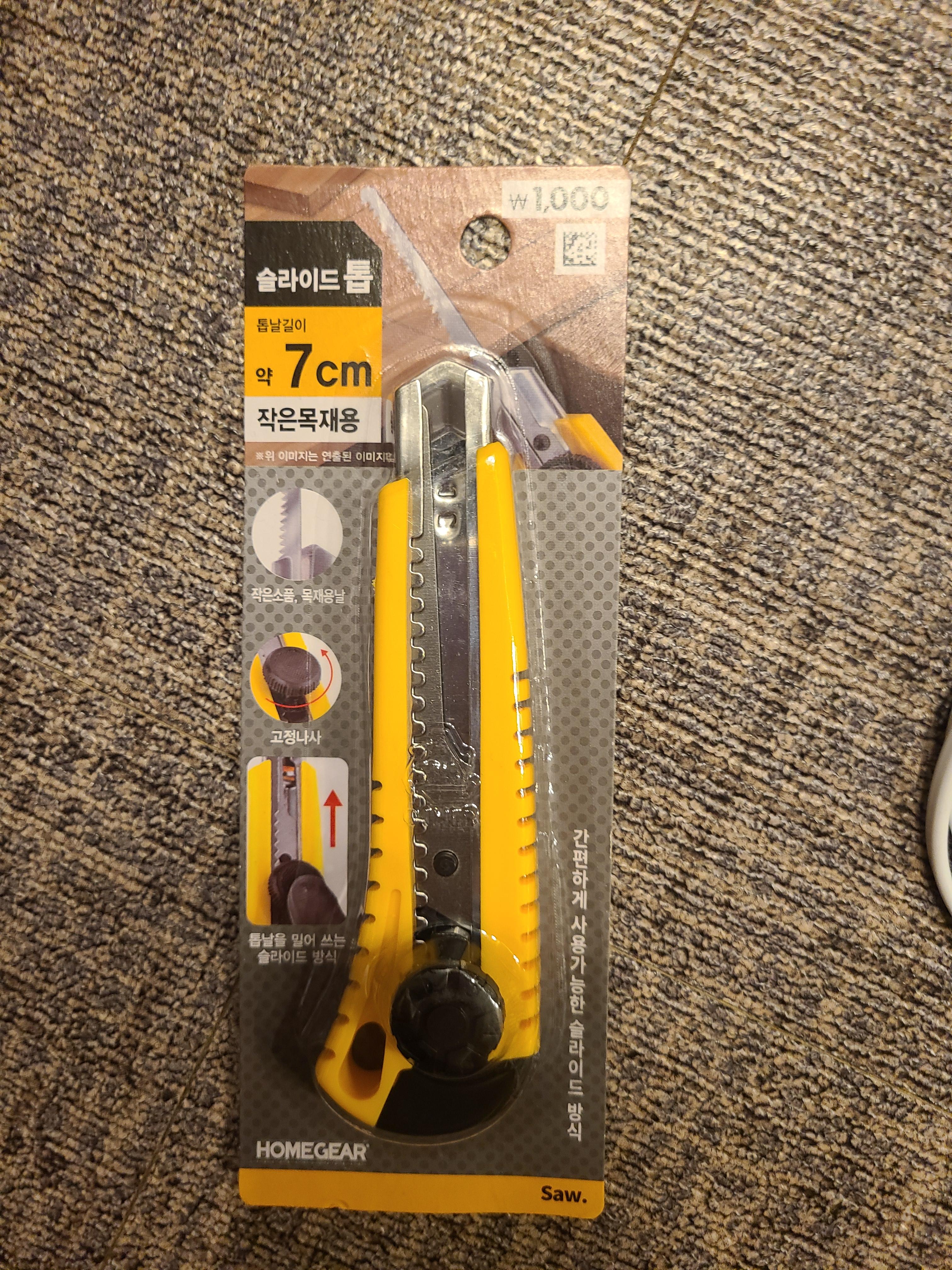 이제 흰색 기둥을 잘라야 하는데요, 선구자들은 파이프 절단기 같은걸 사용하셨던데 저 같은 쪼렙들은 그런 공구가 있을 리가 없기에 다이소에서 자를 만한 공구를 하나 업어왔어요. 커터칼처럼 생겼는데 속에 톱날이 들어있어서 잘 자를 수 있을 거 같아요.