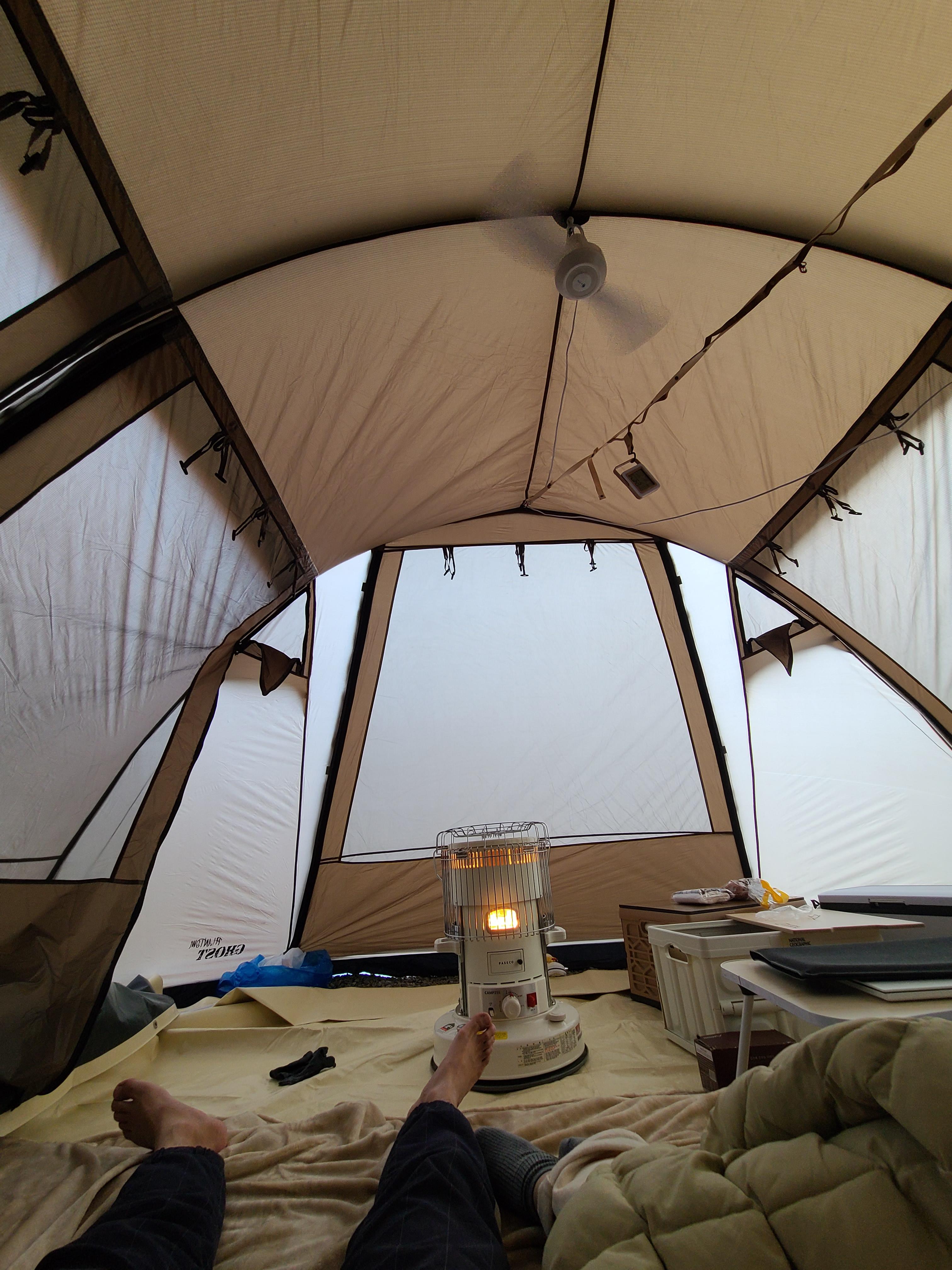 주말에 캠핑 가서 난로 위에 타프팬을 설치해봤어요. 타프팬 있고 없고가 확실한 차이가 있네요. 타프팬 없으면 천장은 엄청 뜨겁고 바닥은 차가워서 온도차가 극명한데 이렇게 타프팬을 돌리고 보니 바닥이 꽤나 따뜻해졌어요. 솔직히 완전 따뜻하다 정도는 아니지만 효과가 분명히 보일만큼 따뜻해지긴 해요.