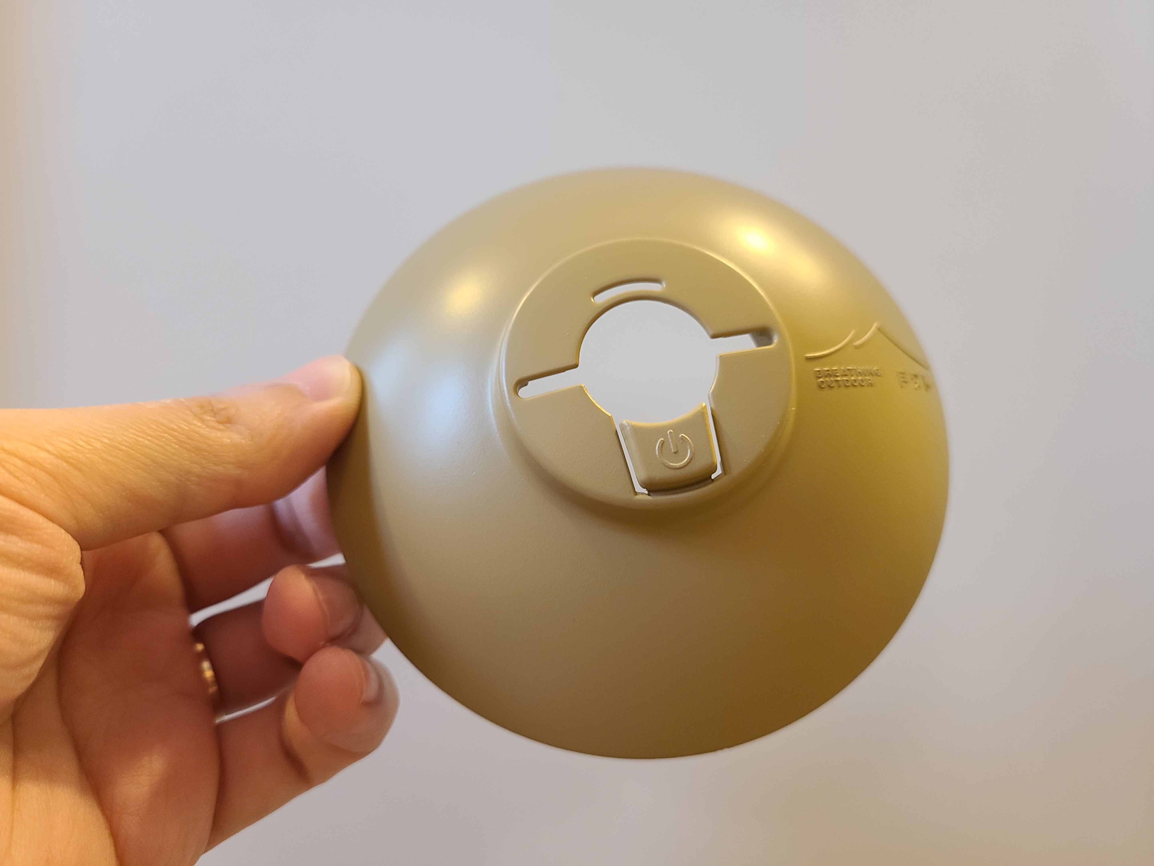 이게 쉐이드인데 흔히 말하는 갓? 으로 보면 됩니다. 랜턴 상단을 쉐이드에 끼워서 사용하면 빛이 아래로만 비춰지기 때문에 눈부심을 막을 수 있어요. 알루미늄 같은 재질로 만들어진 거 같구요, 안쪽은 반사가 잘되도록 밝은색으로 되어있네요. 실제 사용할 때 보면 사진에 보이는 전원버튼이 생각보다 잘 안 눌려요. 랜턴과 쉐이드를 완전 꽉 밀착시켜야지만 전원버튼이 눌리니 이점 참고해주세요~!