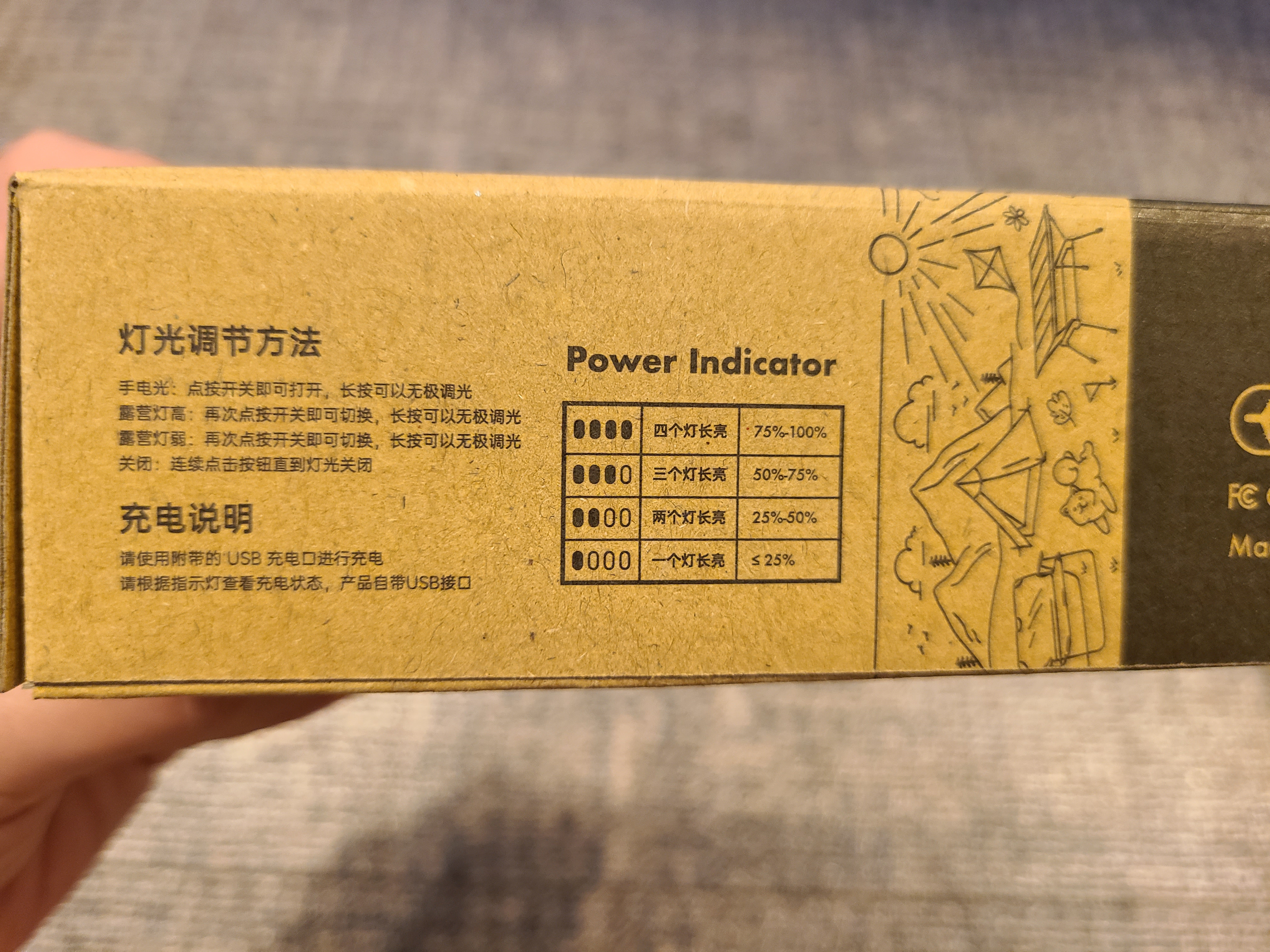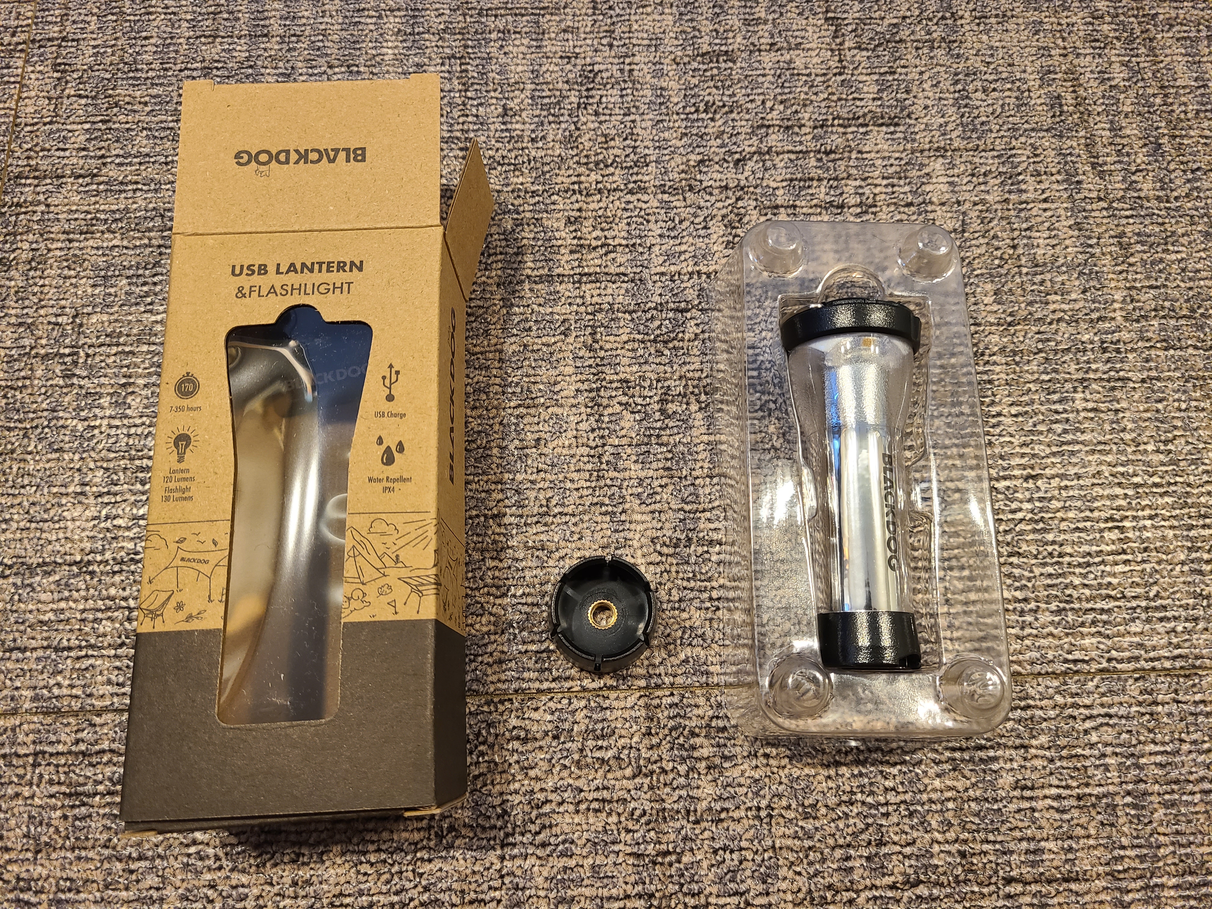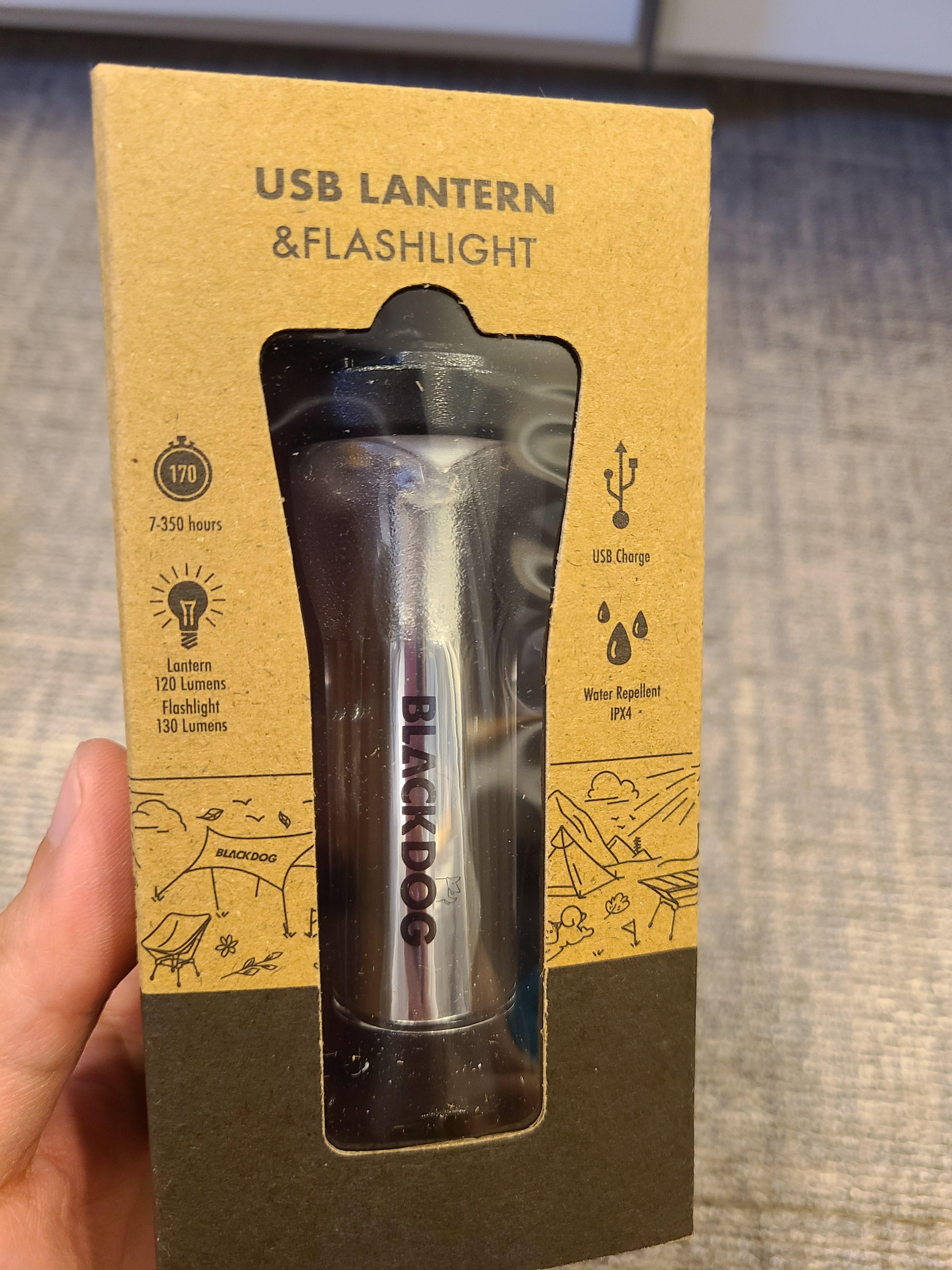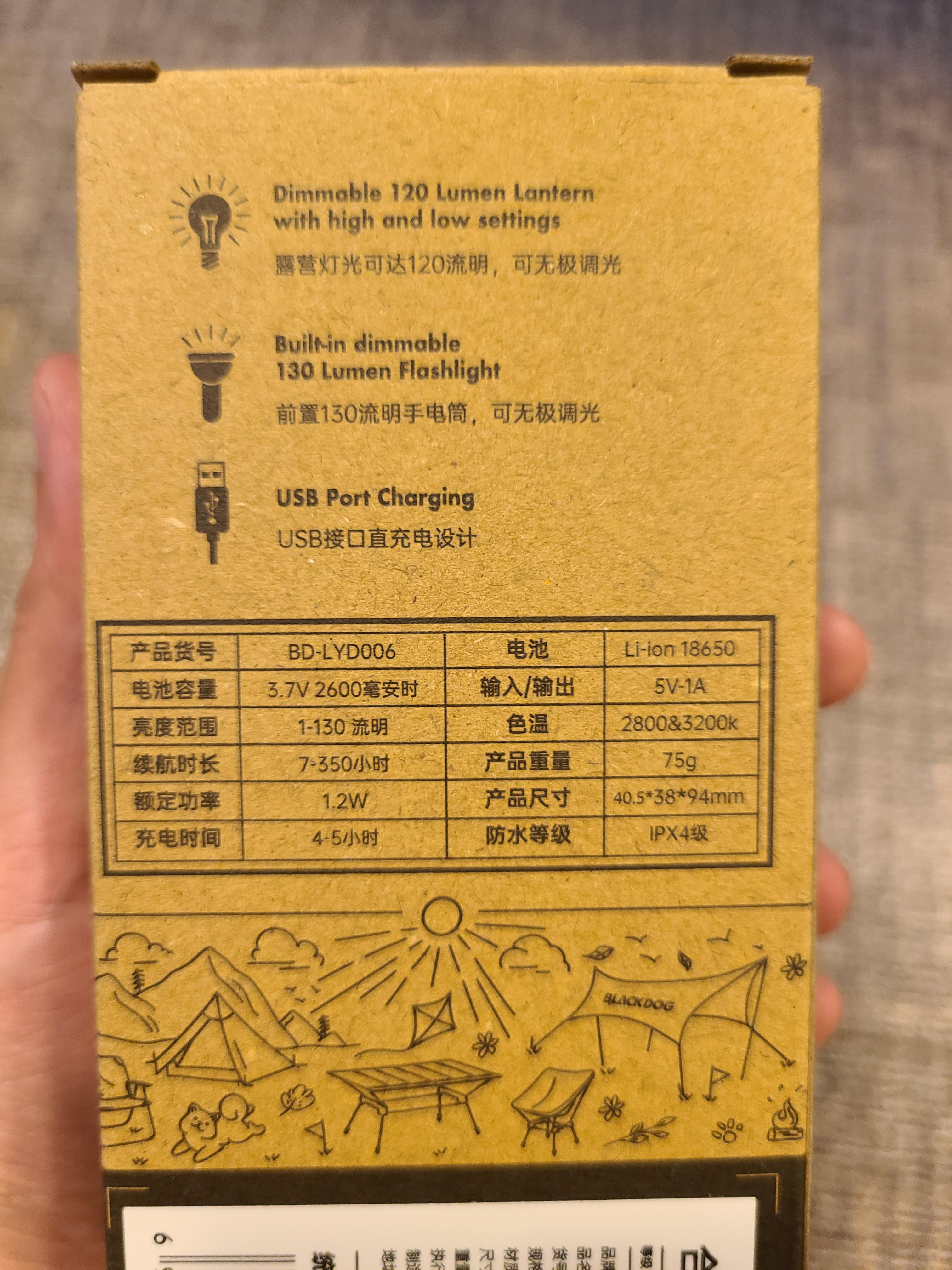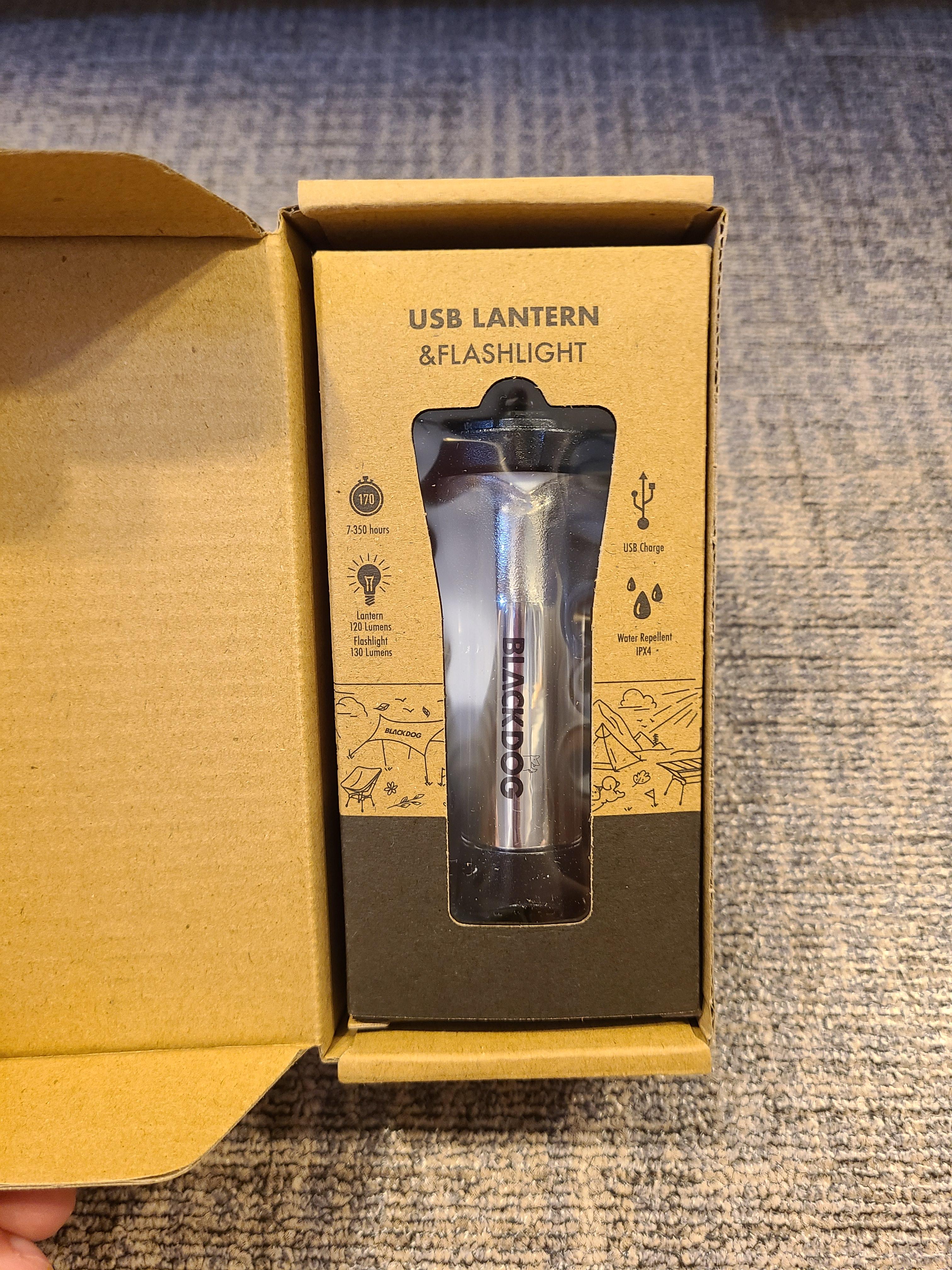 박스 안에 또 다른 박스가 있고 드디어 랜턴을 보게 됩니다. 상자 표면을 보면 제조사가 강조하는 하이라이트들이 있기에 좀 꼼꼼히 보는 편인데요, 대충 보니 긴 사용시간(최대 350시간), 밝기(130 루멘), 방수(IPX4)가 특징 같네요. USB 충전은 당연히 돼야 하는 부분이니 패스!