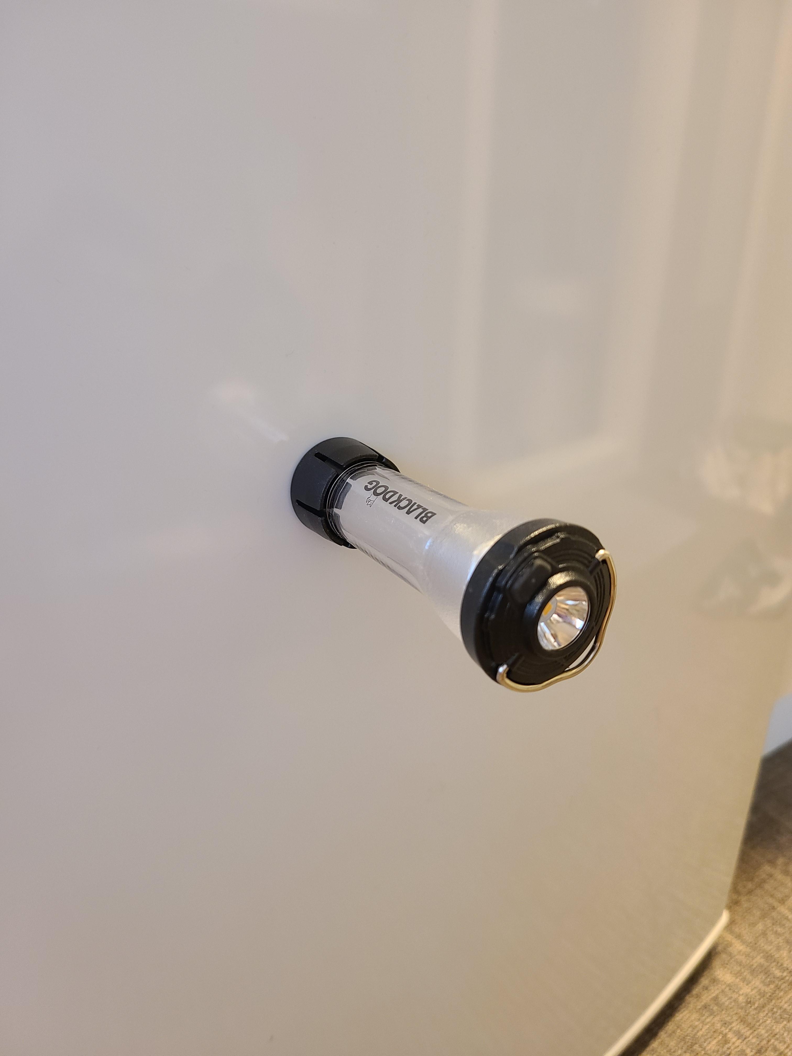 상자를 오픈하면 랜턴과 함께 꼭지(?)가 함께 오는데 이것은 랜턴 아래에 꽂으면 1/4인치 나사에 꽂을 수 있어요. 더 좋은 건 꼭지에 자석이 있어서 쇠붙이 어디든 붙여놓을 수 있어요. 이거 개꿀이죠. 근데 꼭지 꼈다 빼기가 넘나 사나워서 저는 그냥 빼놓고 쓰려고요. 어차피 고리로 천장에 걸어둘 목적이라 꼭지는 필요 없을 듯해요.