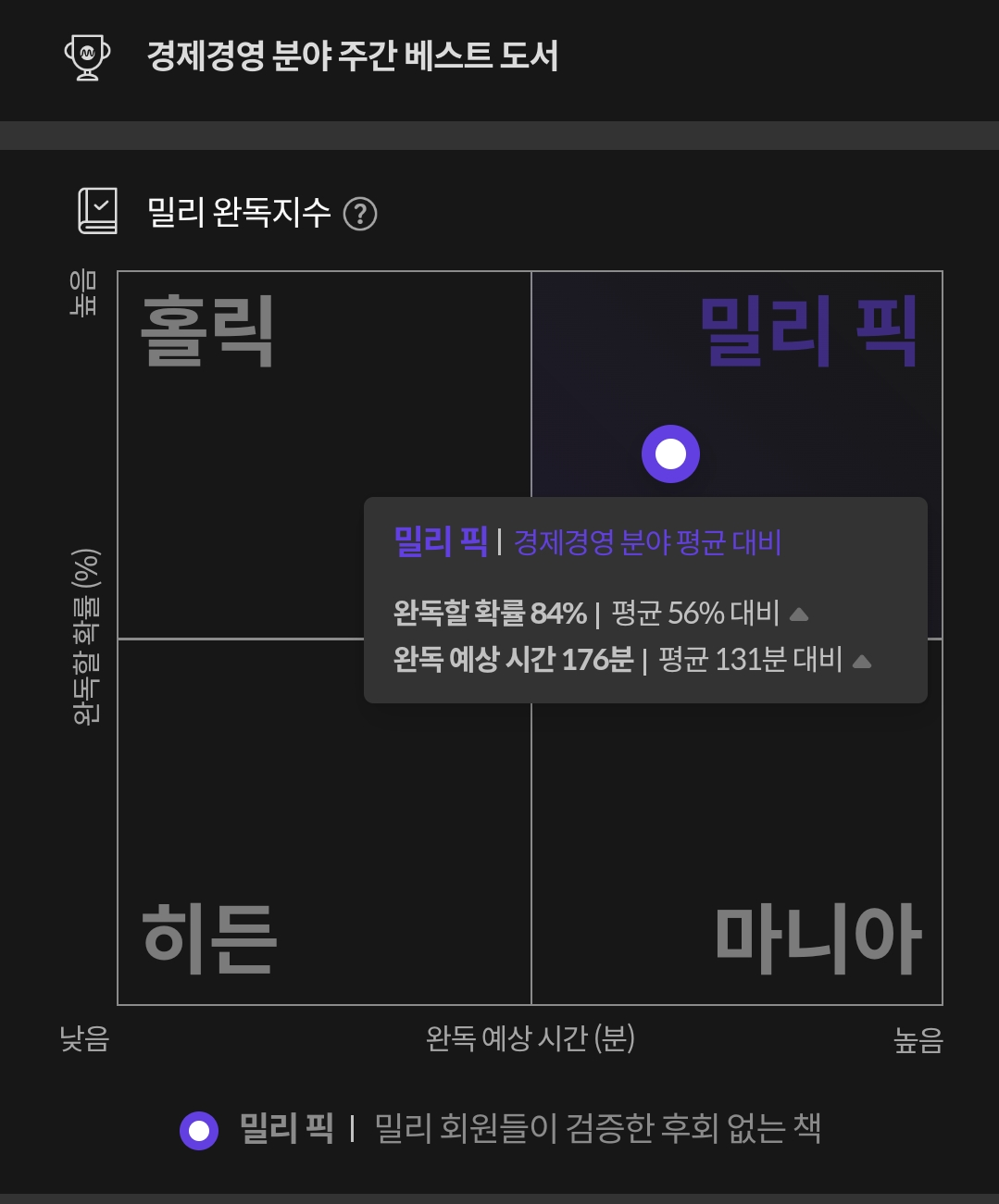 우리가 물건을 살 때도 리뷰를 보고 구매하곤 하는데요, 책을 살 때는 인터넷에서 검색해서 리뷰를 찾곤 했었어요. 그런데 밀리의 서재에서는 리뷰를 바로 확인할 수 있어서 저보다 먼저 읽어본 사람들의 후기를 바로 확인할 수가 있어요. 뿐만 아니라 완독하려면 얼마나 걸릴지, 완독할 확률은 얼마나 되는지를 예상함으로써, 해당 도서가 어떤 유형의 책인지도 짐작할 수 있도록 도와주고 있어요. 이런 부분 진짜 칭찬합니다!