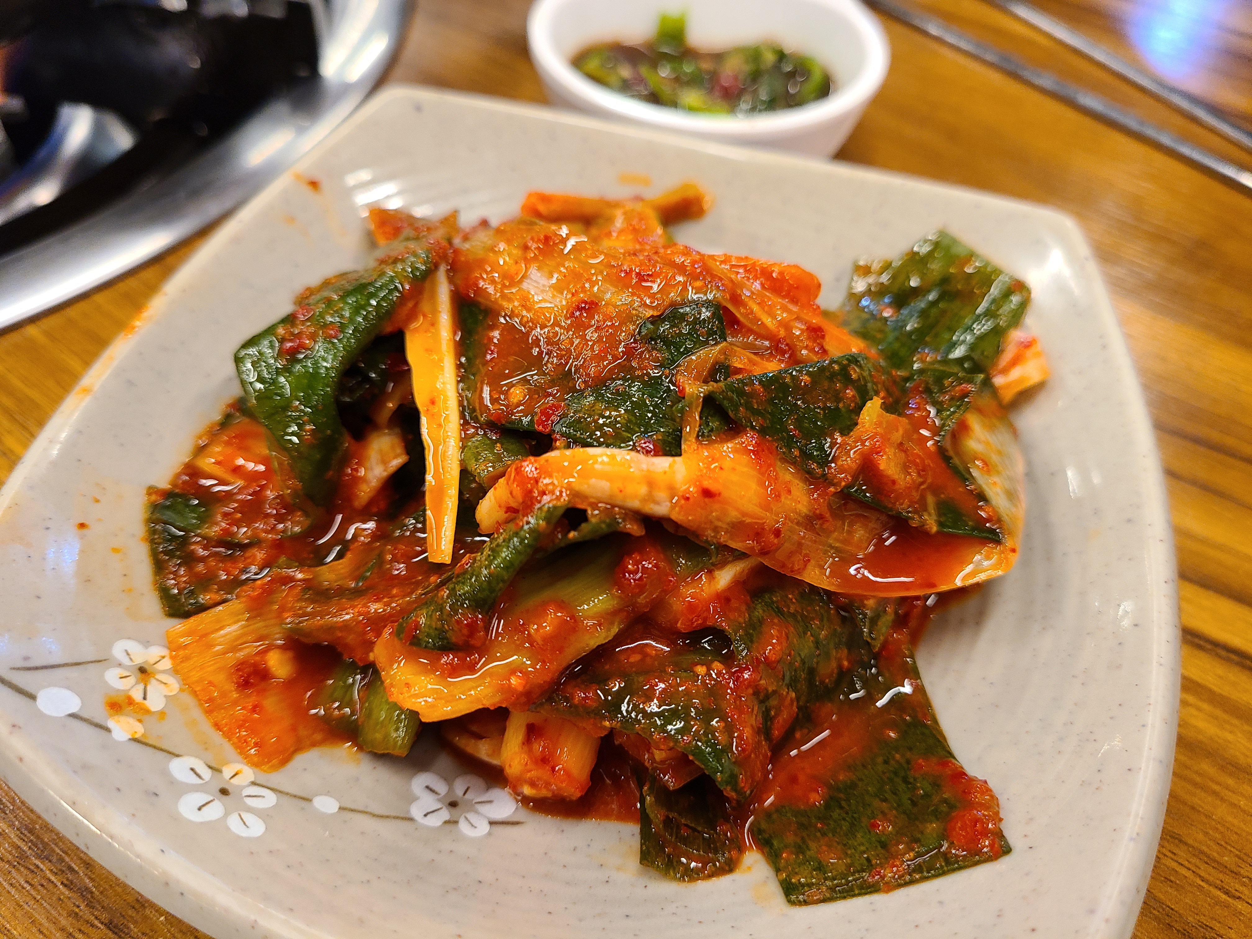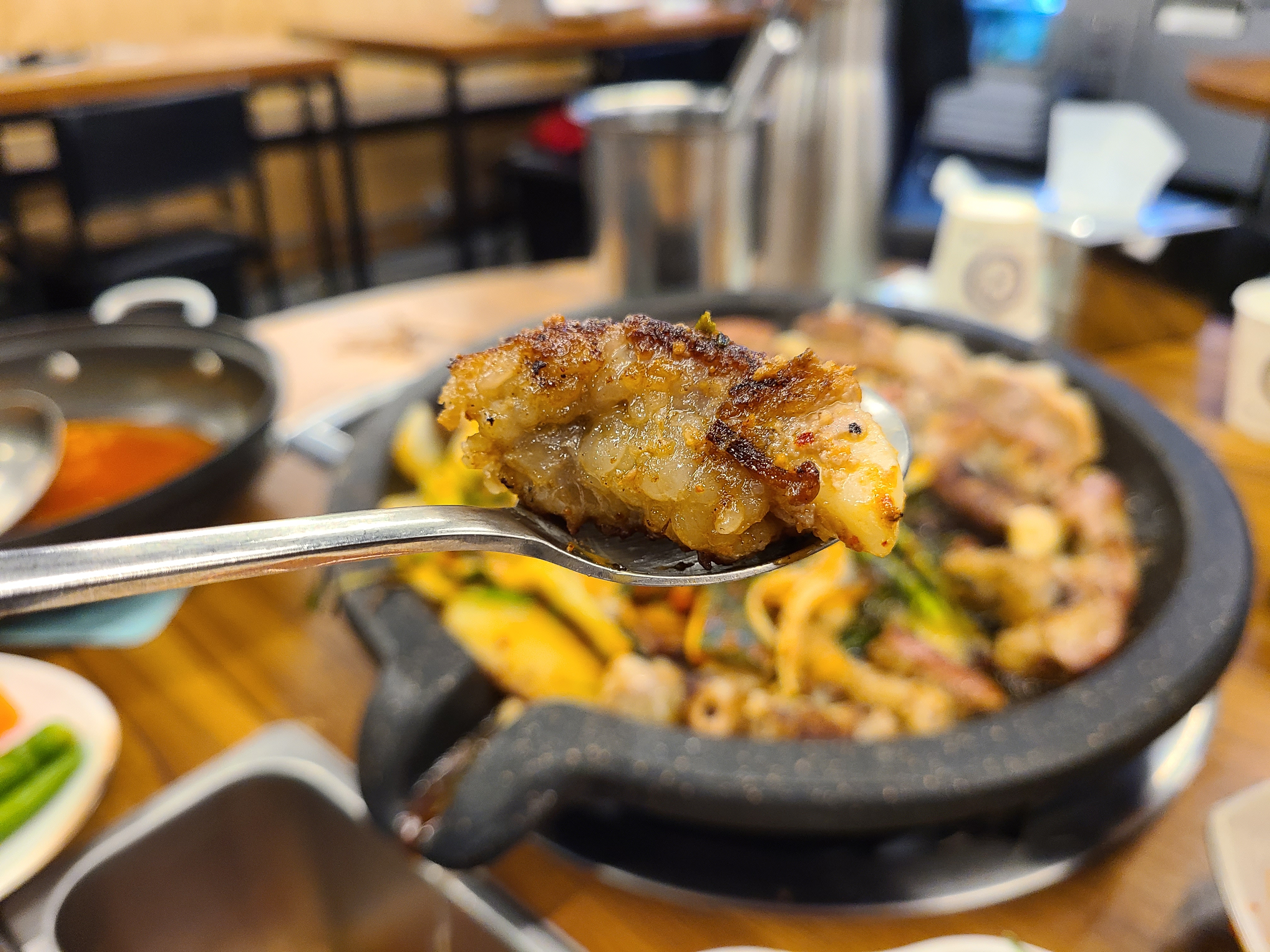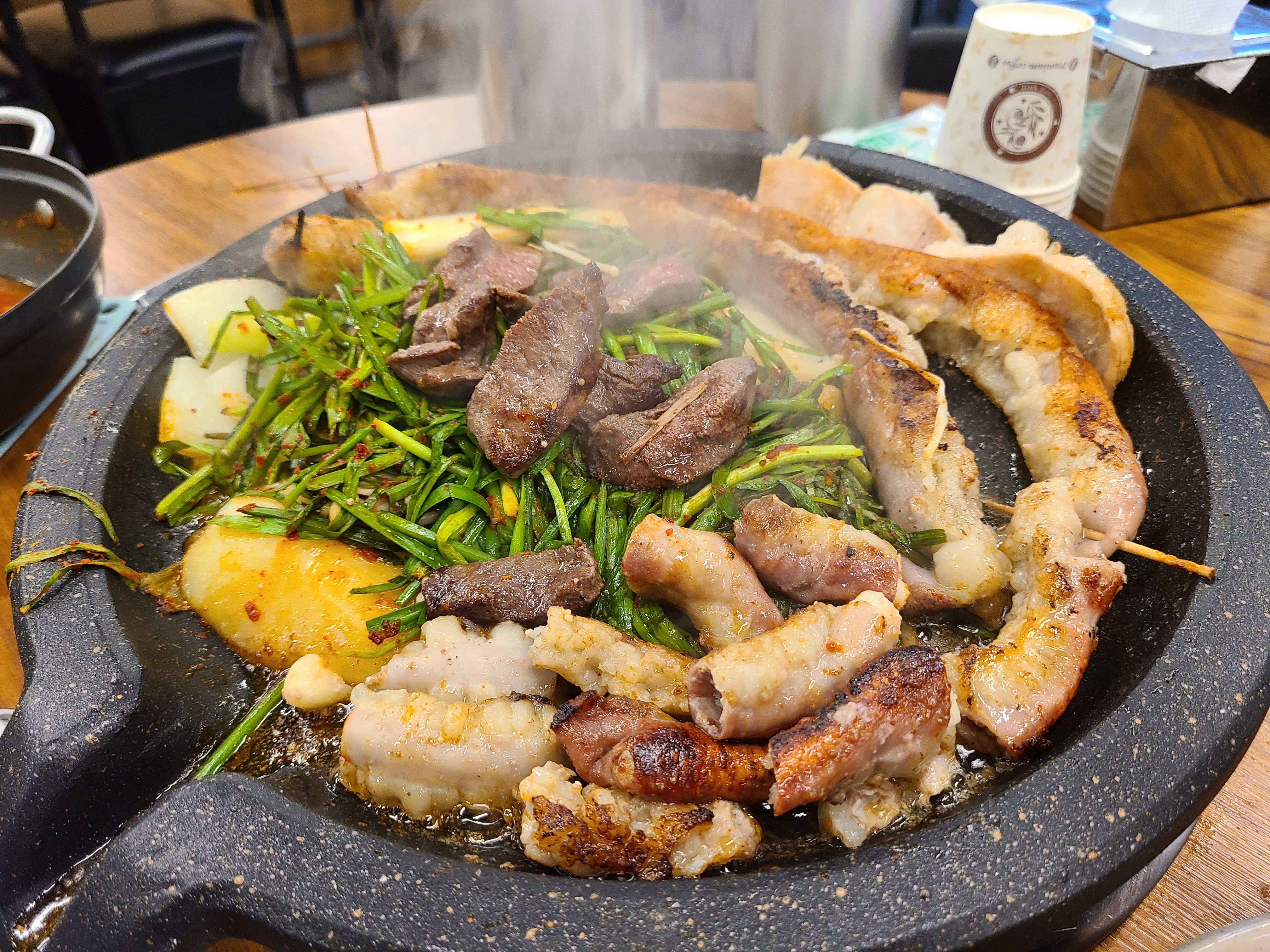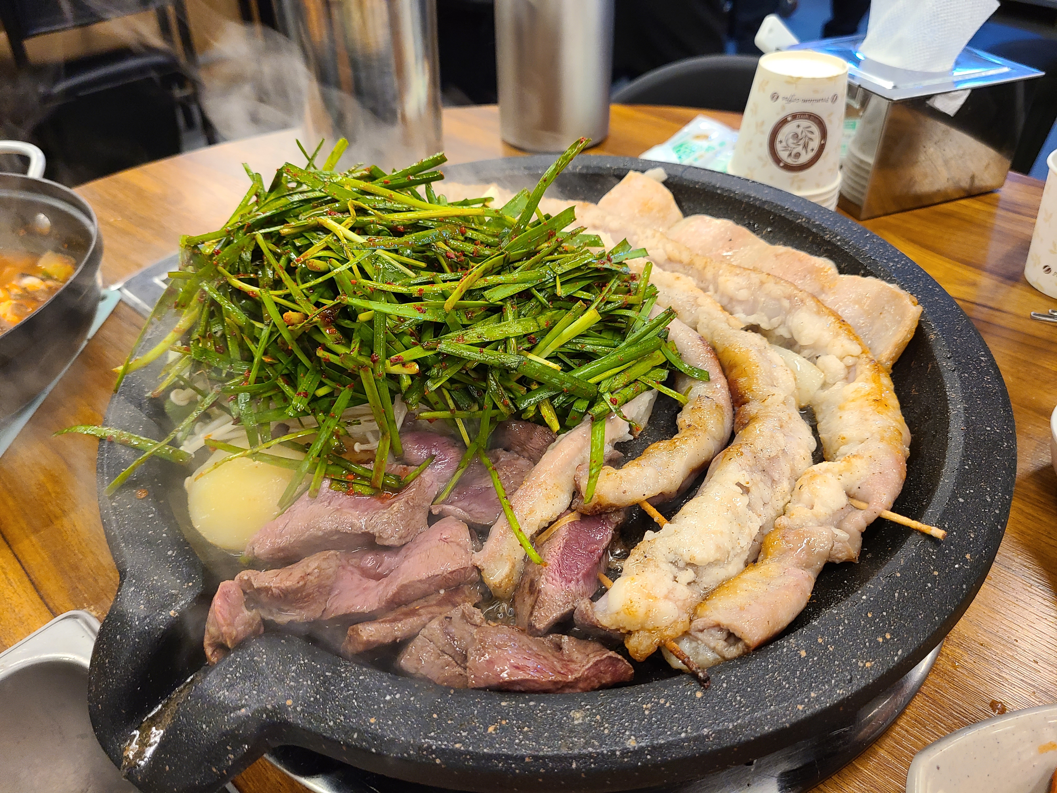 어느정도 시간이 되면 이모님이 오셔서 순두부찌개 옆으로 치워주시고 고기판 올려서 구워주십니다 고기도 얼추 익으면 부추도 올려주시고 되게 좋았어요