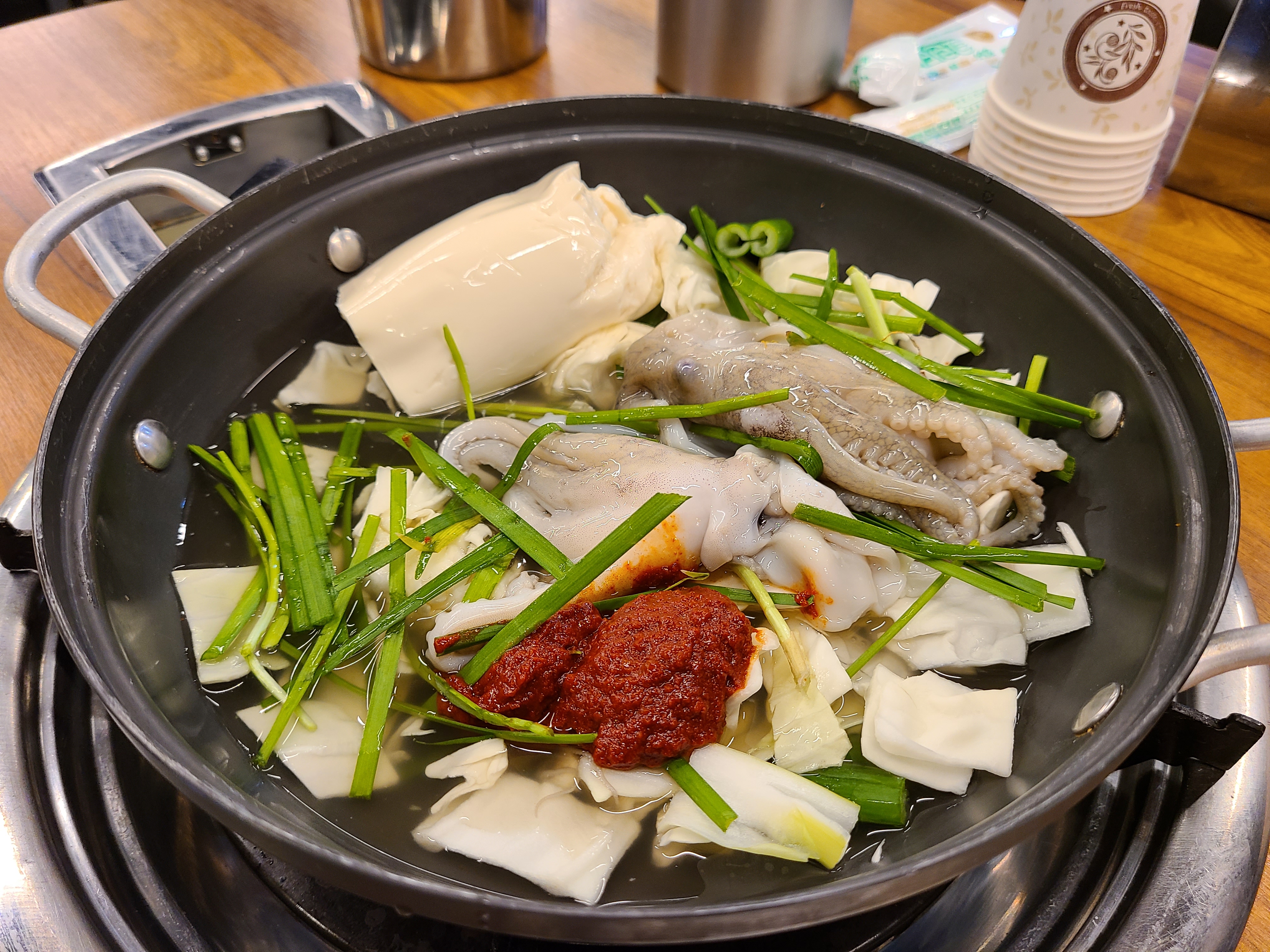 주문하면 순두부 쭈꾸미 찌개랑 소스 김치 등이 준비가 됩니다 배고프니까 반찬부터 먹어봤는데 맛잇네요 굳