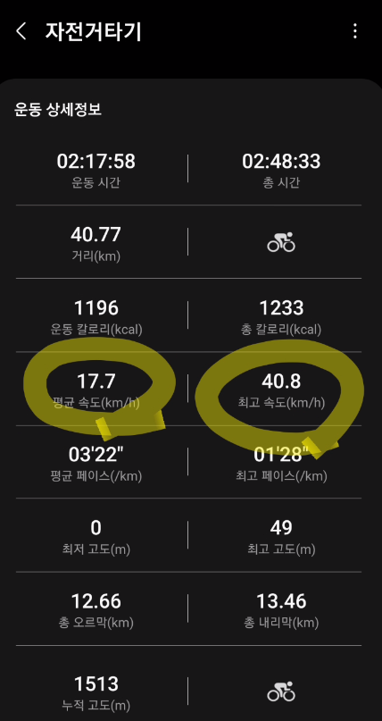 제 과거 기록을 보니 평균속도 17.7km/h 에 최고속도 40.8km/h 인 걸 확인했습니다
