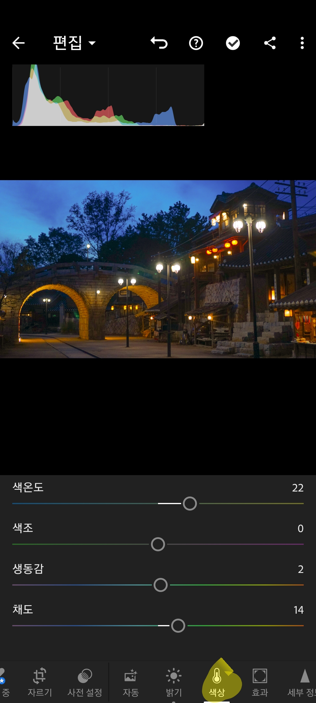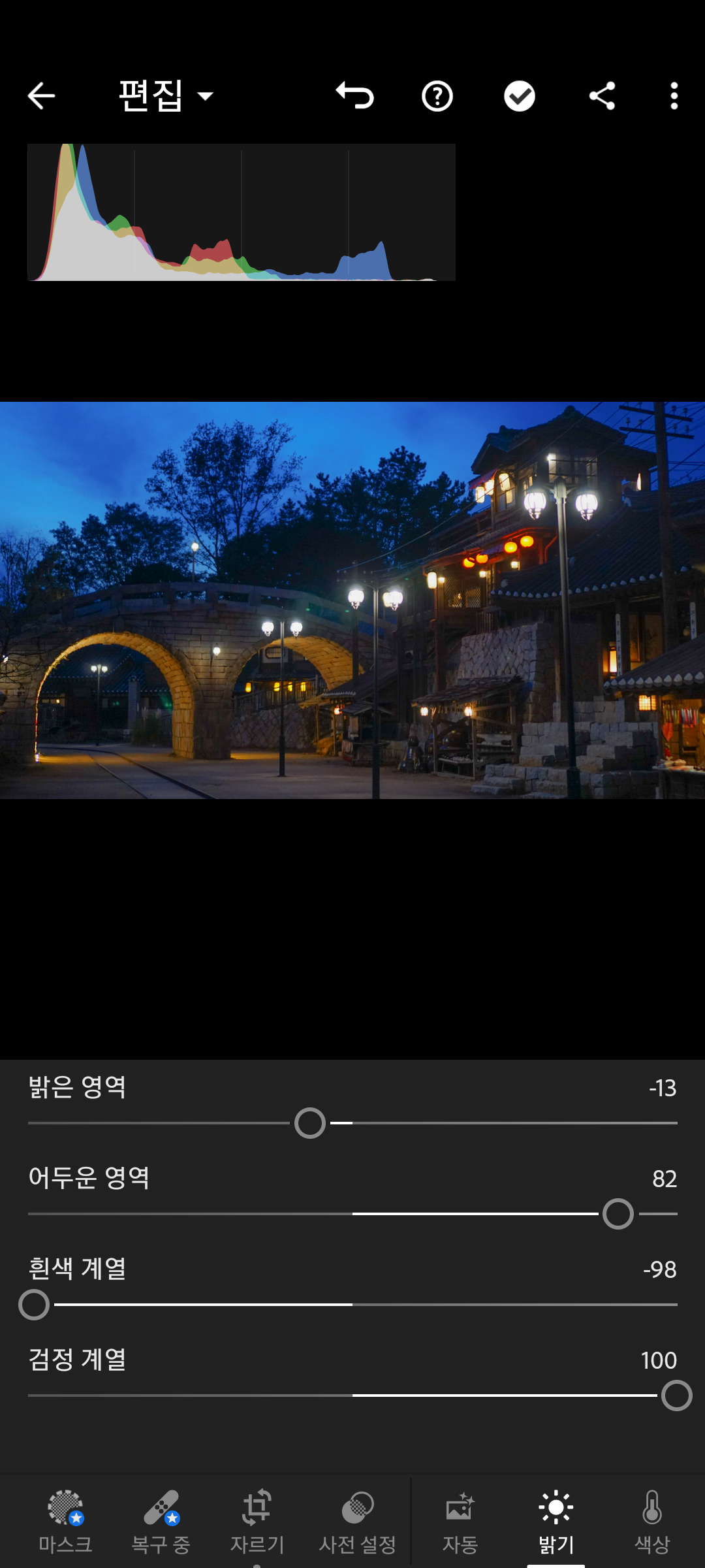 어플에 들어오면 상단에서 히스토그램을 확인할 수 있습니다 쉽게 설명하면 왼쪽으로 갈수록 어두운 색, 오른쪽일수록 밝은 색을 나타냅니다 해당 히스토그램을 확인하면 우측(밝은 색)은 거의 짤렸고 좌측(어두운 색)에만 몰려있다는 것을 볼 수 있습니다 즉 사진이 어둡다는 거죠