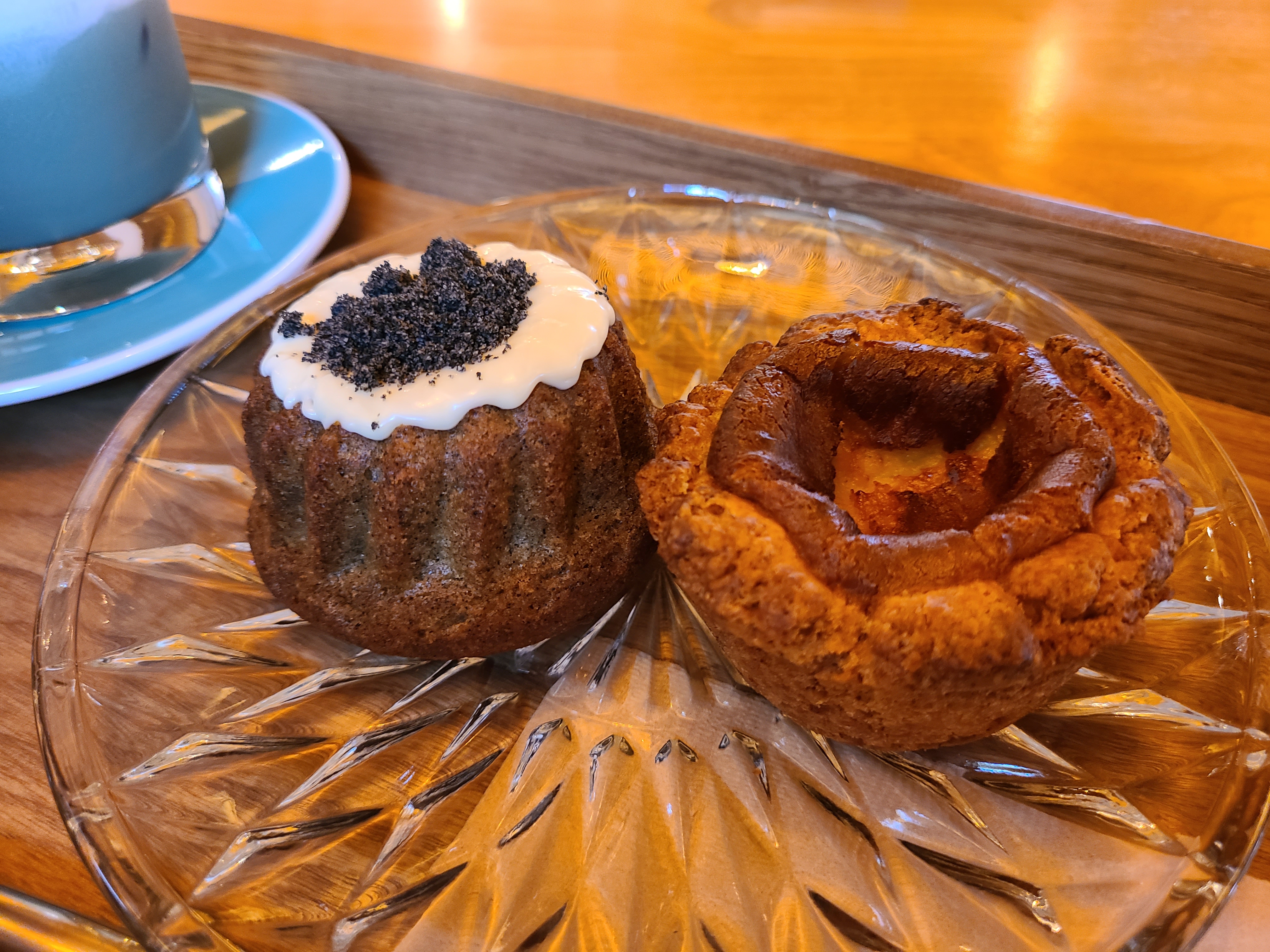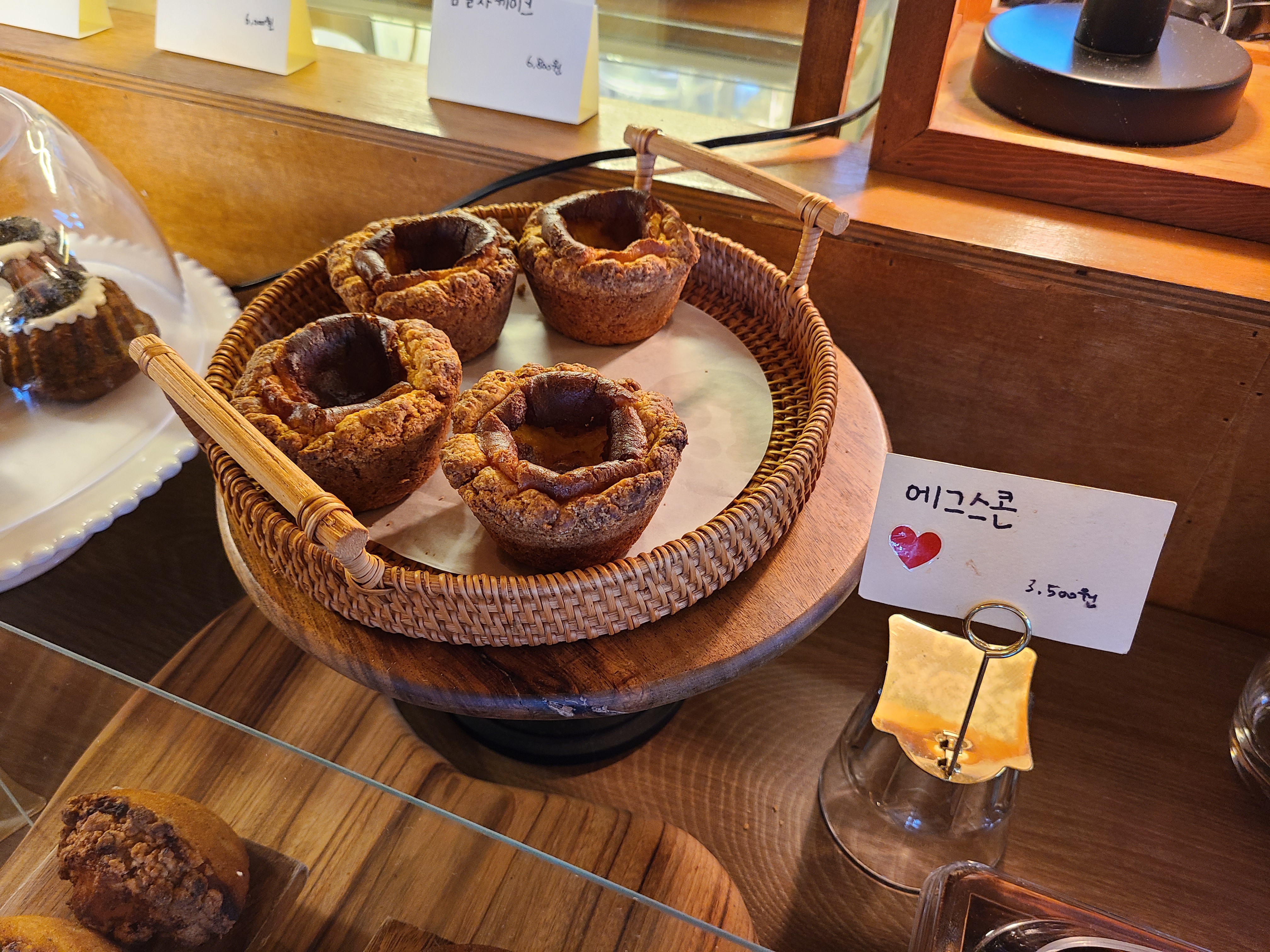 여기 카페의 시그니처라 불리는 쑥크림우유와 아이스 아메리카노를 주문했습니다 그리고 주문대 옆에 있는 디저트류를 훑어보게 되는데.. 빵들이 너무 맛있어 보여서 빵도 1인 1메뉴로 주문했어요 카페에서 거의 식사비용 나왔습니다 저희는 에그스콘이랑 흑임자파운드를 주문했는데 아래 사진에서 말할게요
