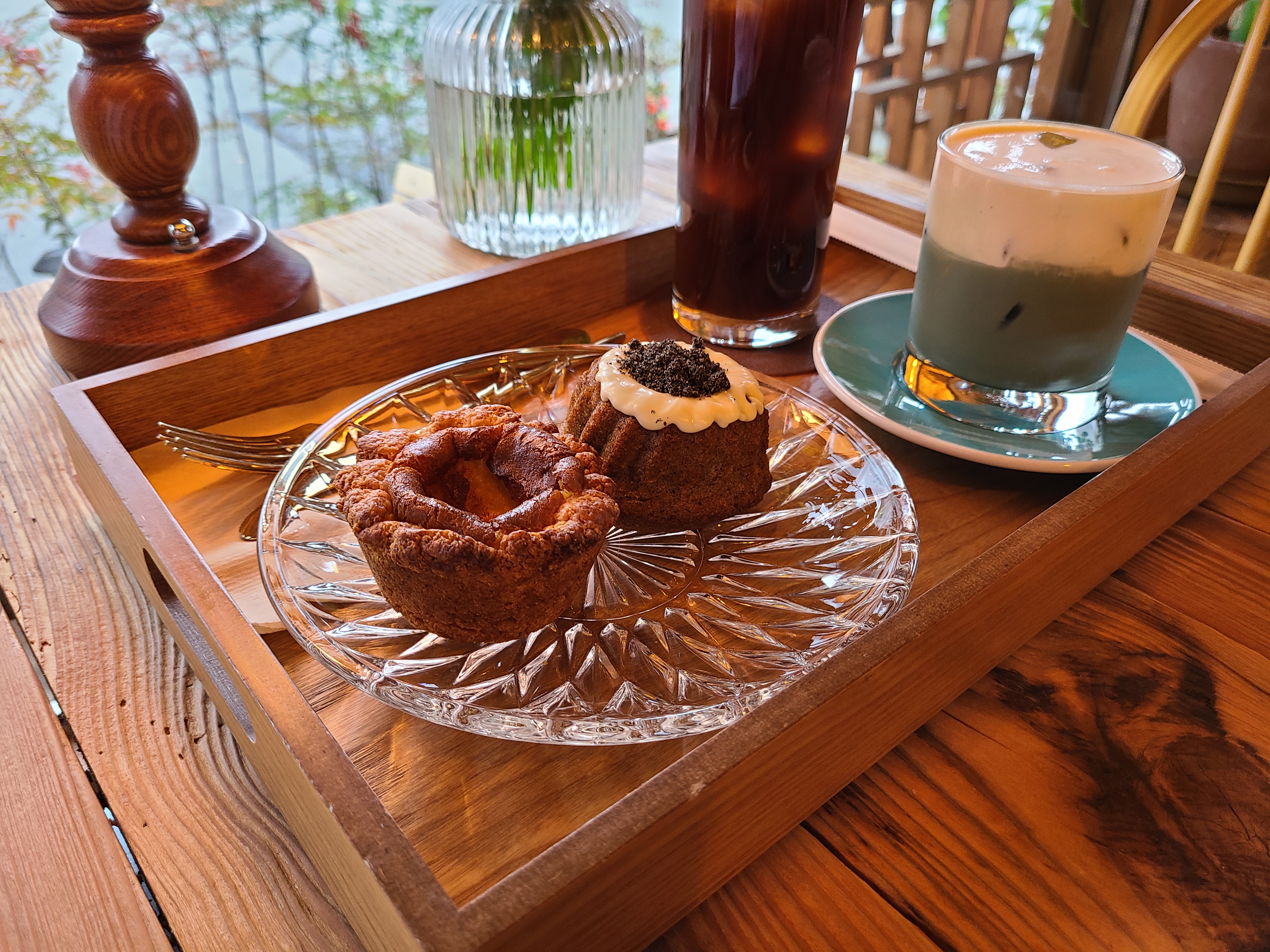 주문했던 음료와 디저트가 나왔습니다 나무트레이에 담겨 나온 음료와 디저트는 진짜 너무 이쁘네요 받자마자 사진만 연거푸 찍었던 거 같습니다 아메리카노의 경우 음료에서 약간 파향이 나더라구요 저만 그러는 거 같아 애인한테 물어봐도 똑같이 파향이 난다고 합니다 뭔가 낯선 향이었고 좋은 느낌은 아니었지만 향이 진하지 않아서 그냥 넘어갑니다