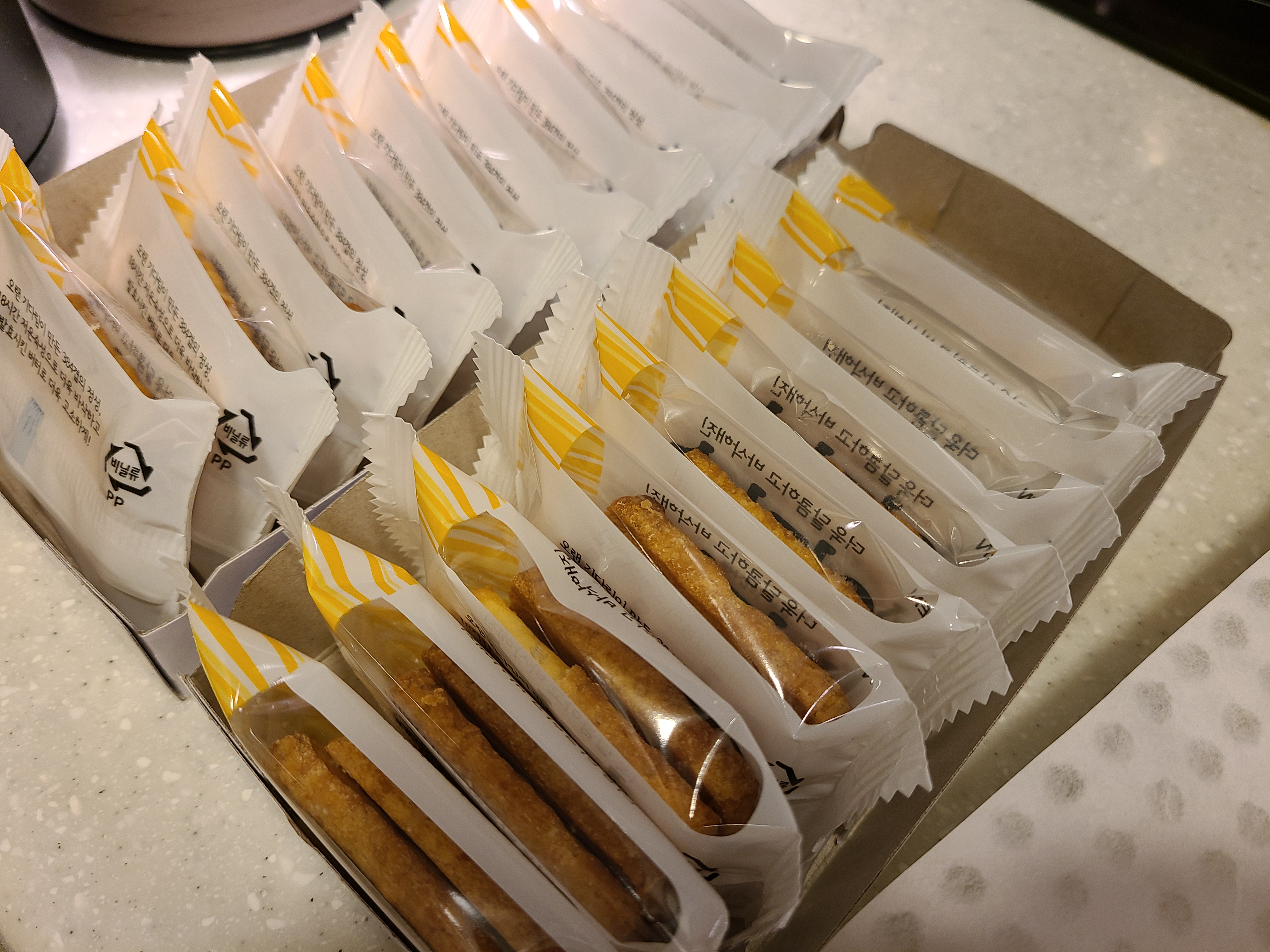 L사 빼빼로가 싫어서 직접 만들겠다는 사람이 L사 제품인 엄마손파이, 가나 초콜릿만 왕창 샀네요. 허참.. 그냥 빼빼로 살껄(?) 만들면서 느낀 건데 엄마손파이도 쿠쿠다스급으로 허약하네요. 기본적으로 과자봉지에서 안 부서져서 나올 확률이 낮고 잘 나온다 한들 초코 묻히고 포장하면서 부서집니다. 저의 멘탈도 같이 부서졌다는.. ㅋㅋ 어쨌든 정성 가득 들어간 초코 엄마손파이 만들었으니 맛있게 먹어줬으면 좋겠습니다. 아 부서진 엄마손파이는 남은 초코에 듬뿍 찍어서 다 먹었습니다. 한동안 초콜릿 안 먹고 싶네요..