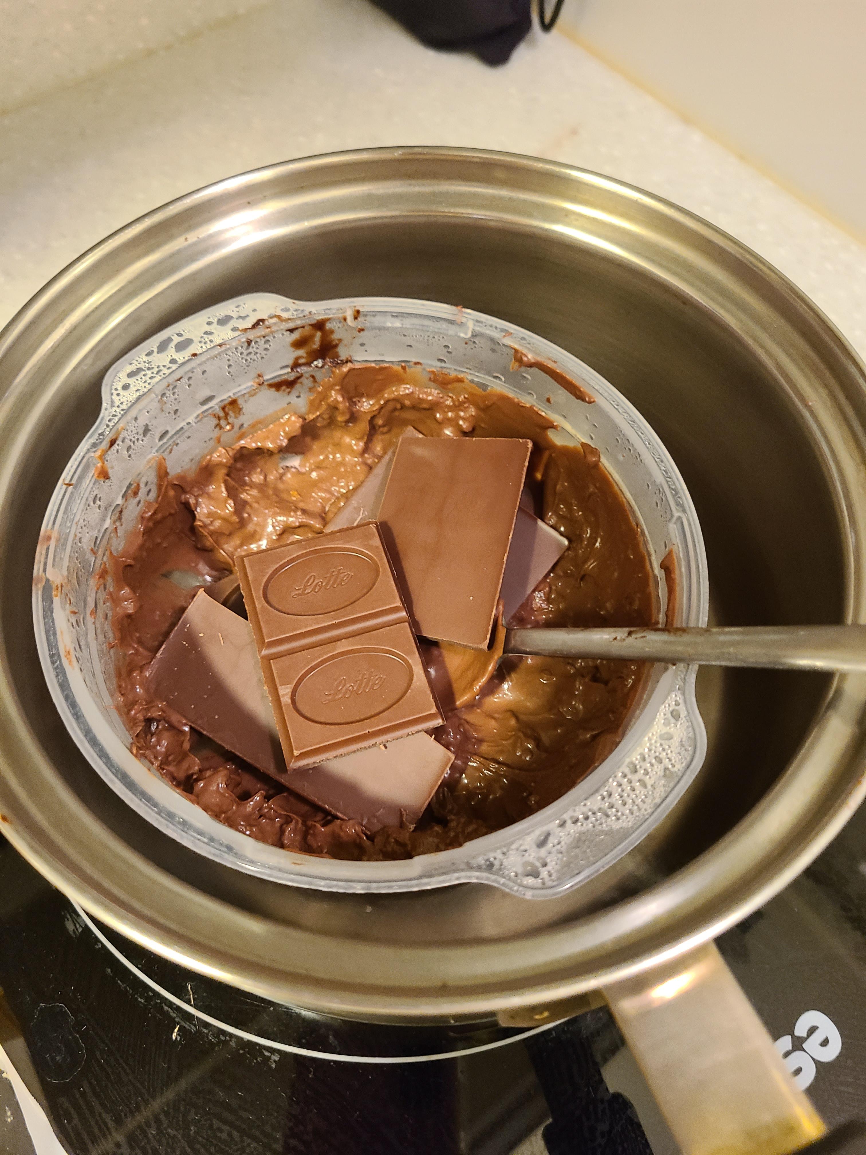 급한대로 편의점으로 뛰어갔습니다. 가서 똑같은 실수를 반복하지 않고자 인터넷 찬스를 했고 가나 초콜릿은 중탕으로 녹는다는 사실을 인지한 뒤 구매를 했습니다. 떨리는 마음으로 가나 초콜릿을 통에 넣고 중탕을 시작! 다행히 살살 녹네요. 경험상 지난번에 샀었던 녹이는 전용 초콜릿으로 할 때가 훨씬 잘 녹았고 가나 초콜릿은 그보단 잘 녹지 않는 듯합니다. 아무래도 전용 초콜릿이 녹는점이 더 낮은 거 같아요. (뇌피셜)