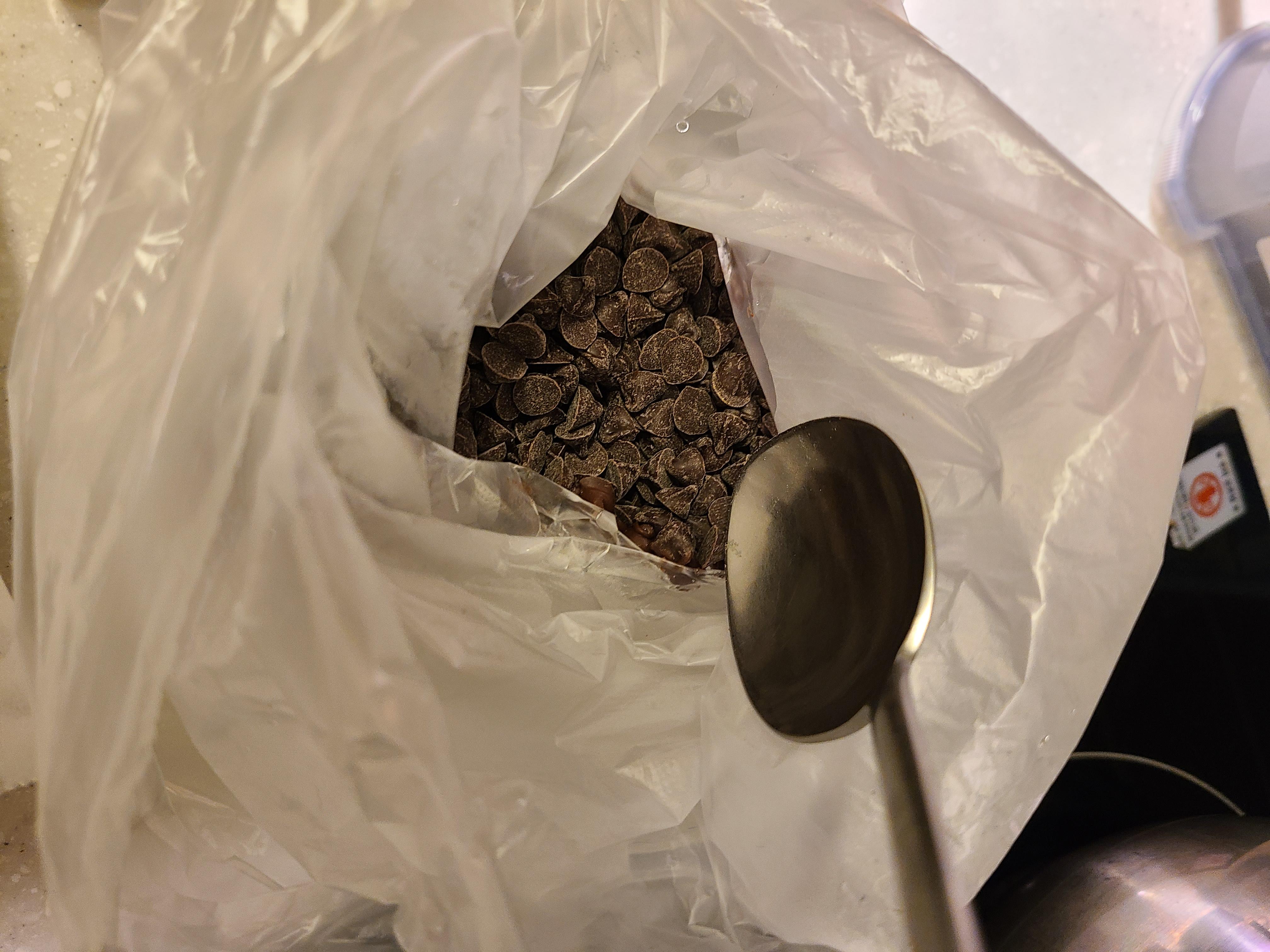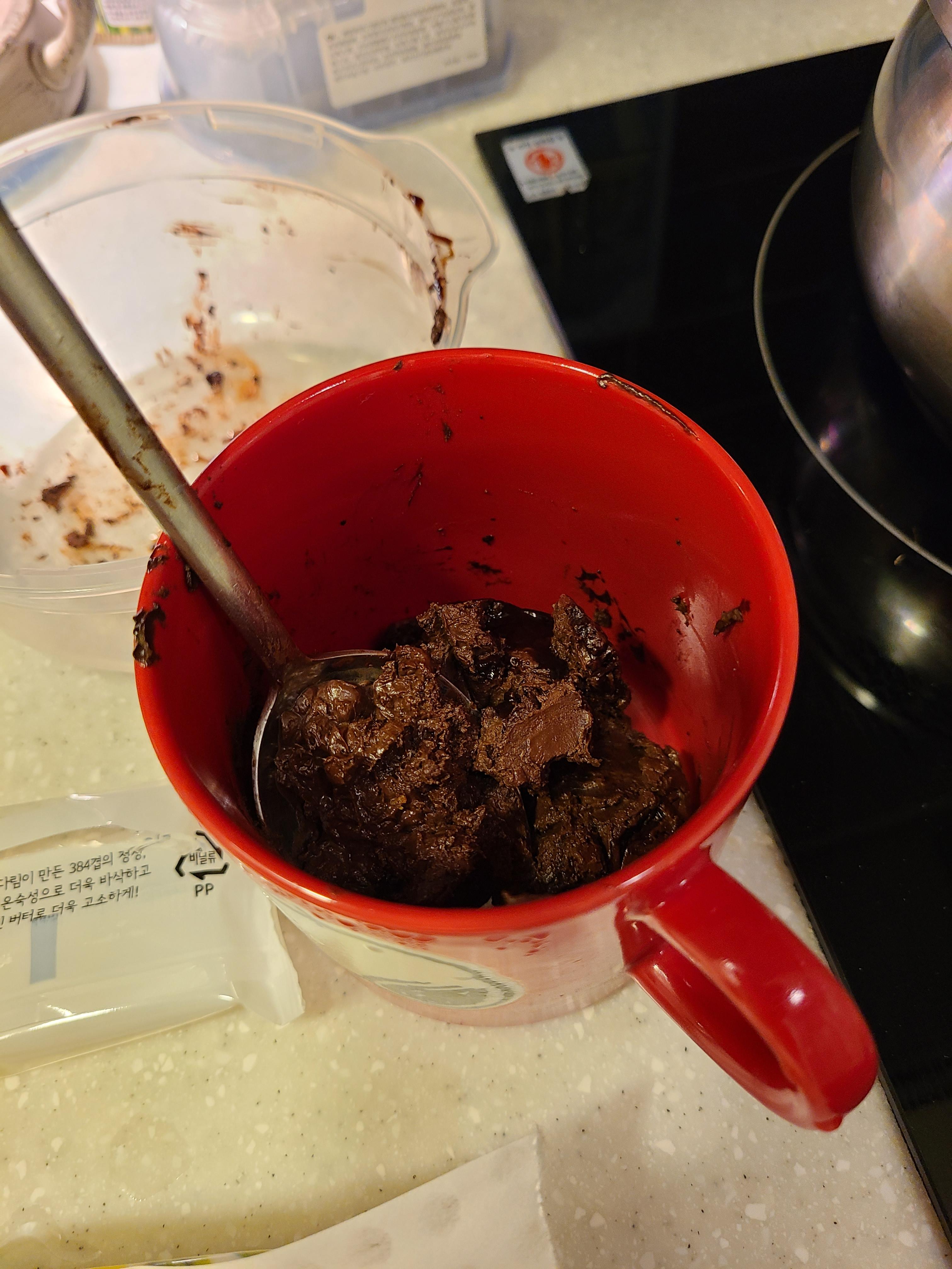 비닐에 넣고 중탕을 했는데 초코가 너무 안녹아서 그릇에 초코를 넣어봤는데도 초코가 녹지 않습니다. 급한 마음에 그릇을 통째로 끓는 냄비 속에 넣었는데 그래도 안 녹네요. 이거 무슨 일인가 싶어 심각하게 고민을 하다가 구매했던 쿠팡 후기를 찾아보니 제가 산 초코는 토핑용으로 녹이기가 안 되는 초코라고 하네요.(커버춰 초콜릿이어야 녹는다고 하네요) 녹지 않는 초코를 억지로 녹이려고 가열했더니 아~주 꾸덕한 초코 덩어리를 만들었습니다. 궁금해서 한입 먹었는데 슈가파워 제대로 옵니다ㅋㅋ