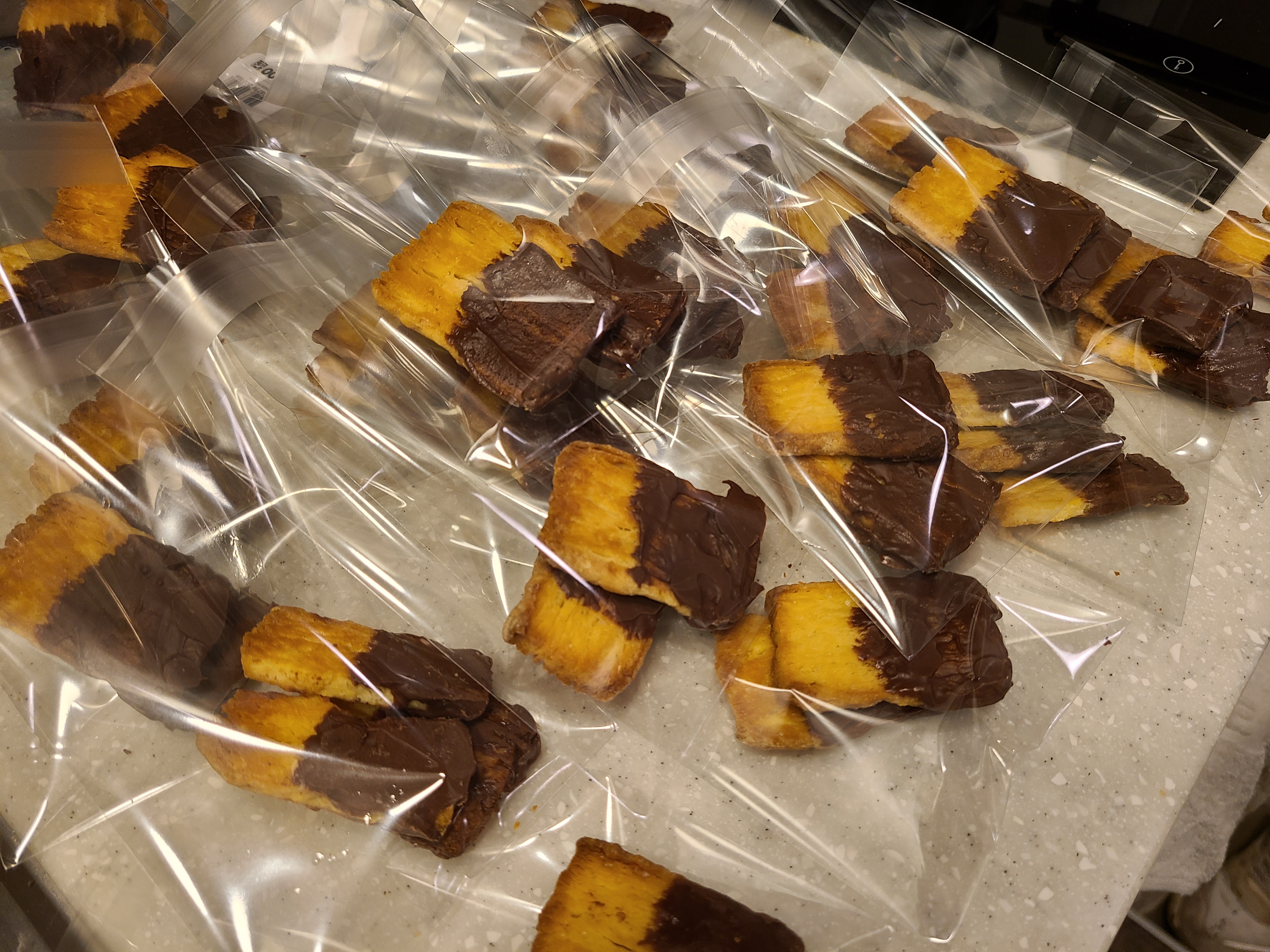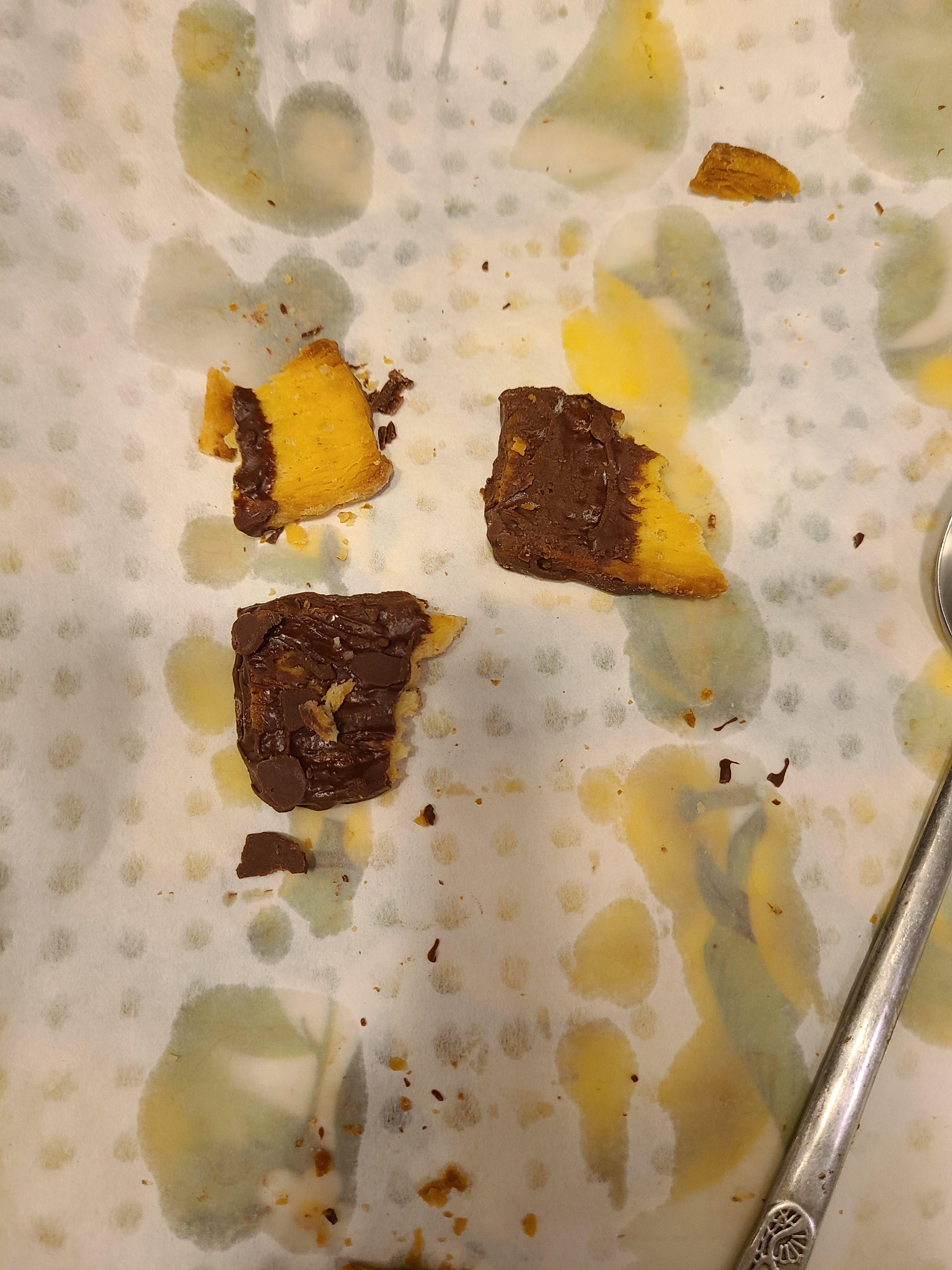 초코가 녹았으니 서둘러 엄마손파이 포장을 뜯어 묻혀주기 시작합니다. 열심히 만드느라 초코 묻히는 사진은 못찍었네요. 초코가 많으니 아주 덕지덕지 야무지게 초코를 묻혀서 굳게 만들어 줍니다. 엄마손파이가 너무 잘 부서져서 엄청 살살 묻혀야 해요.