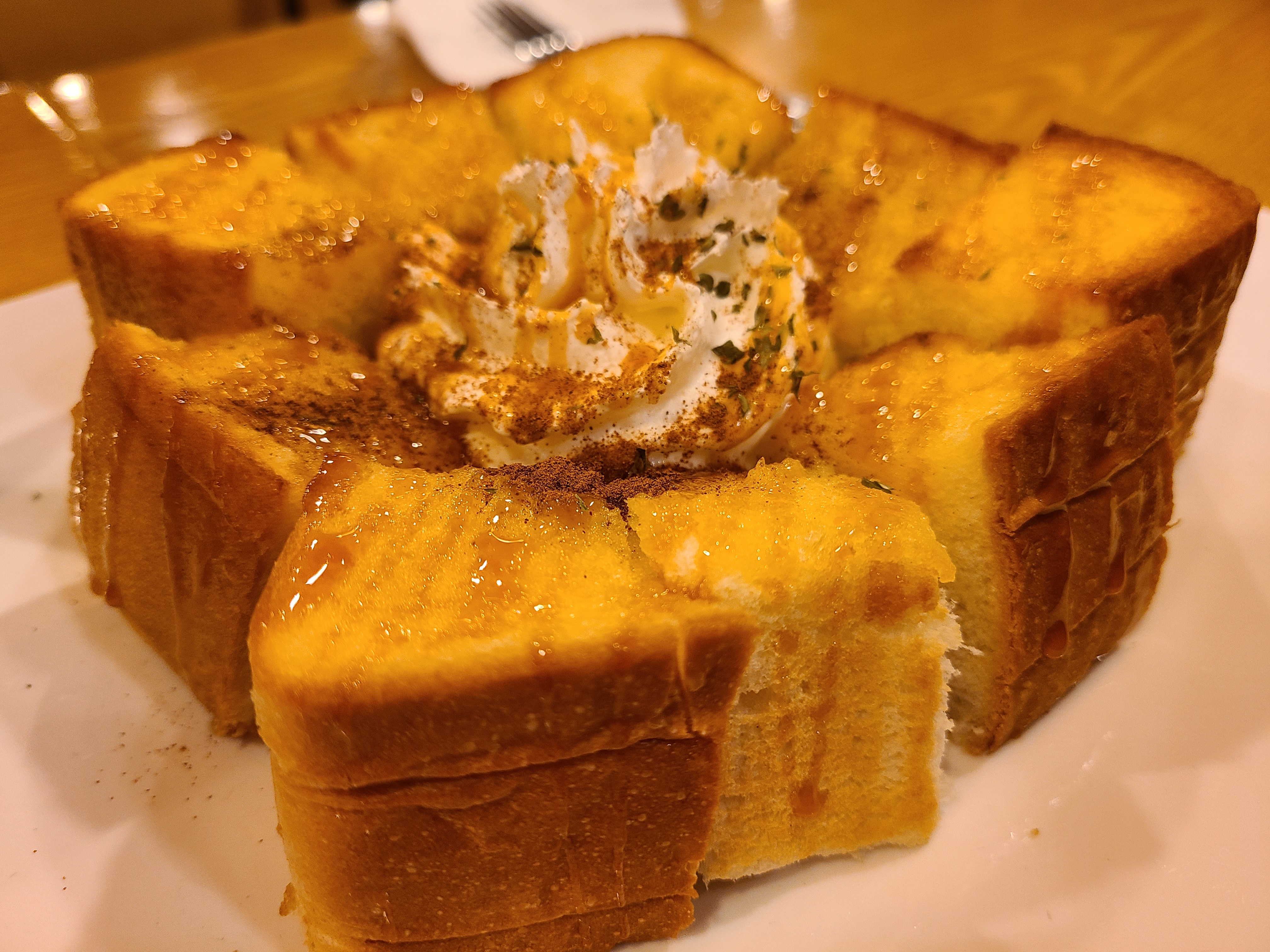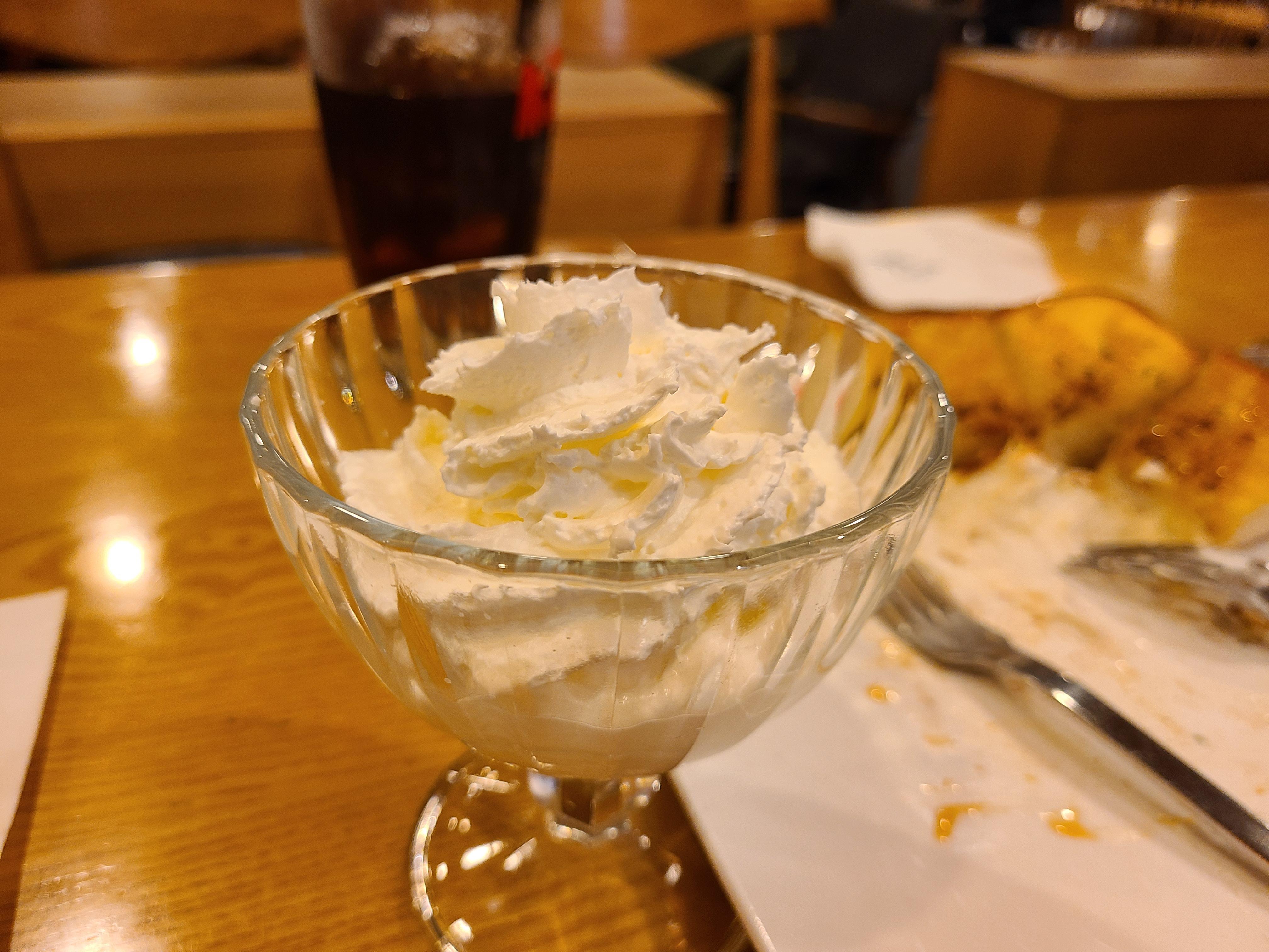 음료만 마시기 아쉬우니 허니브레드도 함께 주문했습니다. 솔직히 특색있는 맛은 아니지만 아아랑 모카랑 먹기 딱이죠. 먹다보니 생크림이 좀 부족했는데 직원분께 요청했더니 또 왕창 가져다주셨네요. 추가로 주신 거 남기는 건 예의에 벗어나기에.. 생크림 팍팍 찍어먹었습니다. 맛있고 좋네요!