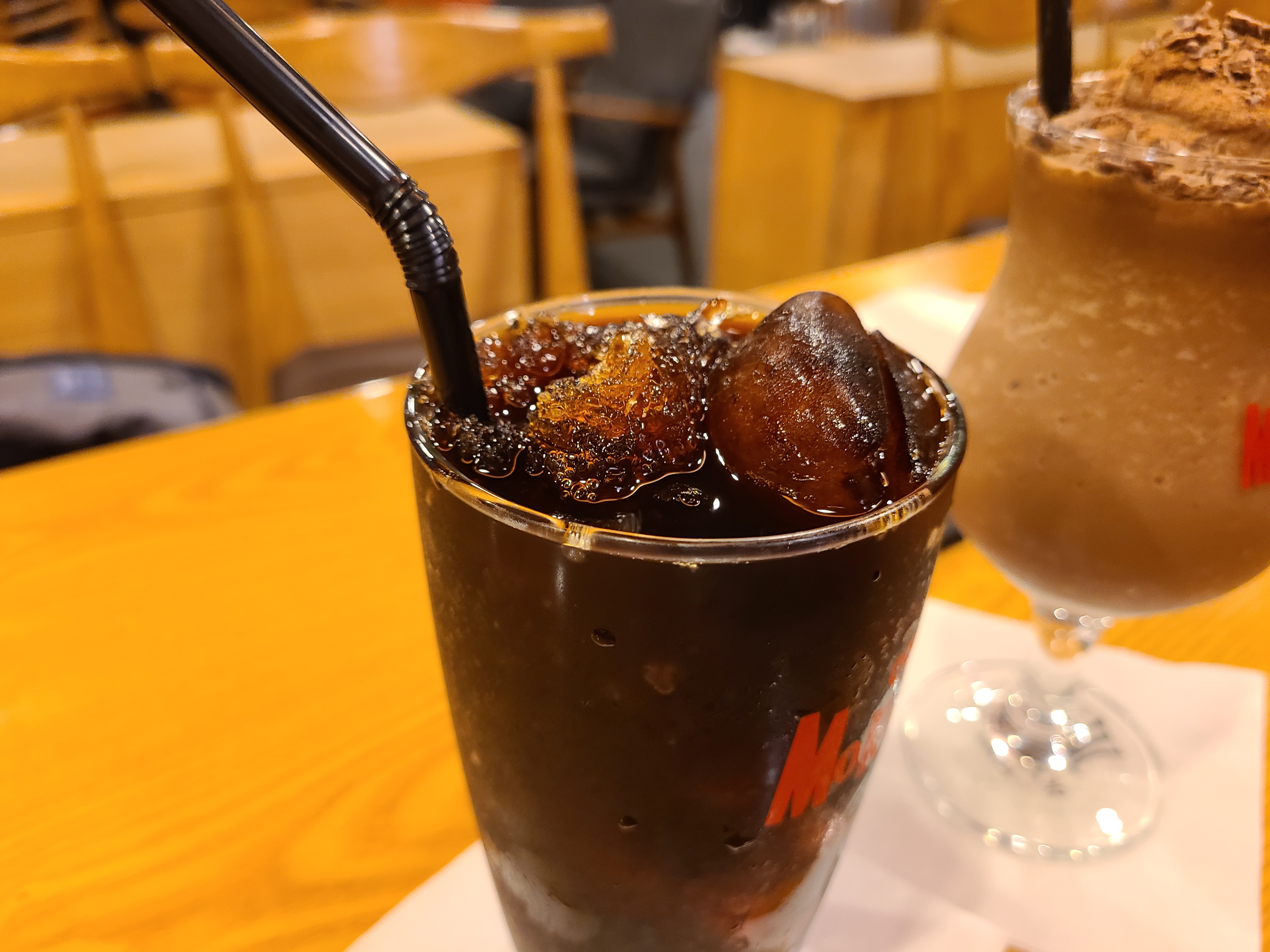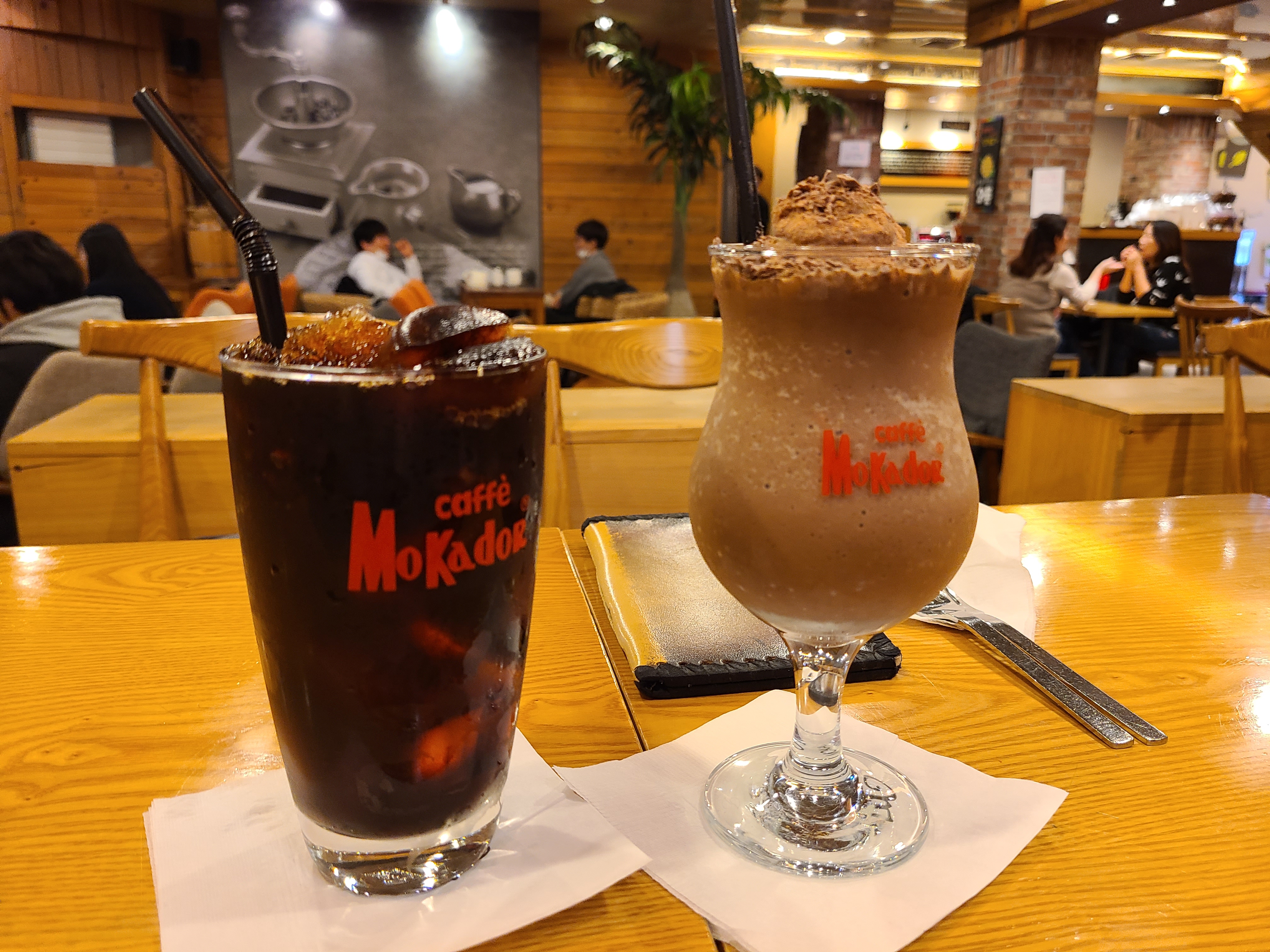 여기 오면 항상 아이스 아메리카노와 모카쉐이크만 먹는 거 같습니다. 매번 올 때마다 다음엔 다른 거 도전해야지 하면서도 항상 이걸 시키네요. 그만큼 맛있는 거겠죠? 아이스 아메리카노의 경우 얼음이 그냥 얼음이 아닌 커피얼음입니다. 모양도 커피 원두 모양의 얼음이구요. 보기만 해도 시원하고 좋습니다. 모카쉐이크는 우리가 아는 그 맛이지만 역시 달달구리한게 오늘 선택도 매우 만족합니다.