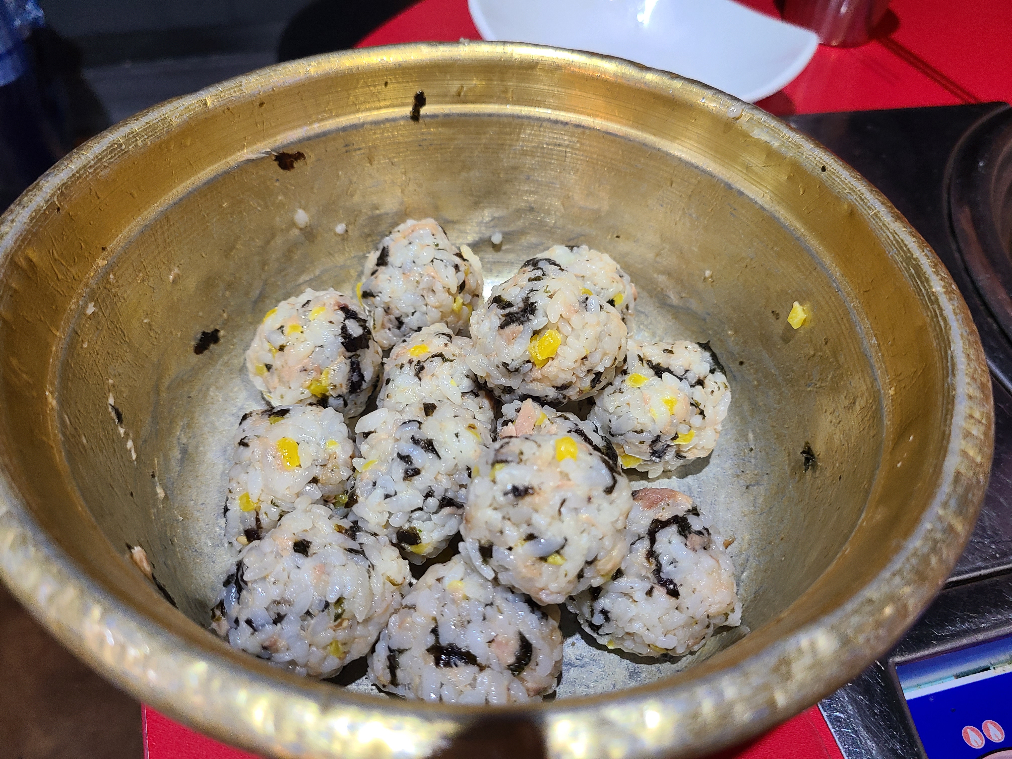 곱창이 나오기 전에 치킨마요 주먹밥부터 먼저 나왔습니다. 오랜만에 쌀밥 먹을 생각에 씬났습니다. 주먹밥 양푼과 함께 비닐장갑을 주시는데 그걸로 싹싹 비벼서 주먹밥 알맹이를 만드시면 됩니다. 물론 숟가락으로 드셔도 되지만 저는 한입 크기의 주먹밥으로 해 먹는 게 더 좋더라구요. 그래서 후다닥 주먹밥 구슬 여러 개 만들었습니다.