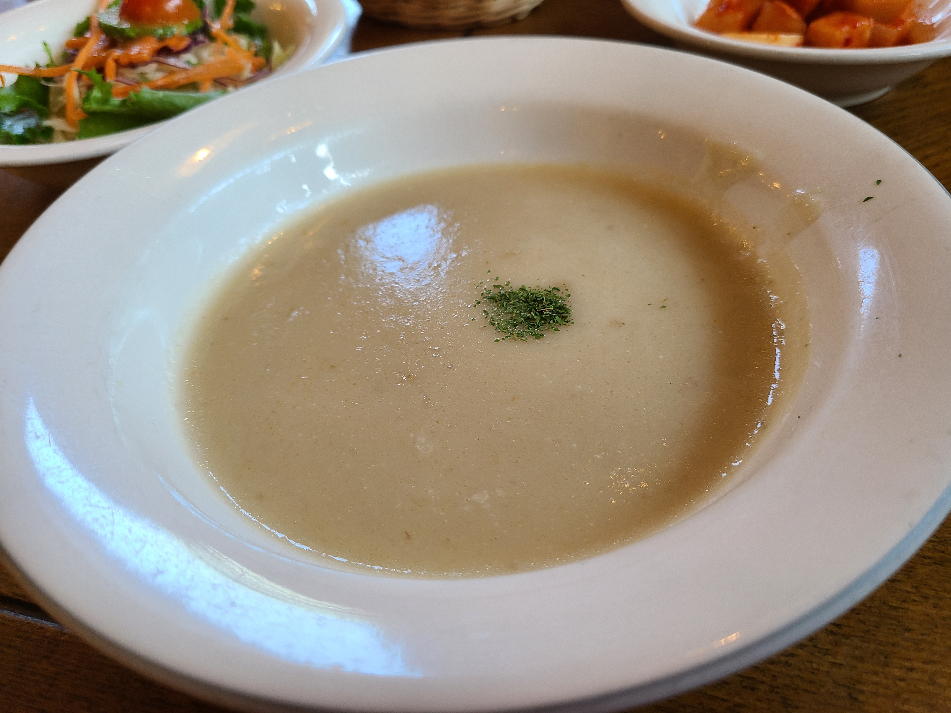 왜 애인이 고오급 식당이라고 말했는지 알 거 같은 느낌이 듭니다. 정식이 나오기 전에 수프가 나오네요. 대박... 애인 말로는 정식 아니어도 돈까스 시키면 스프나온다고 하는데 지금도 주는지는 모르겠네요. 저도 어릴 적 동네 유명한 돈까스 집가면 식전에 수프 나왔었는데 여기서도 이렇게 나오니 참 좋네요 ㅋㅋ 수프뿐만 아니라 빵도 나오고 샐러드도 나오고 심지어 스파게티도 나오네요. 식전에 깔리는 것만 봐도 충분히 만족스럽고 배부른 너낌.. 좋습니다.
