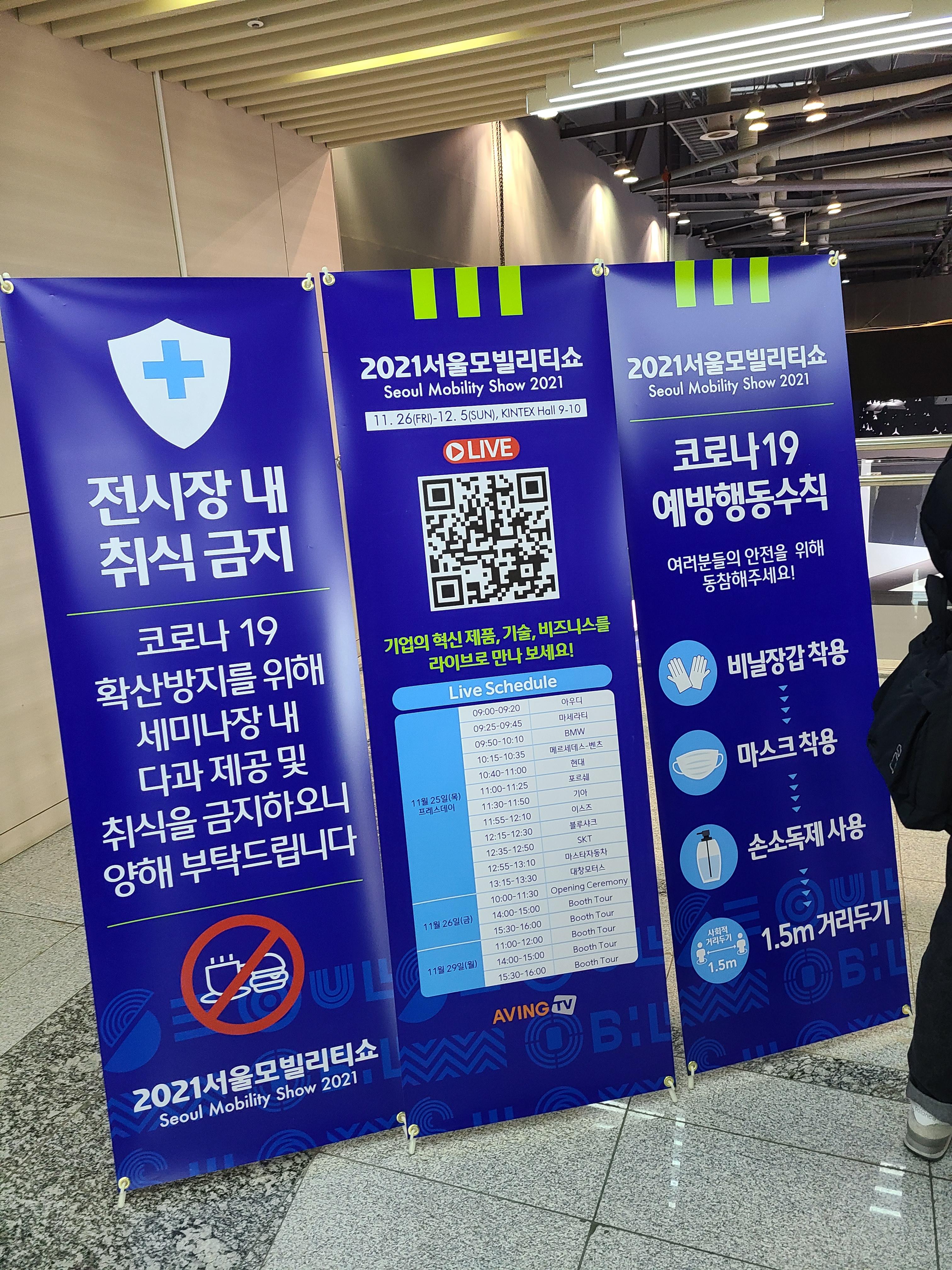 홀 내부에서는 취식이 불가하며 입장 전에 코로나 예방을 위한 안전 전화를 해야 하고 (QR 없음) 비닐장갑을 계속 착용하고 있어야 합니다. 특히 취식 불가한 부분이 문제가 될 수 있는데요, 모터쇼를 다녀보신 분들은 아시겠지만 전시장 안에서 간식도 팔고 다과도 주고 하는 경우가 많았었는데 올해는 일절 없습니다. 사먹을 곳도 없어요. 문제는 퇴장 후 재입장이 안 되는 것인데 배고프다고 잠깐 나올 수가 없다는 말이에요. 입장 전에 반드시 식사하고 들어가시길 바래요!