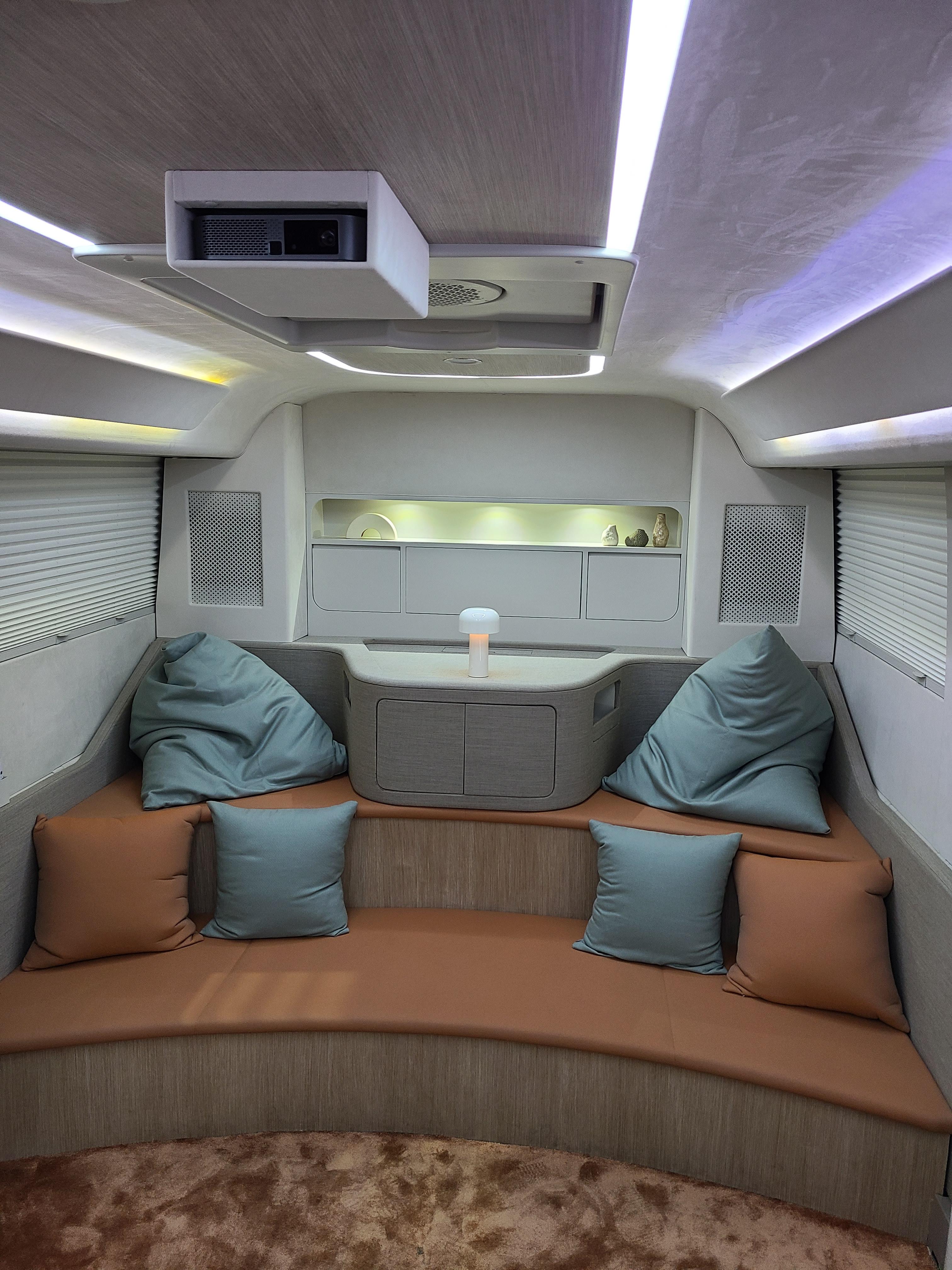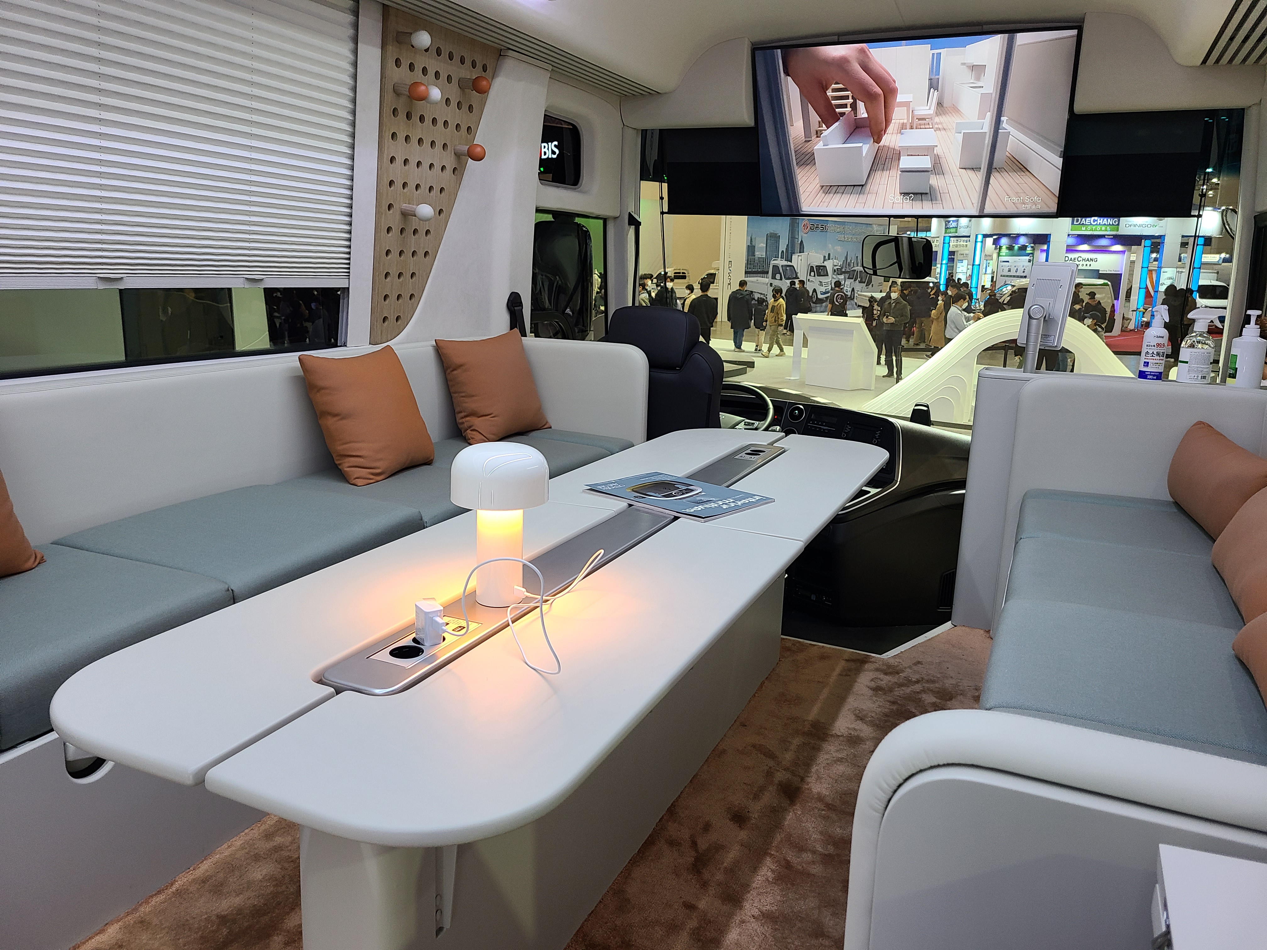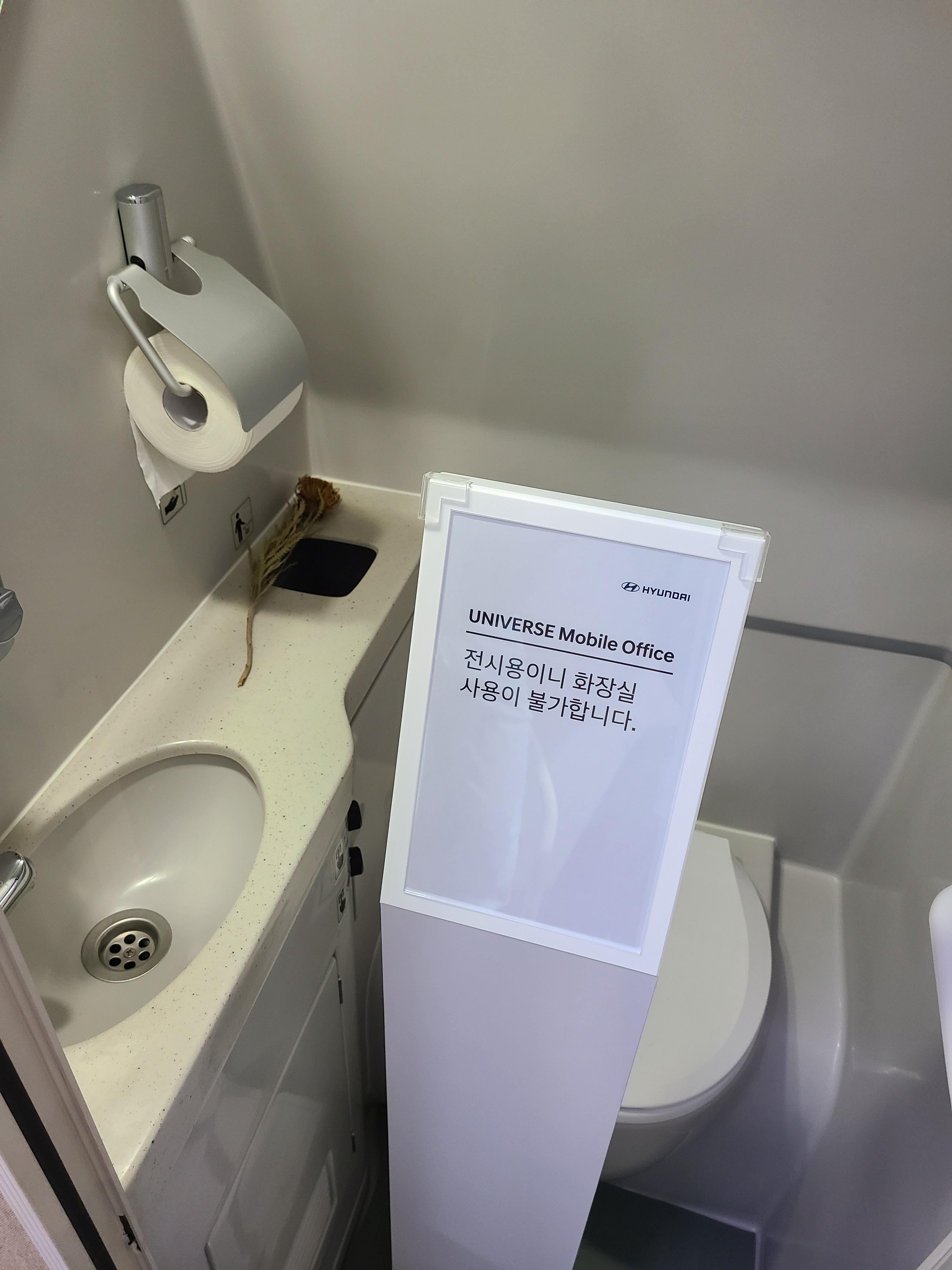 그 뒤로는 미디어 공간이 있는데 계단식 형태로 의자가 있는데 엄~~청 딱딱해요. 팍 앉았다가 허리 나갈 뻔... 조심하세요! 의자 앞에는 빔프로젝터와 스크린이 있습니다. 얼마나 실효성 있는지는 모르겠지만 다들 이런 판타지들은 있잖아요 ㅋㅋㅋ 갖고 싶었습니다. 버스 내리는 곳 좌측에는 조그만 화장실이 있었는데 비행기 기내 화장실이라 생각하시면 됩니다. 그보다 훨~씬 작긴 하지만, 없는 것보단 나으니까요 ㅋㅋㅋ 전시차에서는 화장실 이용이 불가합니다.