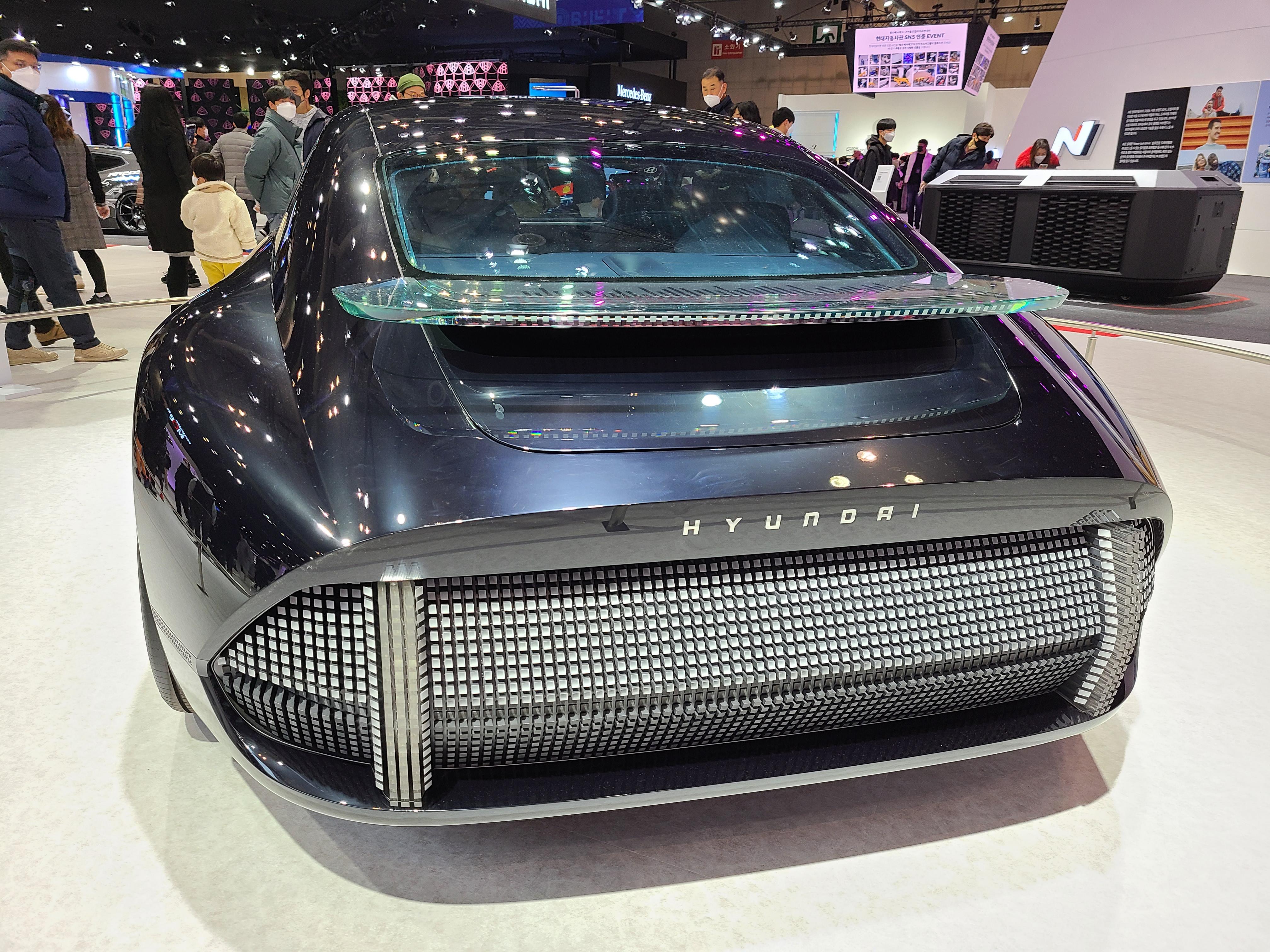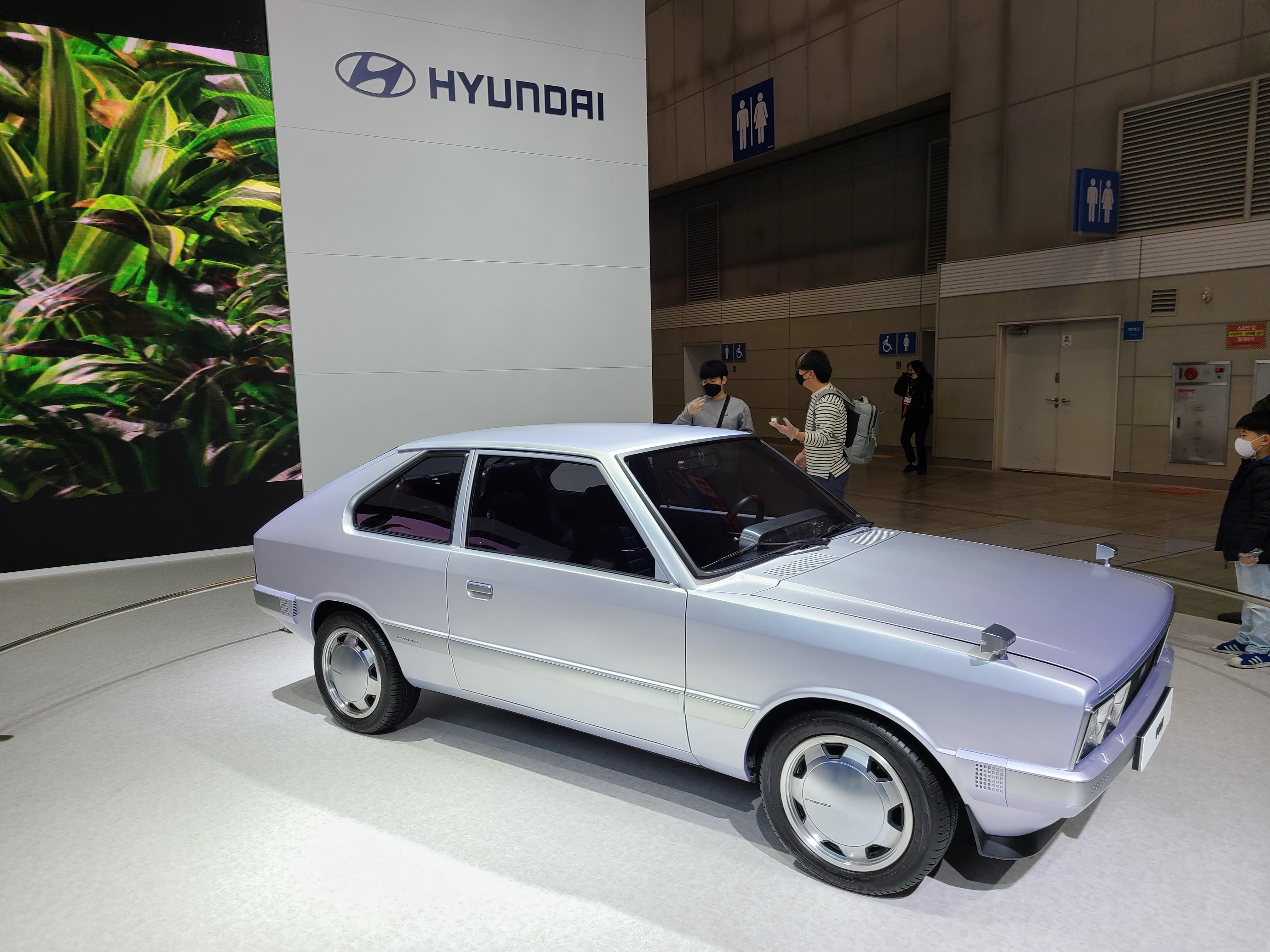 다 아는 차만 있다보니 현대차 부스에서는 색다른 것 위주로 구경을 했는데요, 포니를 다시 디자인한 차량이 있었고 그 옆에는 이름 모를 전시차가 있었어요. 리어쪽만 인상 깊어서 사진 찍었는데 이름이 기억나질 않네요 ㅋㅋㅋ