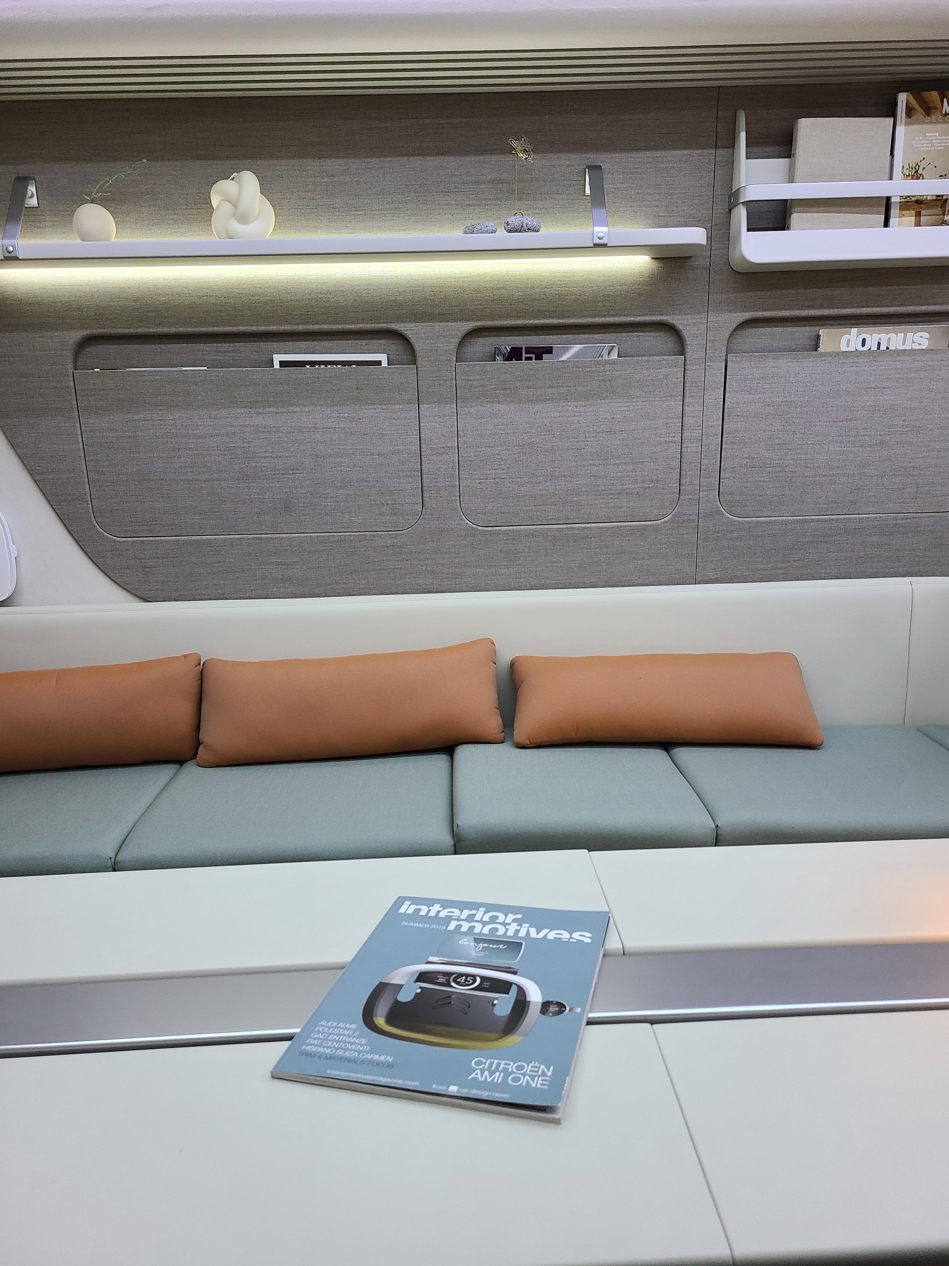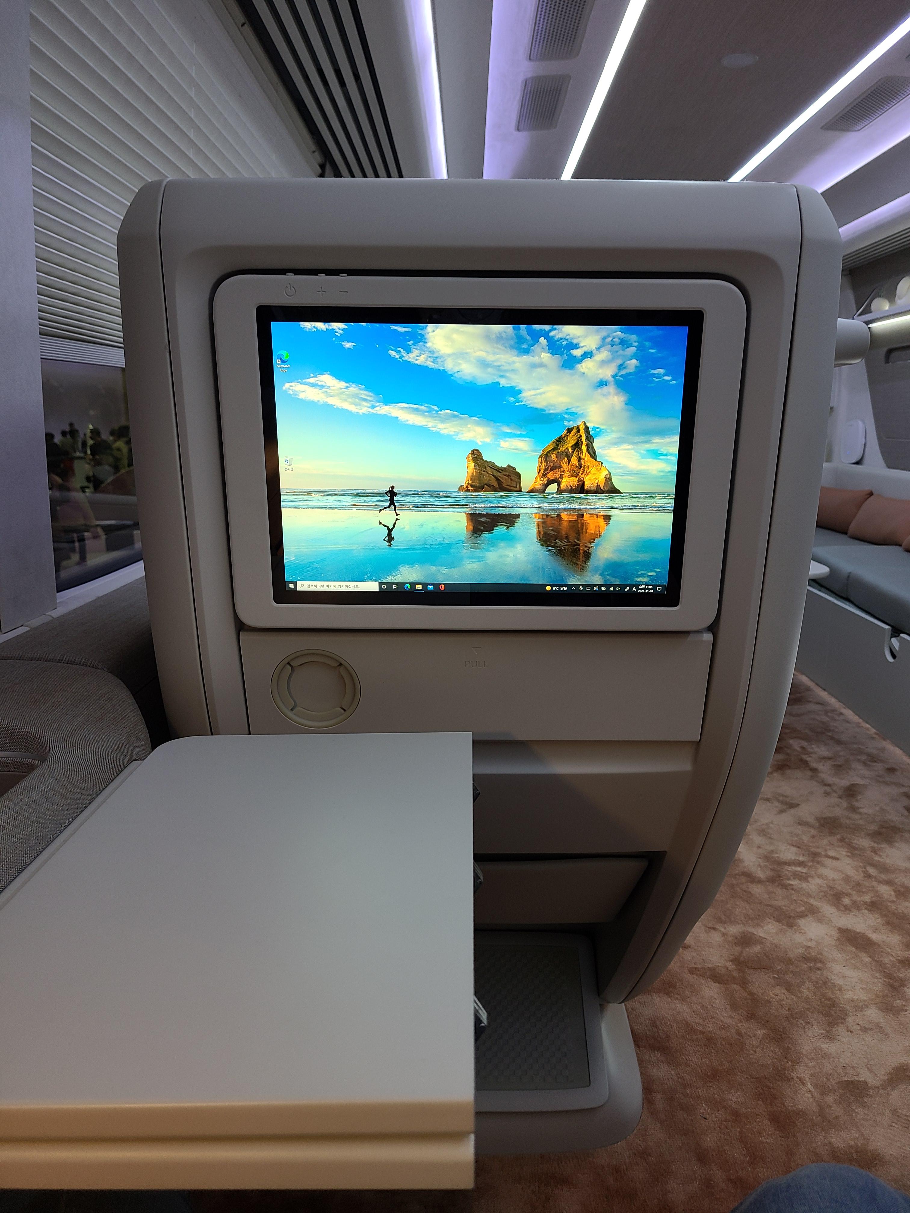 그 뒤에는 개인 공간이 있는데 비행기 좌석 + 버스 우등석 합쳐놓은 느낌입니다. 의자는 버스 우등석인데 앞에 모니터가 있어서 활용할 수가 있겠어요. 실제 OS가 무엇일지는 모르겠으나 전시차에는 윈도우즈네요. 암튼 의자는 참 편했습니다.