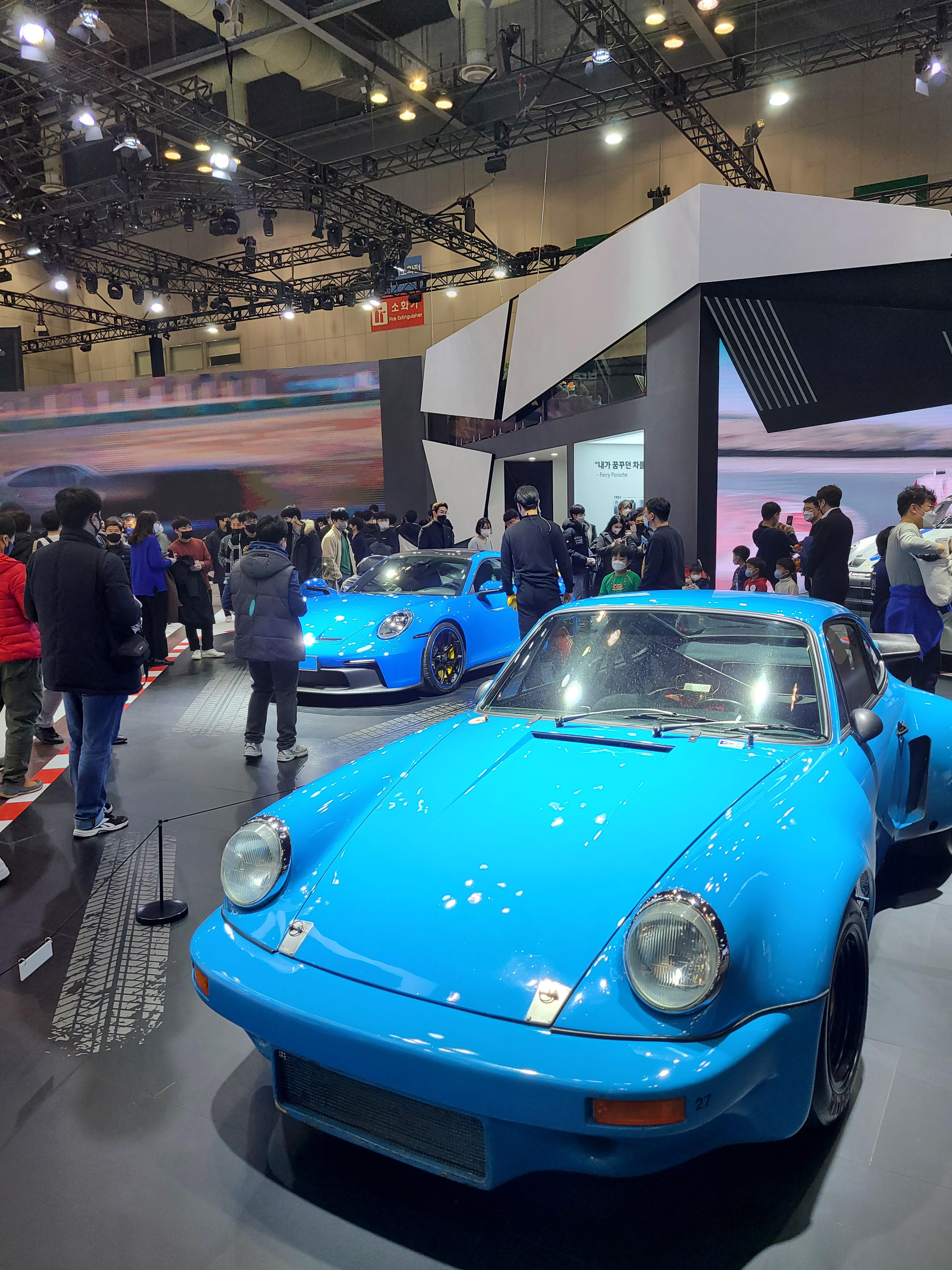 애인과 가장 많은 시간을 구경했던 부스는 포르쉐인 듯합니다. 시작부터 파란 개구리 두 마리가 반겨주는데 하나는 클래식인 듯하고 하나는 최근 모델인 듯했습니다. 두 퍼랭이 모두 뭐하나가 특출나게 이쁘다고 말하지 못할 만큼 둘 다 매력있고 멋있었어요. 특히 클래식 모델의 스포일러가 상당히 요상한데, 마치 고래 꼬리마냥 커다랗게 뒤에 달려있던 게 기억에 남습니다.