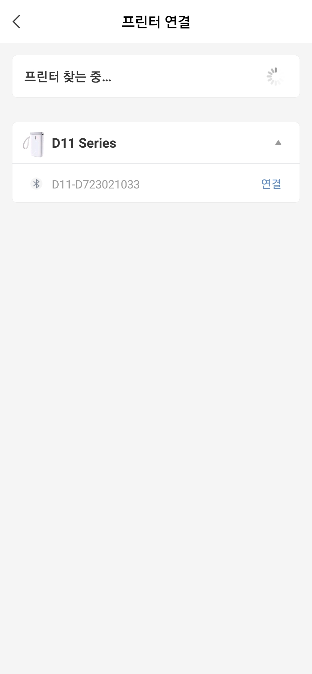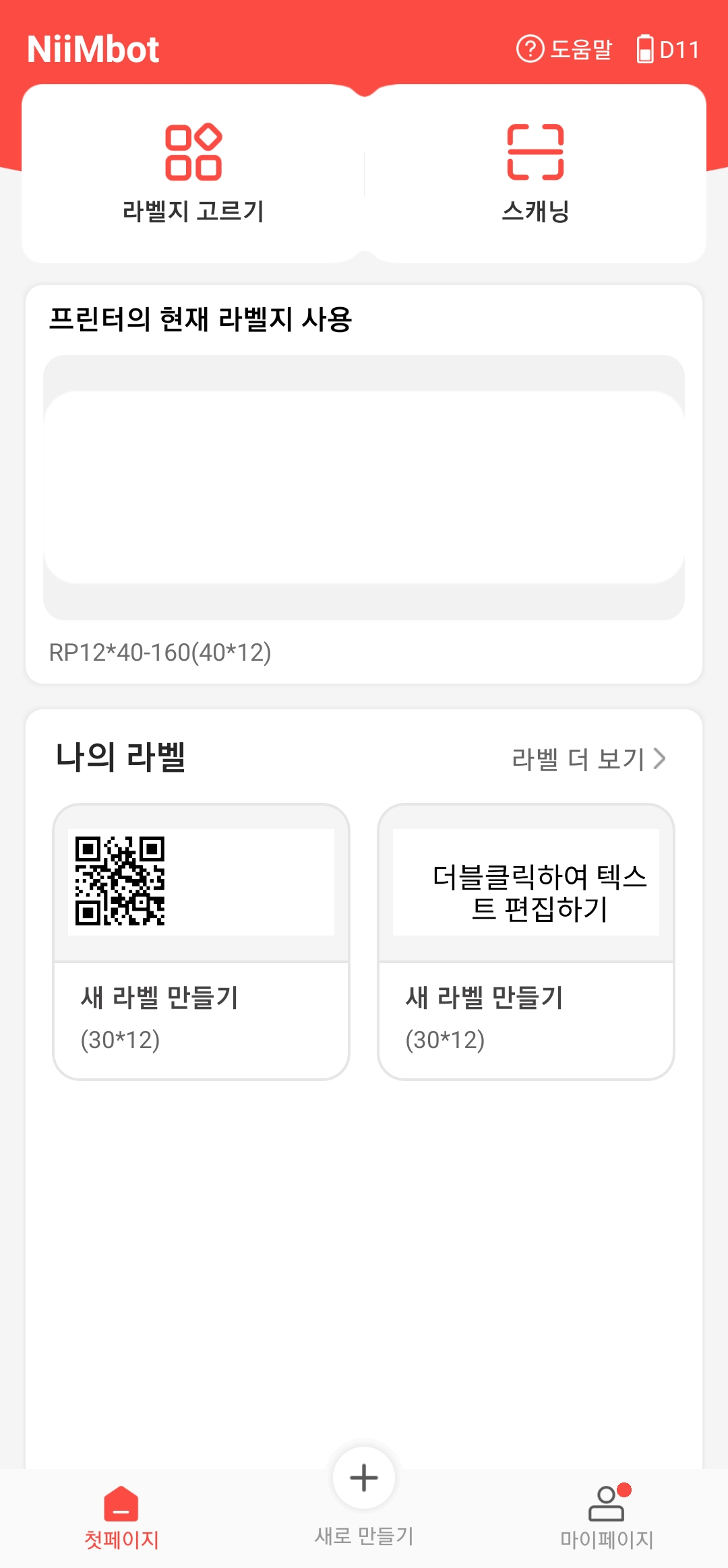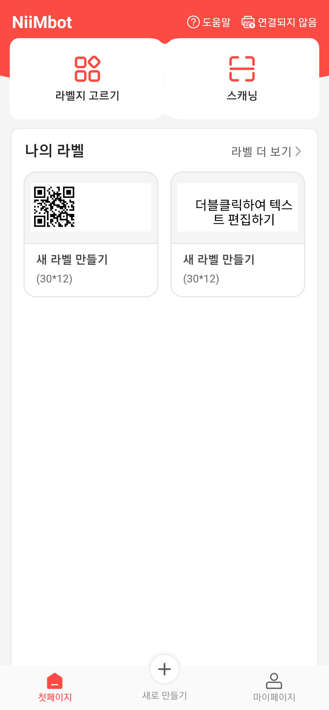 그전에 어플 스토어에서 NiiMbot 어플을 다운 받아야해요. 전용 어플이 있는데 한글 지원돼서 어렵지 않습니다. 연결이 되면 우측 상단에 D11 이란 글자와 배터리 용량이 보여요. 지금은 연결이 안돼서 '연결되지 않음'이라고 뜹니다.