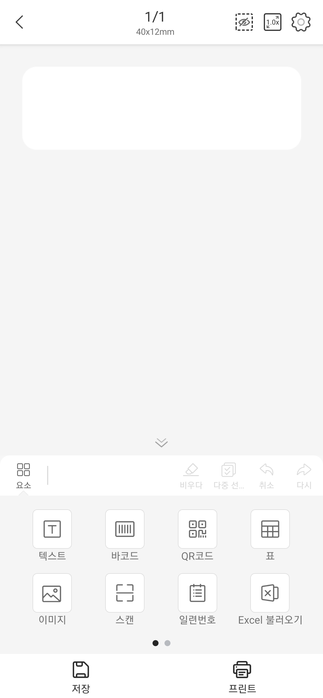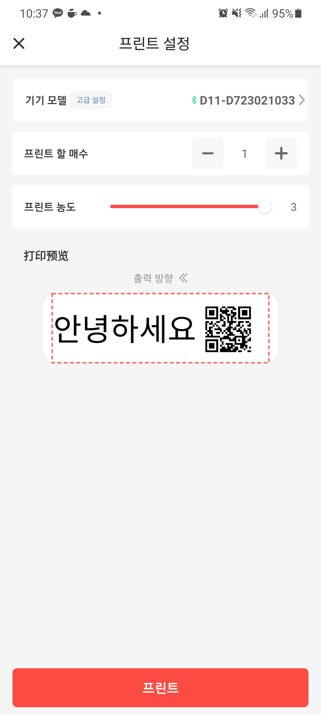인쇄지 종료는 기기에서 자동으로 인식해서 별도로 선택해줄 필요는 없어요. 어플에 다양한 기능들이 있는데 대부분 텍스트 넣는 것이 가장 많이 쓸 기능이라 테스트용으로 작성해봤어요. 추가로 QR코드 작동 여부를 확인하기 위해 제 블로그 주소로 QR코드 만들어서 함께 인쇄해봤어요. 다 작성하면 인쇄하기 전에 미리보기도 볼 수 있으니 마지막 확인을 해보고 인쇄하면 됩니다.