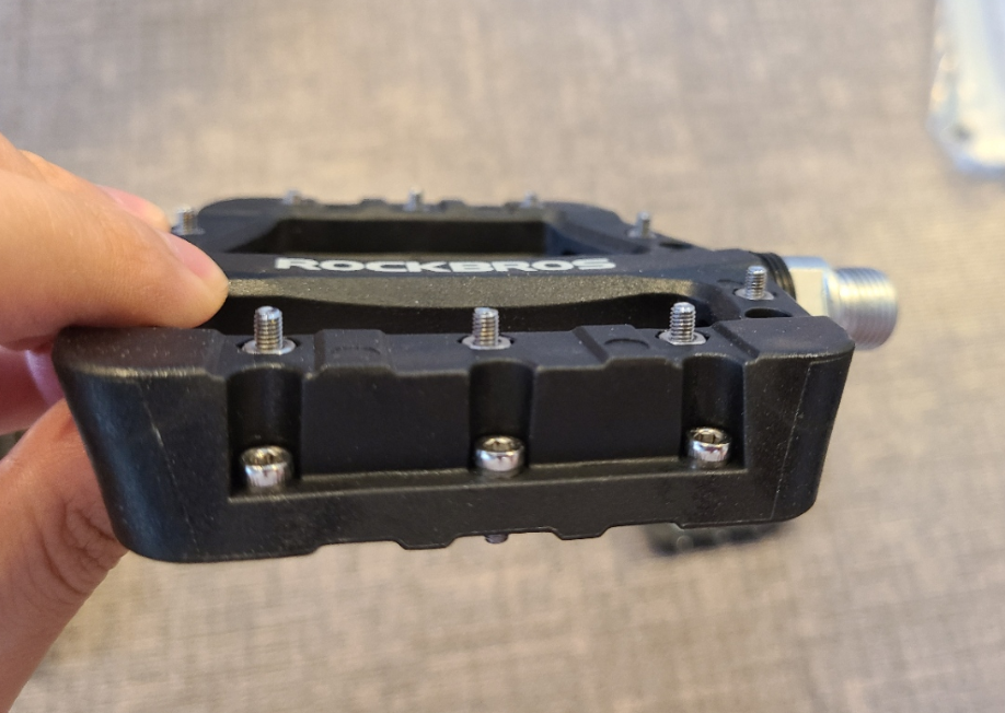페달의 특징이자 장점은 넓고, 나사로 인해 접지력이 크다는 점입니다. 페달이 넓어봤자 무슨 의미가 있겠어 싶었는데 넓으니까 확실히 편하네요. 오버해서 말하면 콜라캔 위에 밟고 서있다가 널찍한 나무판자를 딛고 서있는 느낌? ㅋㅋㅋㅋ 무튼 발이 편해요. 근데 반대로 말하면 그만큼 무게가 꽤 무거워요. 로드자전거처럼 무게에 민감하신 분들은 경량화된 거 구매하시면 되고 저처럼 마실용 자전거면 락브로스 페달 좋습니다. 그리고 나사산이 페달면에 나와있어서 발을 확실하게 지지해줍니다. 일반 페달에서도 미끄러진 적은 없었지만 이건 발이 거의 고정된 느낌? 넓은 페달 면적이 고정된 느낌을 주니까 뭔가 더 치고 나가는 기분이 들어요. (물론 기분 탓입니다.)