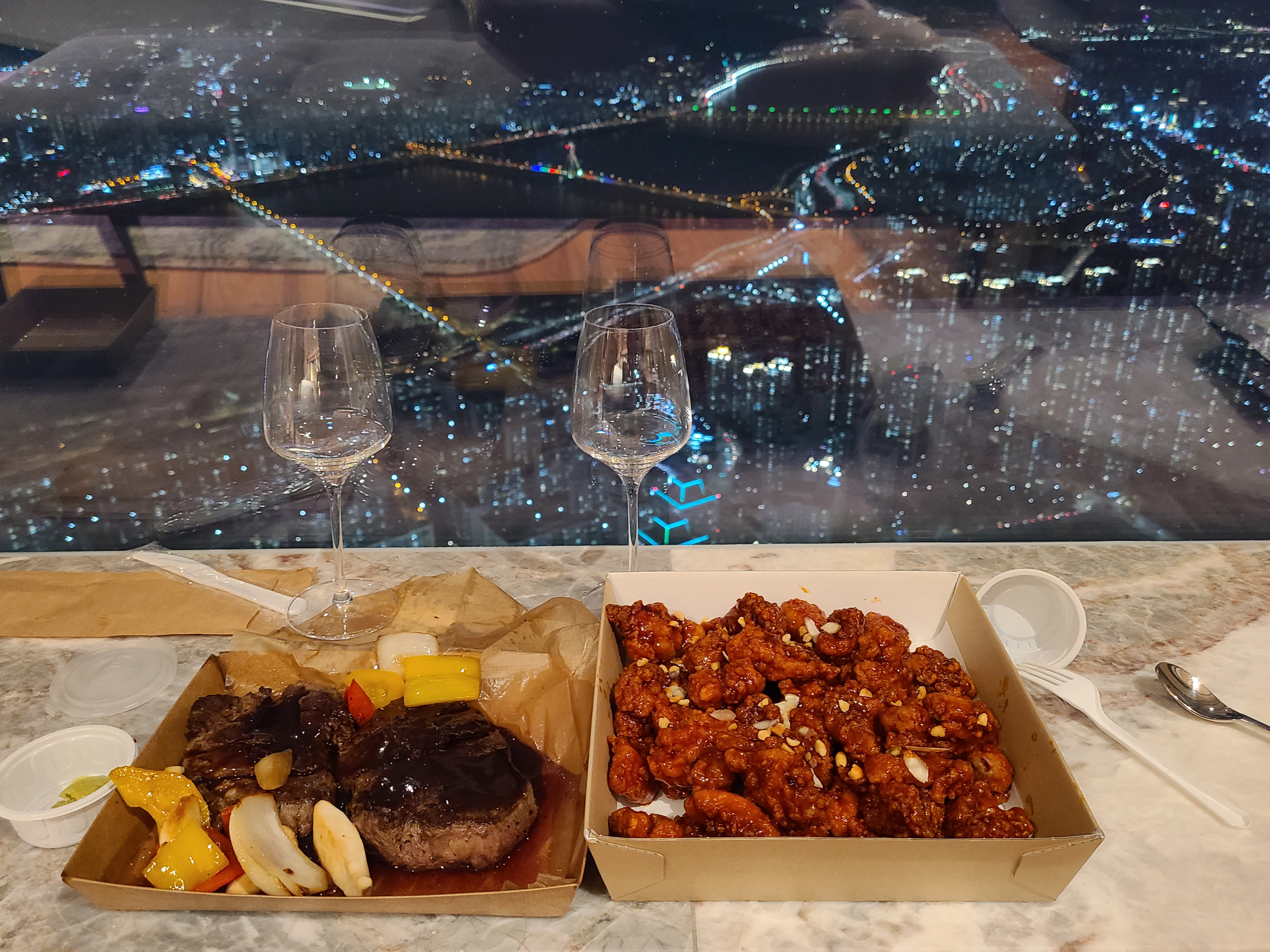 숙소로 가져온 스테이크와 닭강정을 펼치고 뷰멍과 함께 식사시간을 즐겼습니다. 가져오는 동안 스테이크가 조금 식긴 했으나 양도, 맛도 만족스러웠고 닭강정은 양이 너무 많아서 오히려 남았어요. 물론 진짜 맛있어요. 닭강정 맛없기 힘들죠 ㅋㅋㅋㅋ