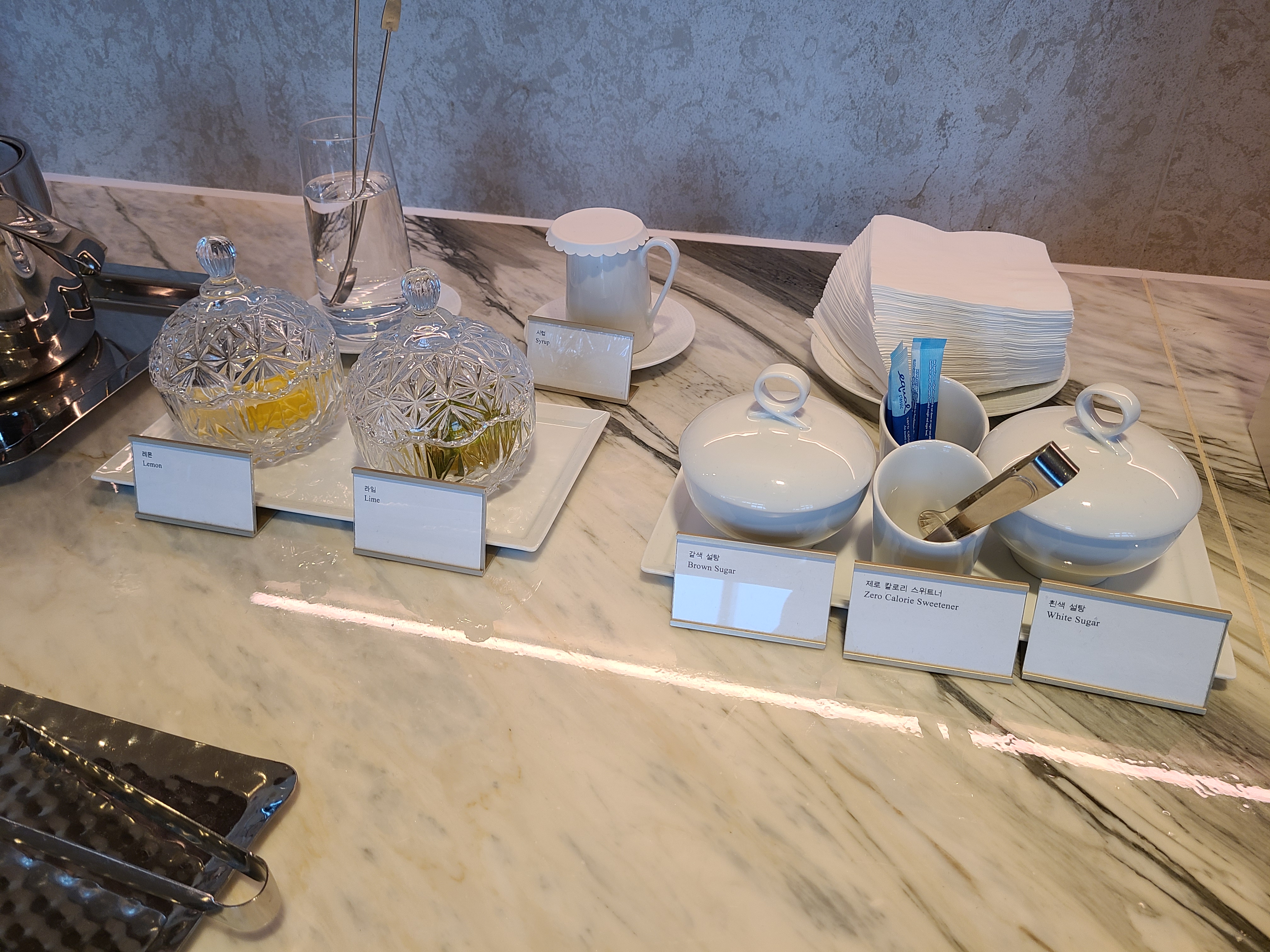 1차가 끝났을 무렵 다시 한번 쓰윽 돌아보며 사진을 찍어봤어요. 냉장고에는 다양한 탄산음료들이 있고 티테이블에도 종류가 많았습니다. 저는 차를 좋아하지 않아 자세히 보지도 않고 바로 패스!
