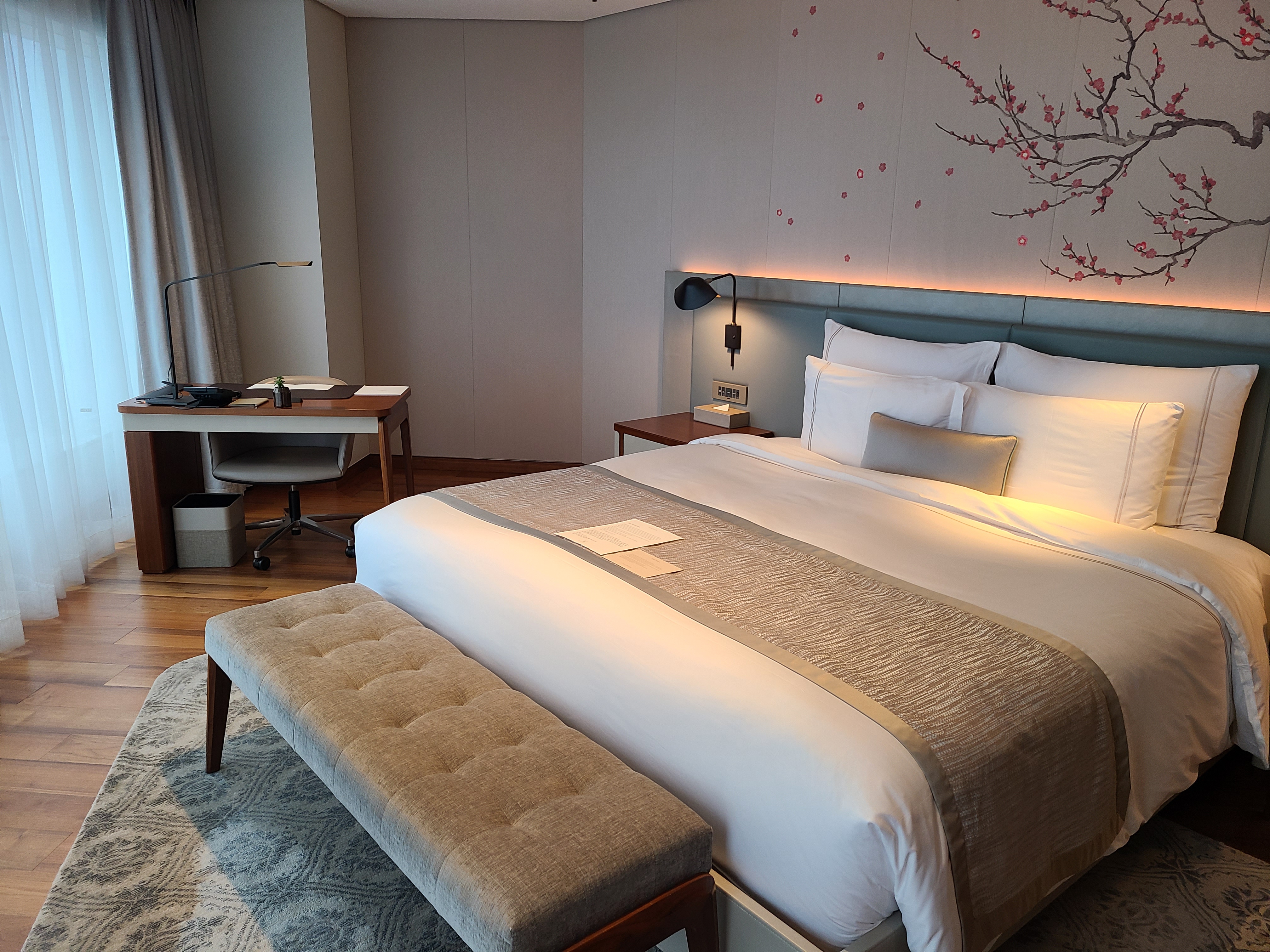 그리고 드디어 침대방이에요. 벽에는 인터넷에서 자주 봤던 매화꽃이 그려져 있네요. 매화그림도 있지만 이중 몇 개는 수놓은 거라 깜놀했어요. 아주 큰 사이즈의 푹신한 침대 앞에는 한강이 보입니다. 사실 침대에 누우면 각도가 안 나와서 한강이 보이지 않고 하늘만 보여요. 그래서 구경하려면 창가 앞으로 가야 합니다. 너무 높아서 생기는 단점(?)