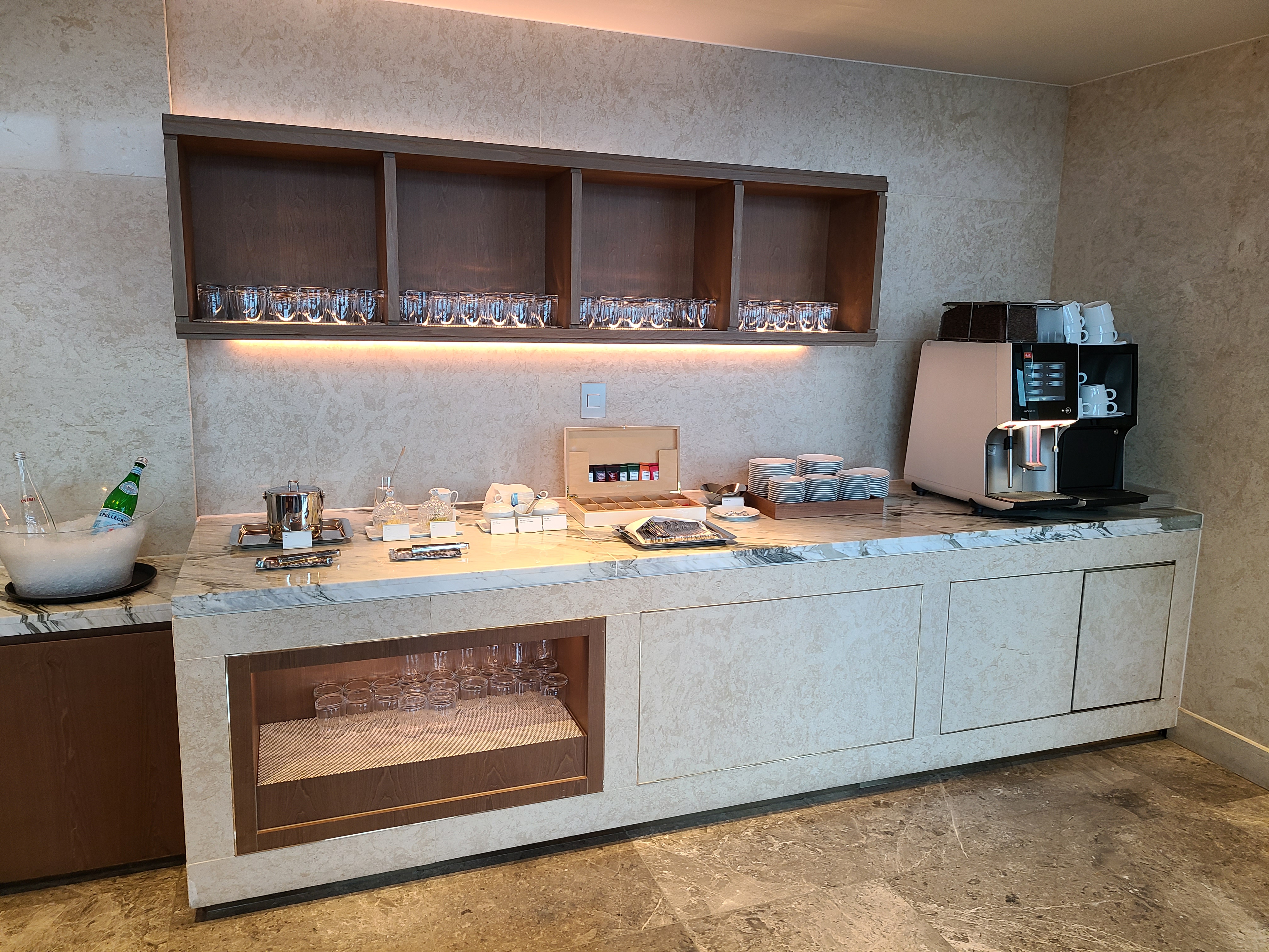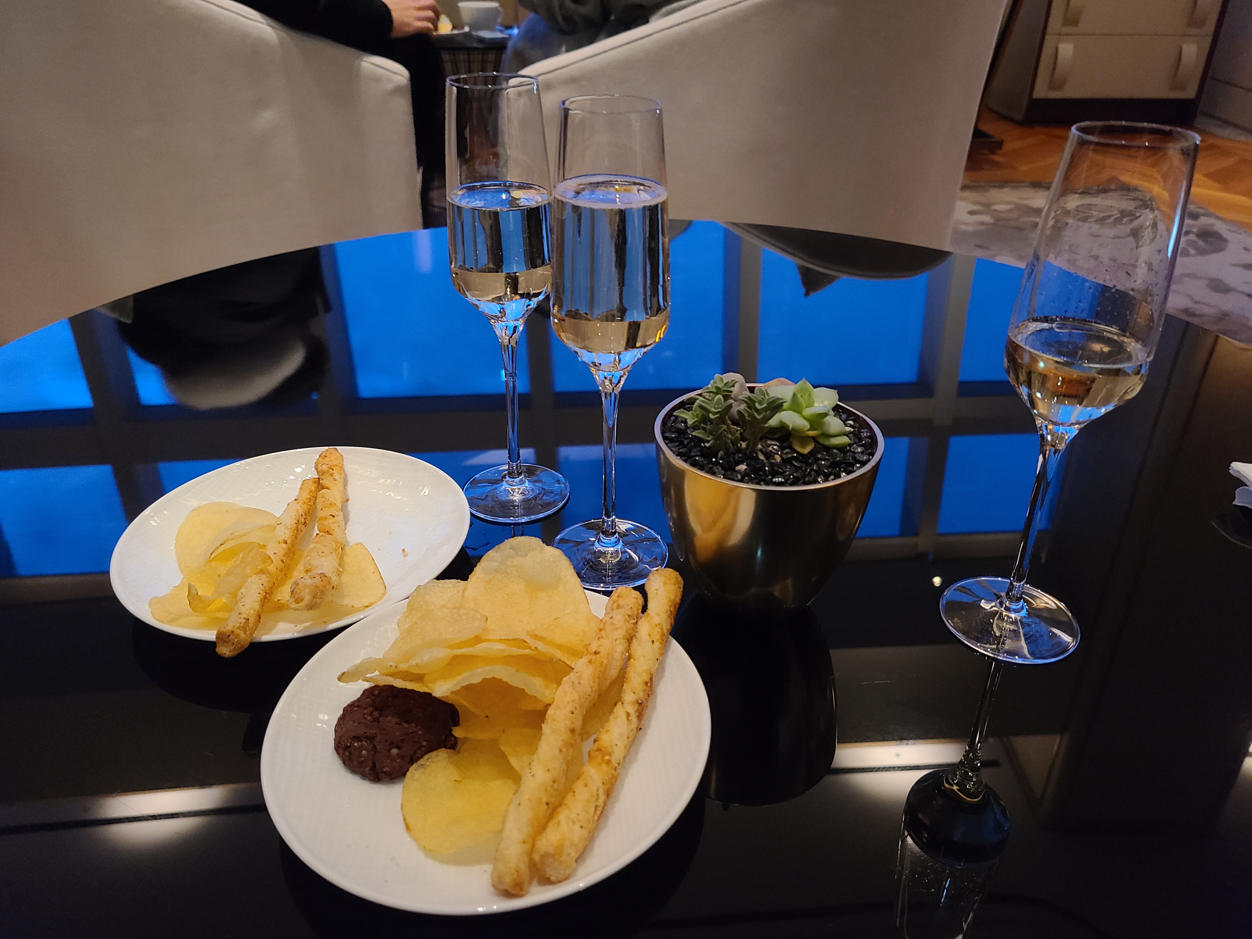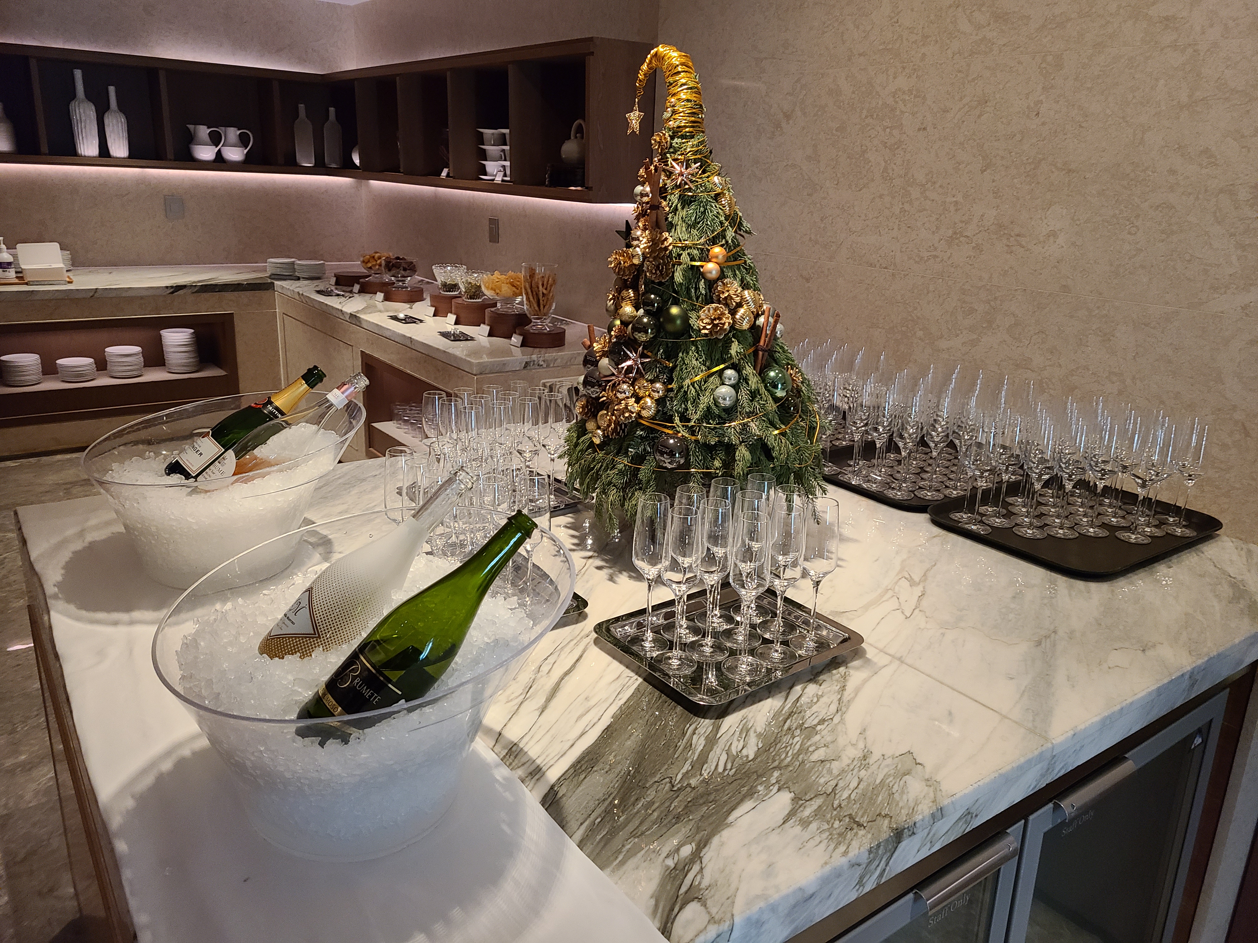 이브닝 라운지는 샴페인이 무제한인데 그러다 보니 사람들이 많았습니다. 저희도 한 10분 정도 대기하다가 들어갔던 거 같아요. 낮에 커피, 음료가 있던 자리엔 샴페인잔과 샴페인으로 대체되었고 쿠키 종류도 더 많아졌네요.