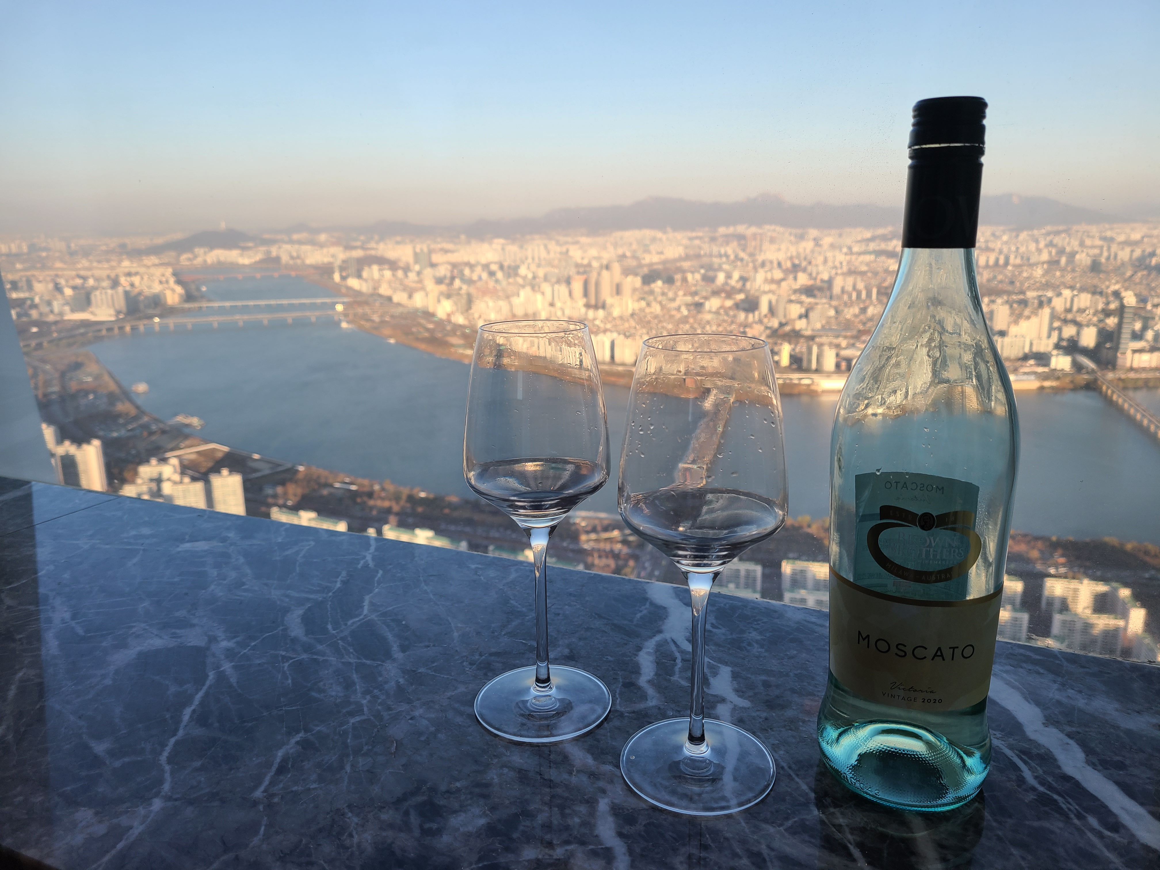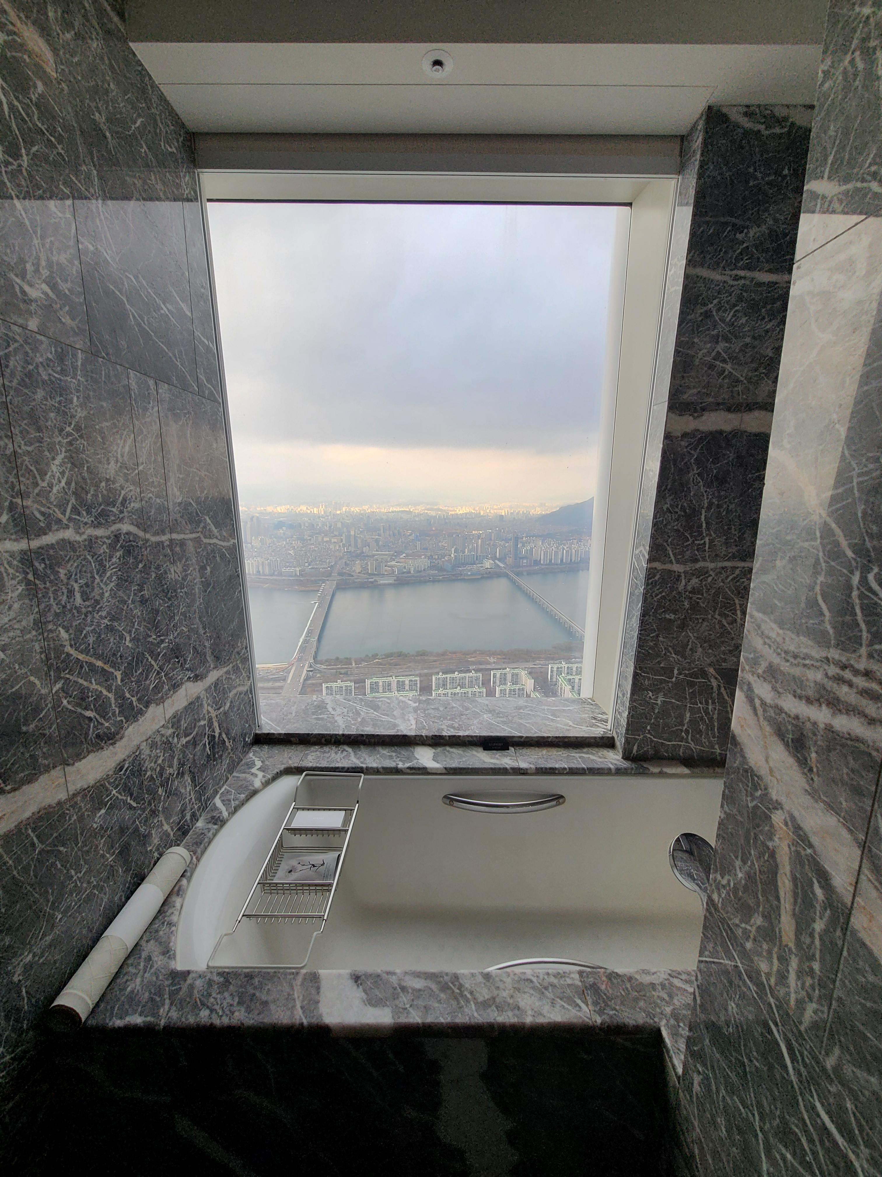 그리고 욕조뷰!! 아 이건 킹정이죠. 욕조가 조금 작긴 했지만 뷰를 즐기기엔 충분했습니다. 창문 바로 앞에는 공간이 조금 있어서 와인잔, 스마트폰을 올려놓기에도 좋았어요.