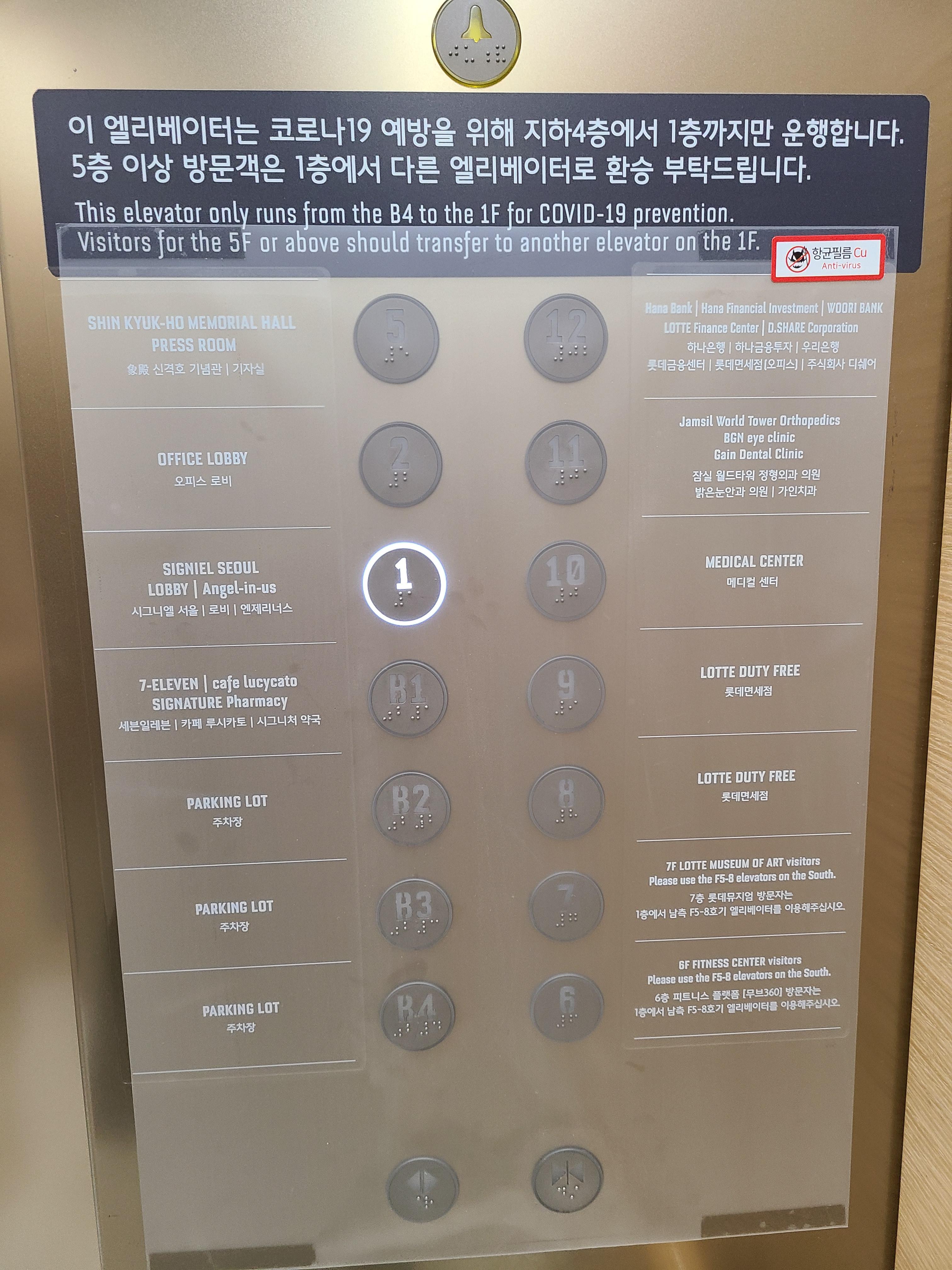 코로나 때문인지 고층건물이라 그런지 모르겠지만 엘리베이터를 2번 갈아타야 로비까지 갈 수 있고 여기서 1번 더 타야 객실까지 갈 수 있었어요. 시그니엘 레지던스 사시는 분들 후기 보면 3번 갈아타서 내려온다 하시던데 이런 건가 짐작만 해봅니다.